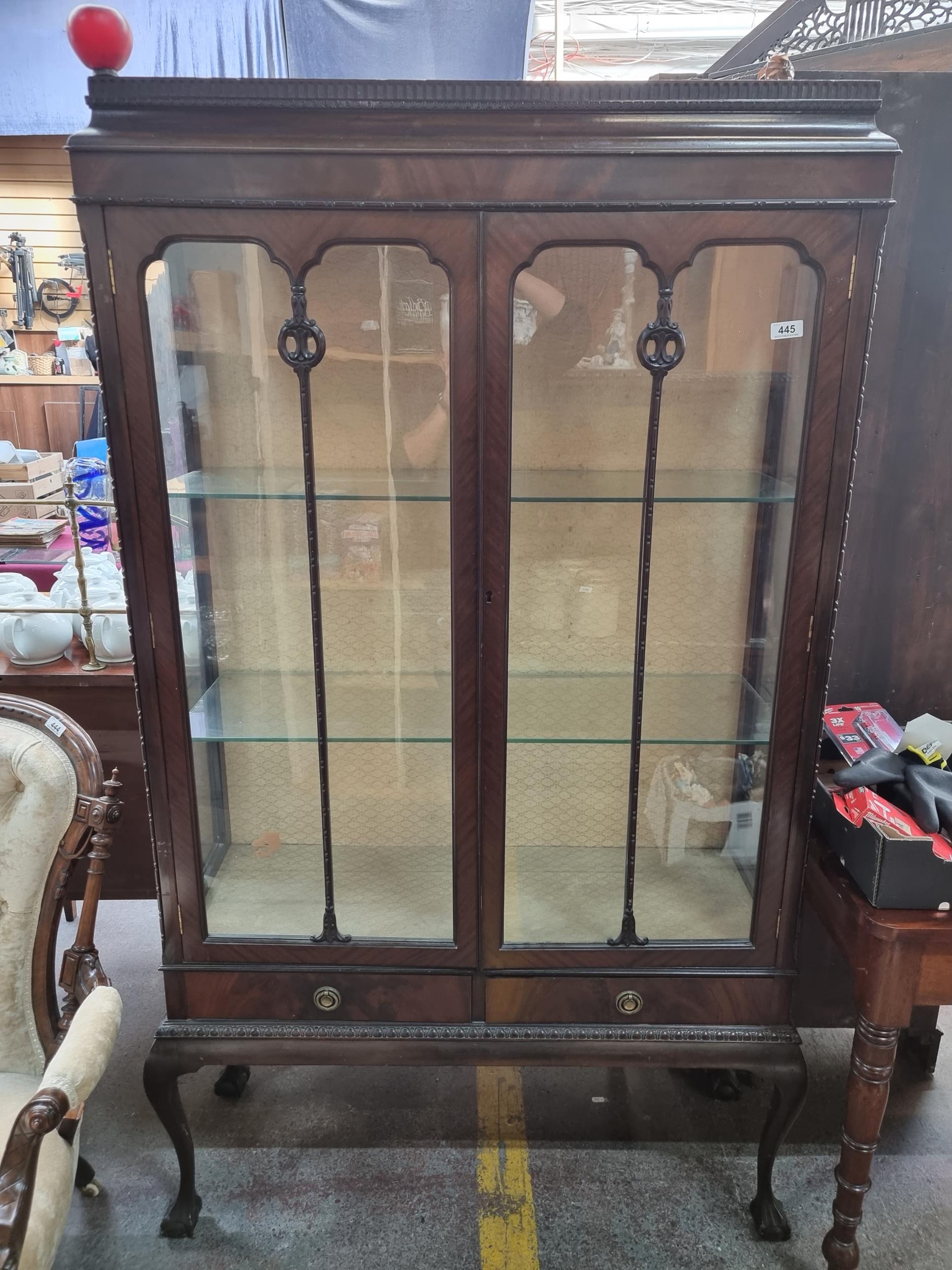 A fabulous Edwardian Boulle glass-fronted display cabinet with two additional glass shelves, two neatly sized pullout drawers with brass handles, and beautiful claw-and-ball feet. Dimensions: H 177cm W 99cm D 33cm