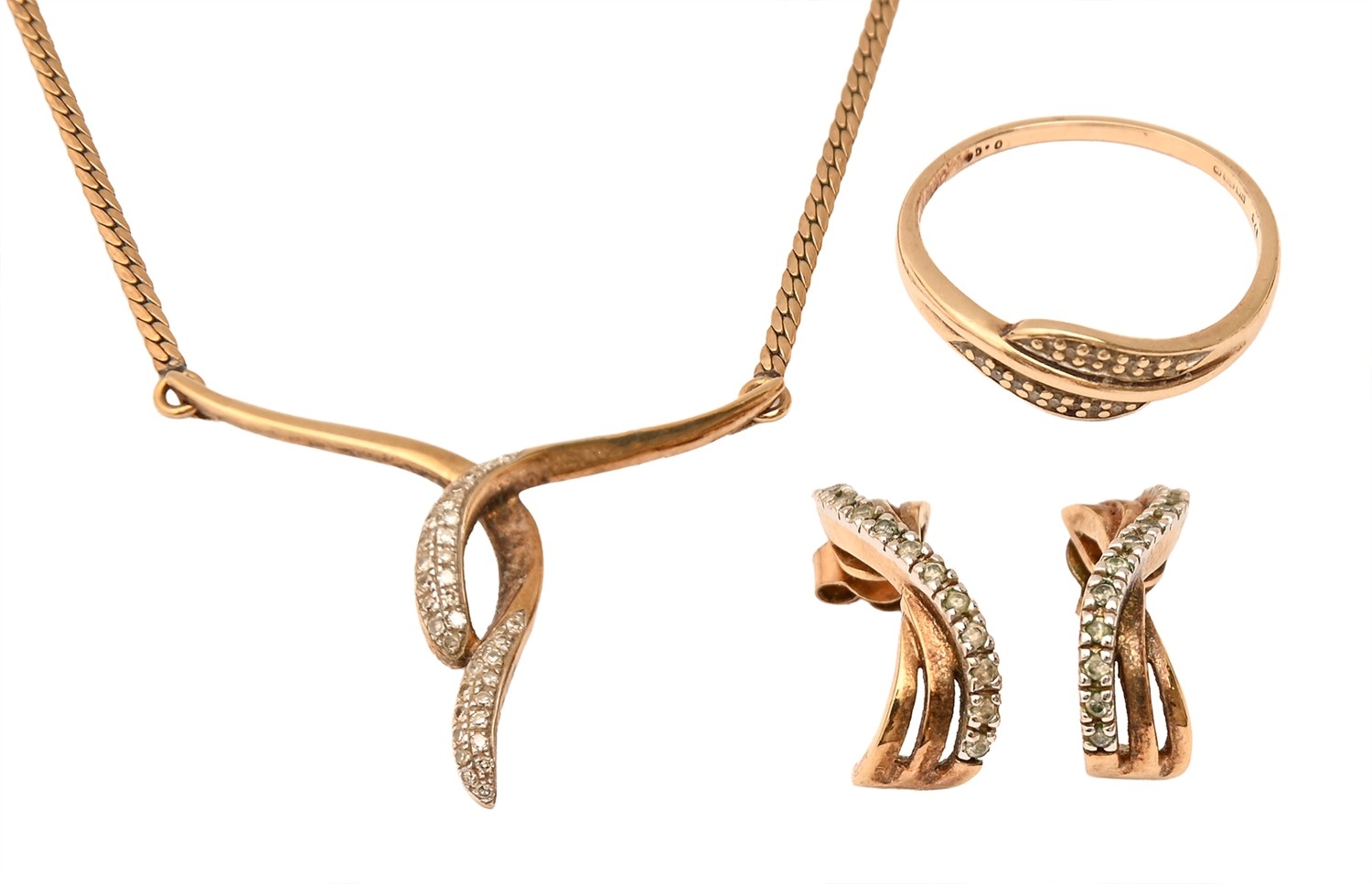 A diamond necklet, ring and earrings, in 9ct gold, necklet 45cm l, 12g