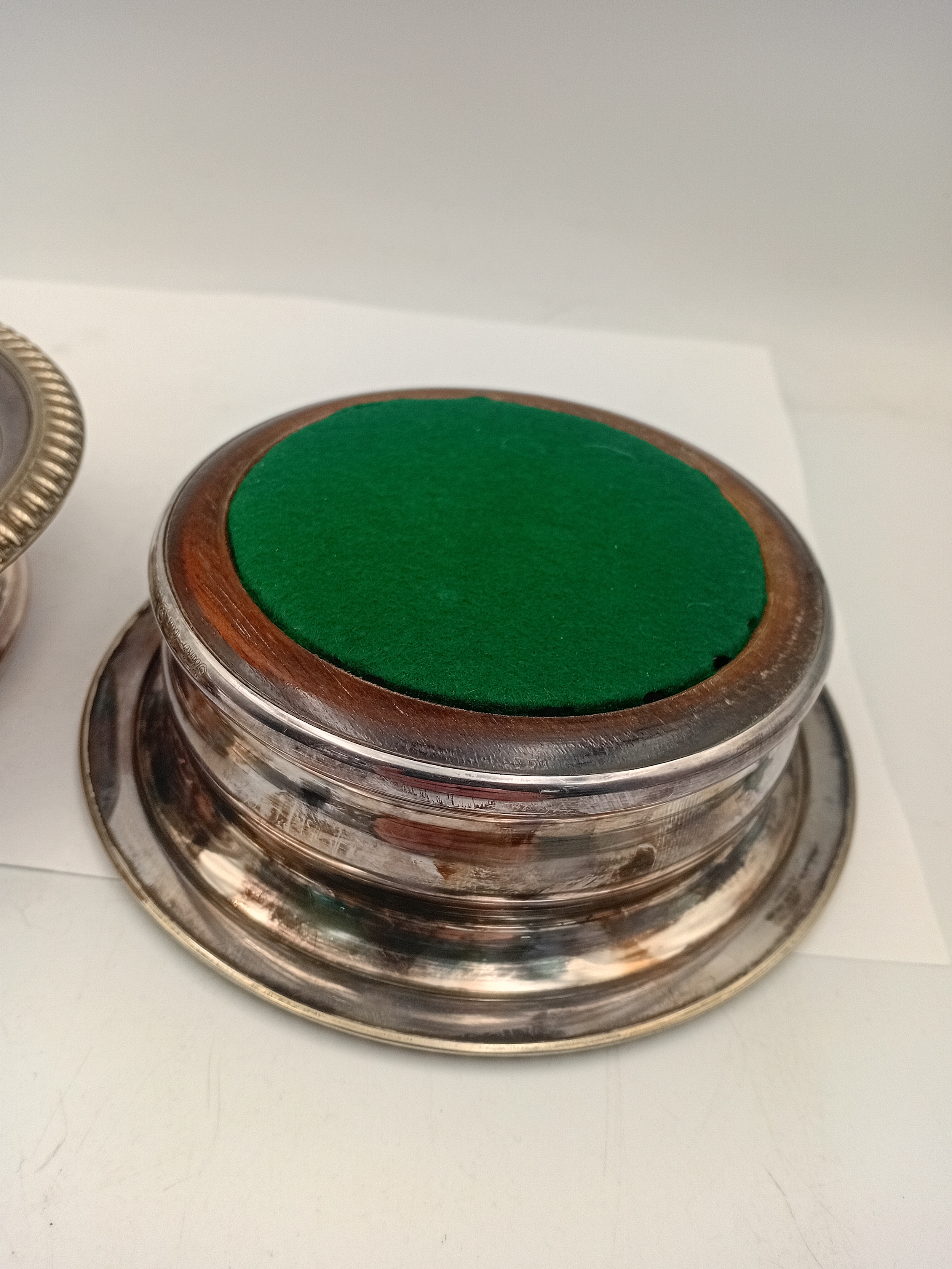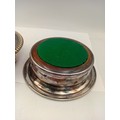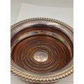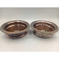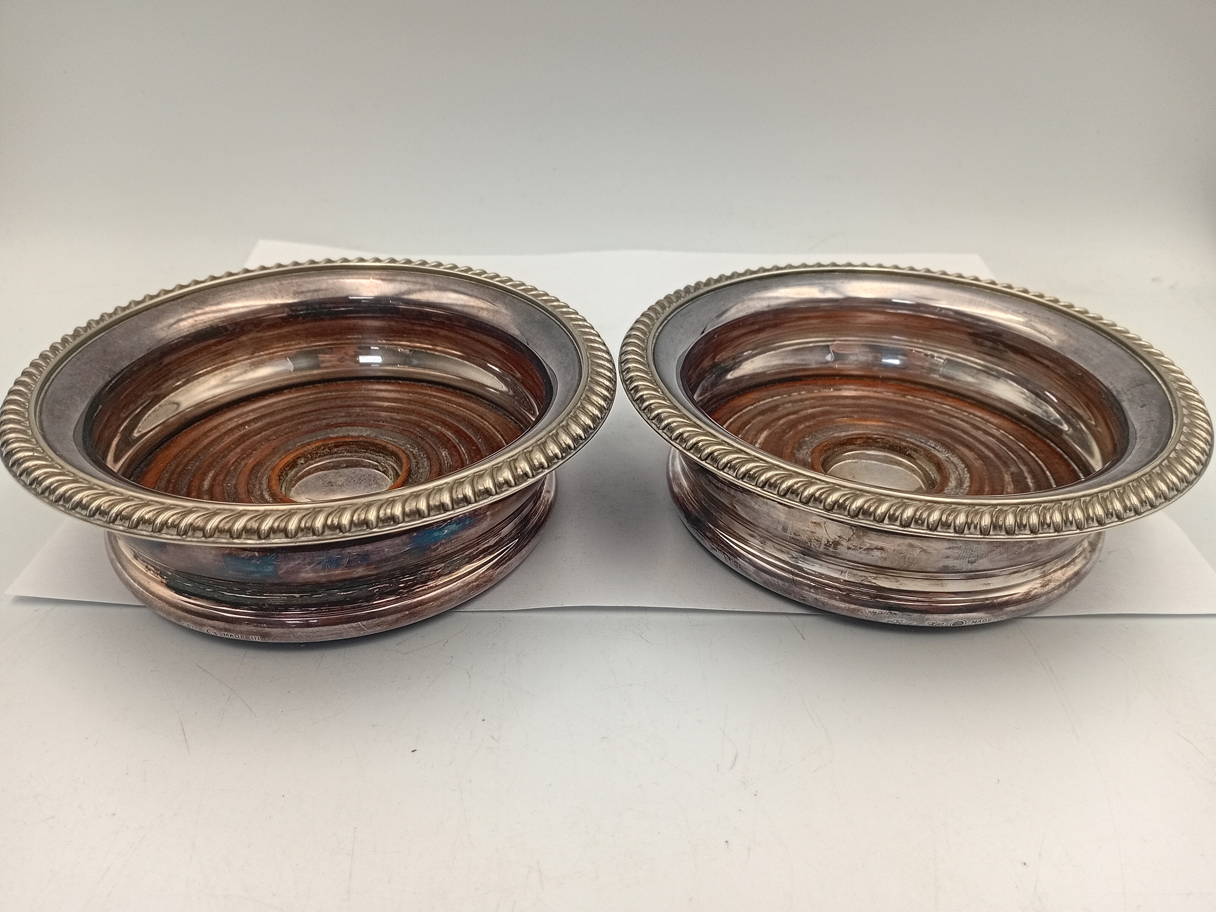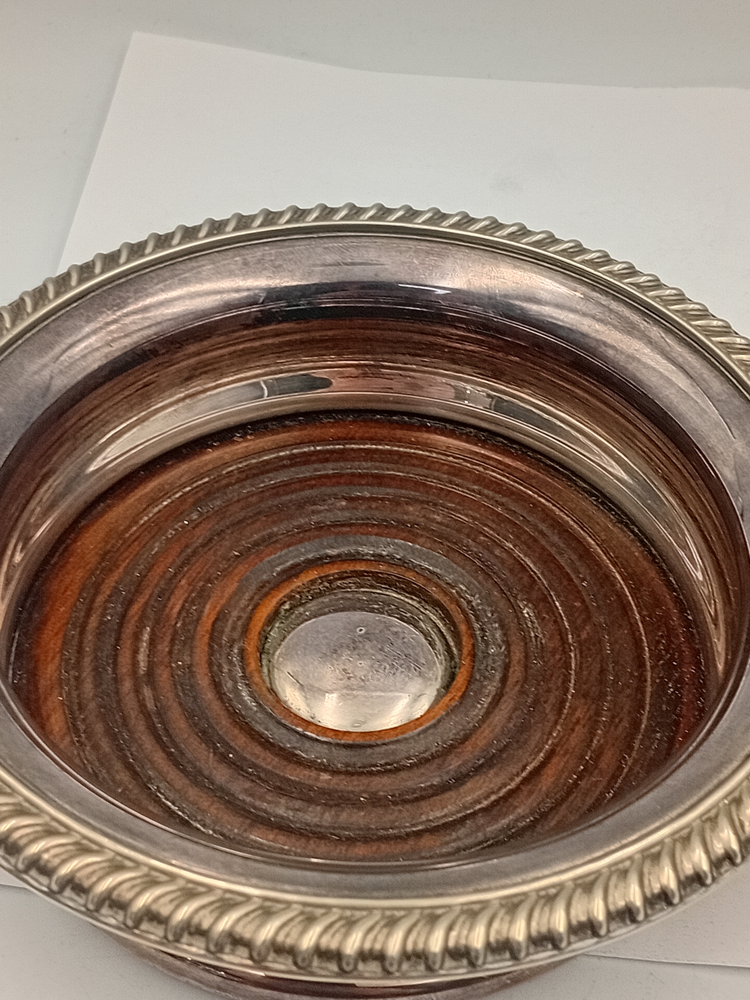 A pair of antique Barker Ellis silver plate and wood wine coasters.