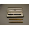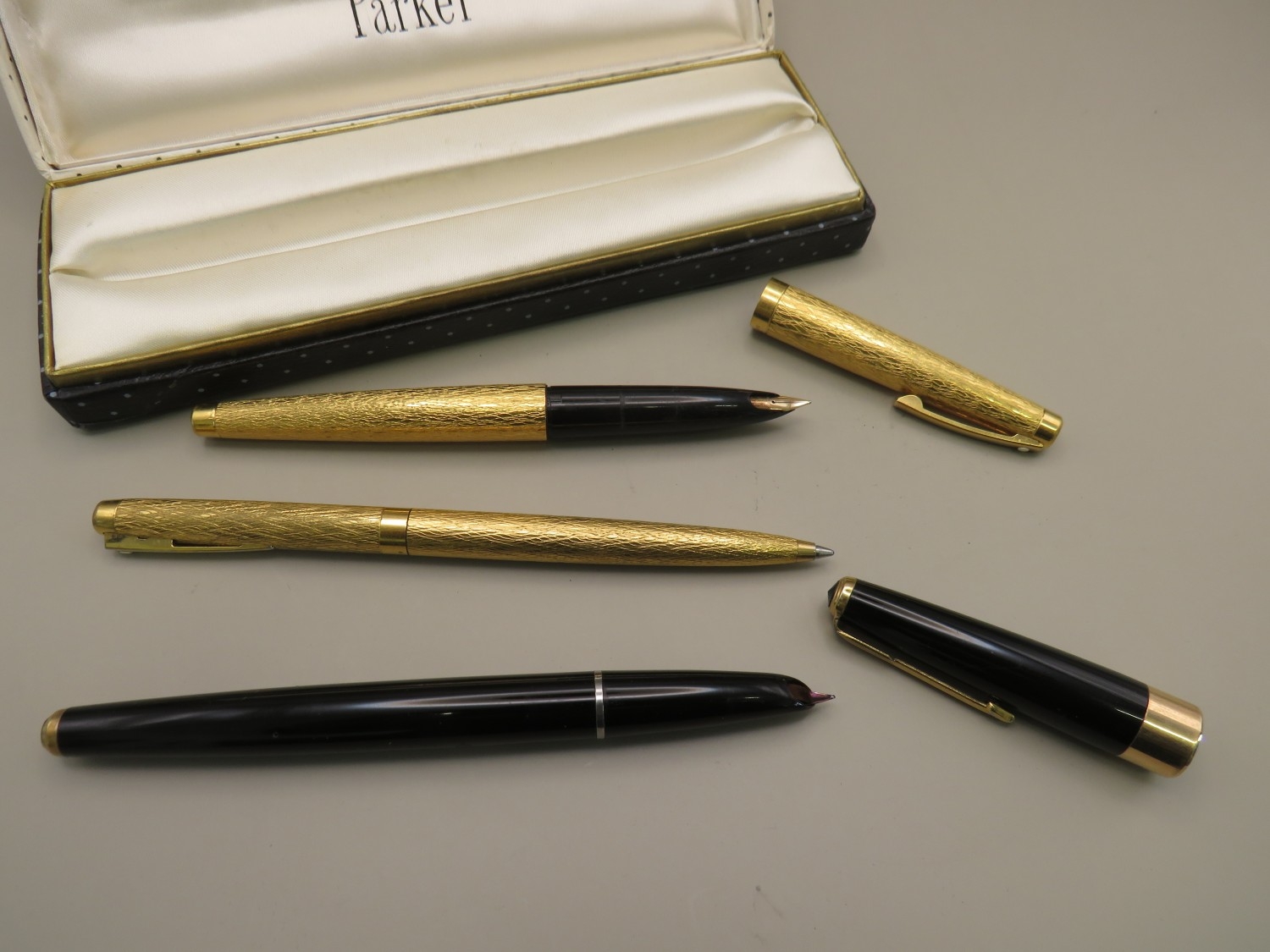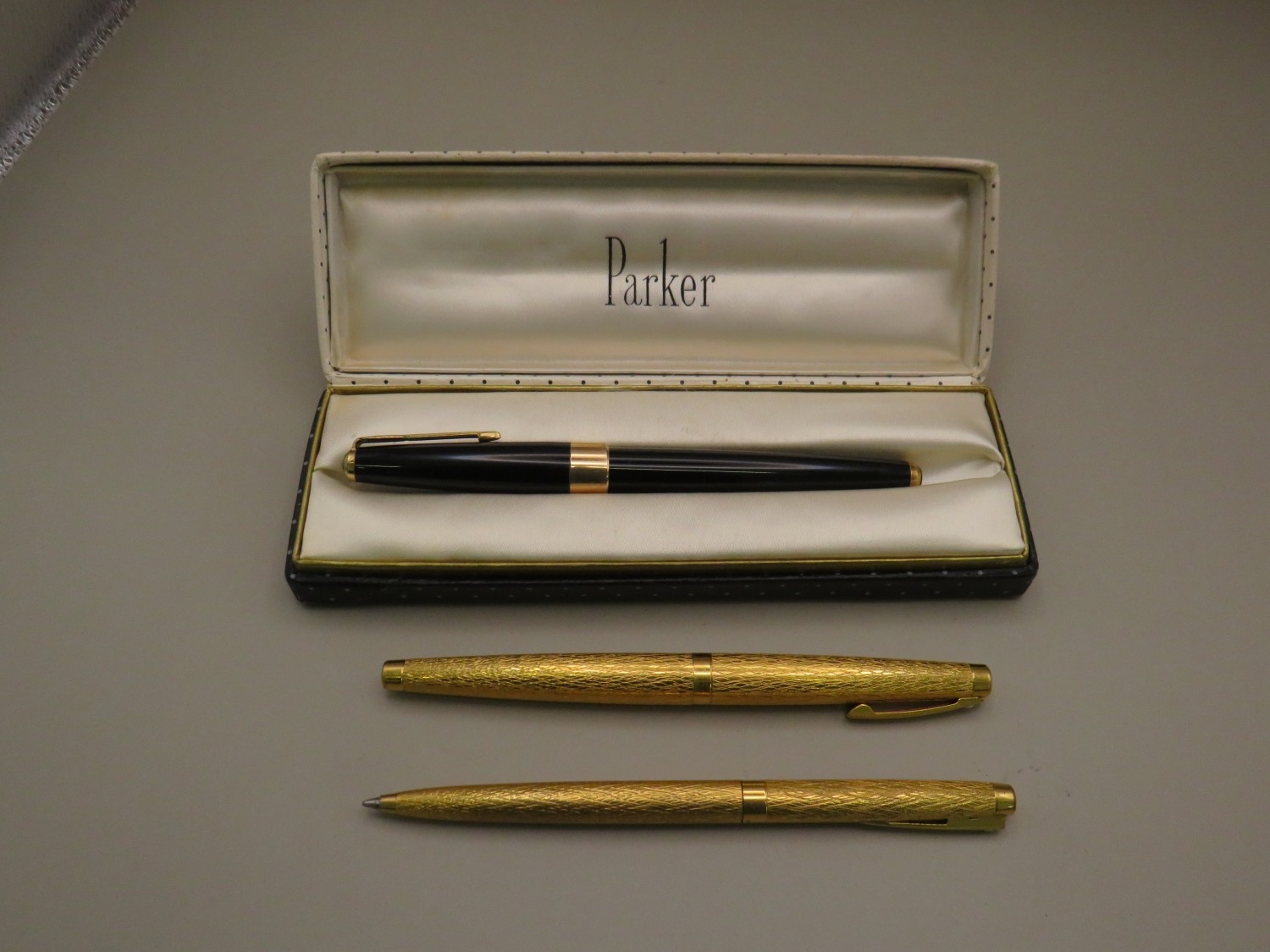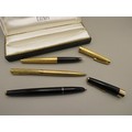 Boxed Parker pen and two other gold tone pens
