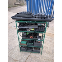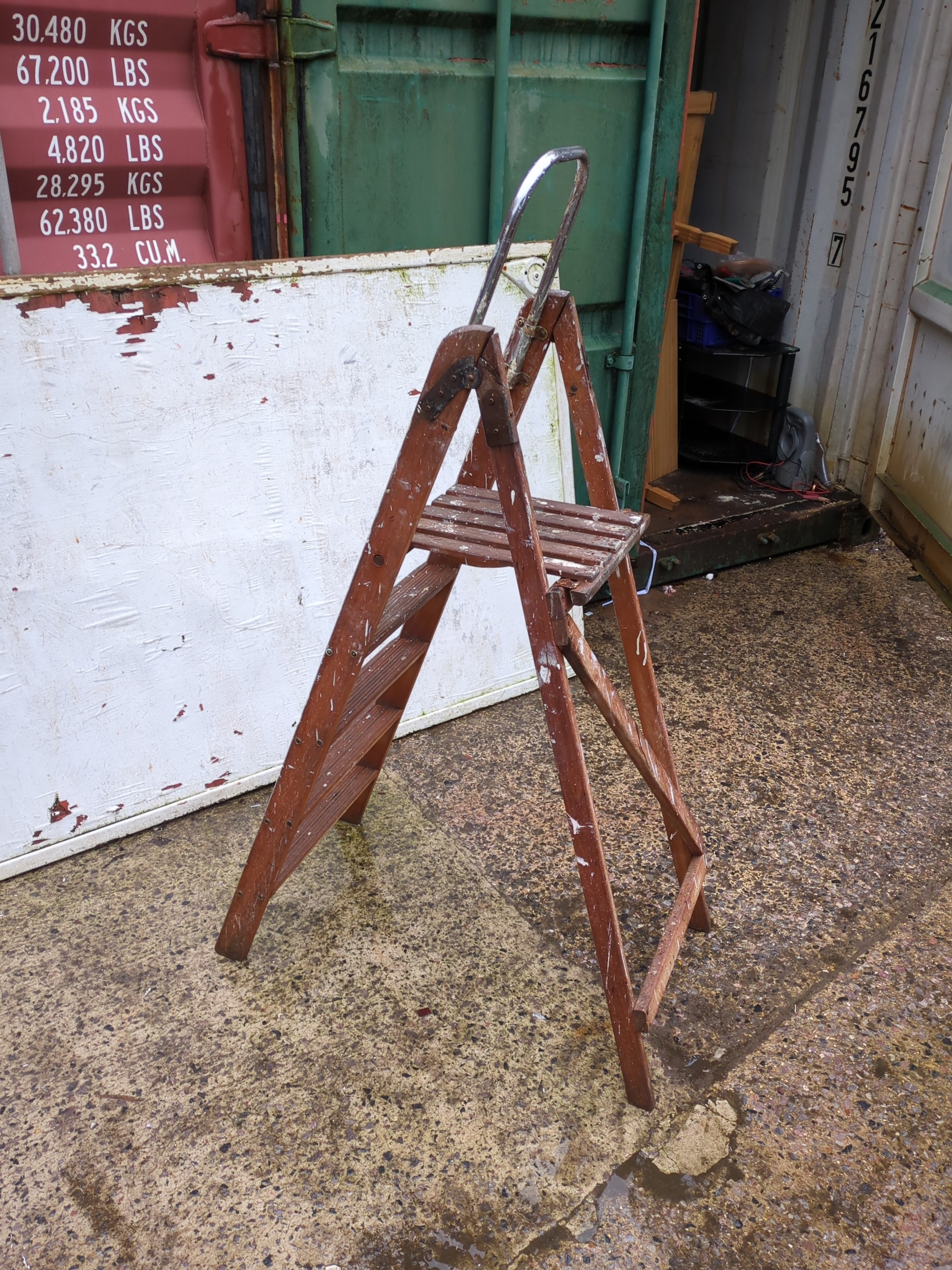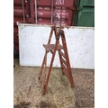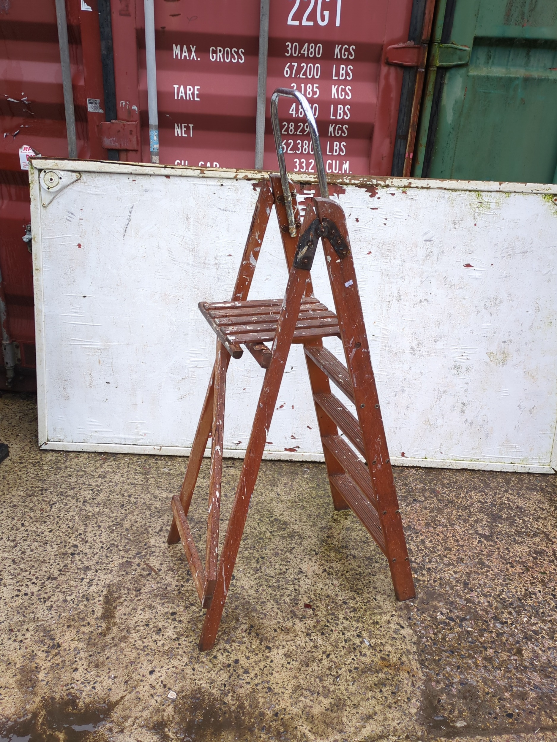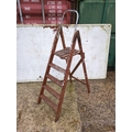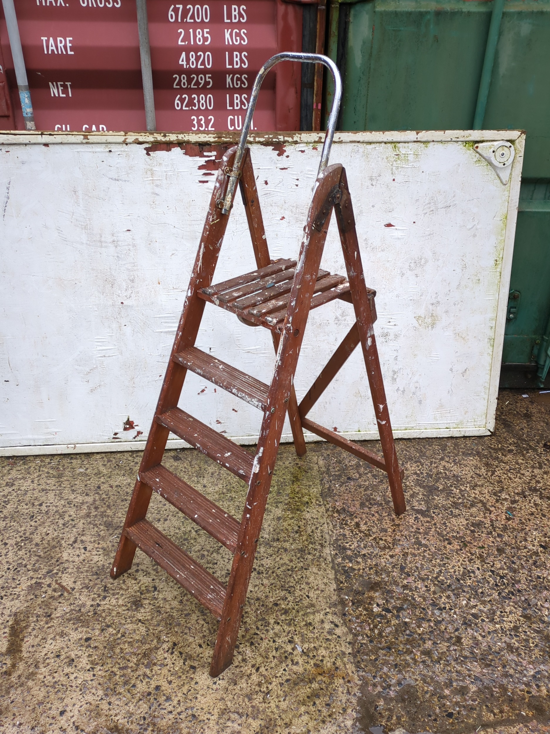 This is a vintage folding ladder constructed from wood with a sturdy metal handle at the top. Its design is compact, allowing for easy storage and portability. The ladder features five rungs, suitable for various outdoor tasks or home maintenance needs.