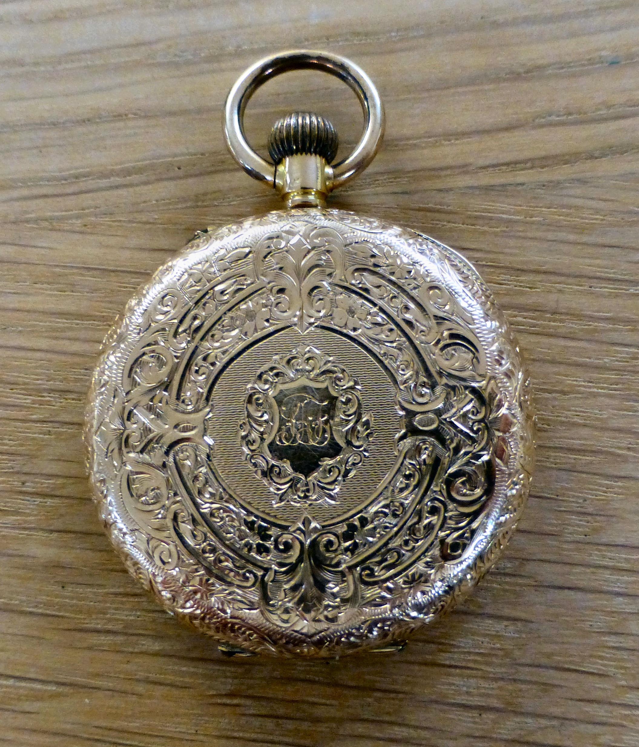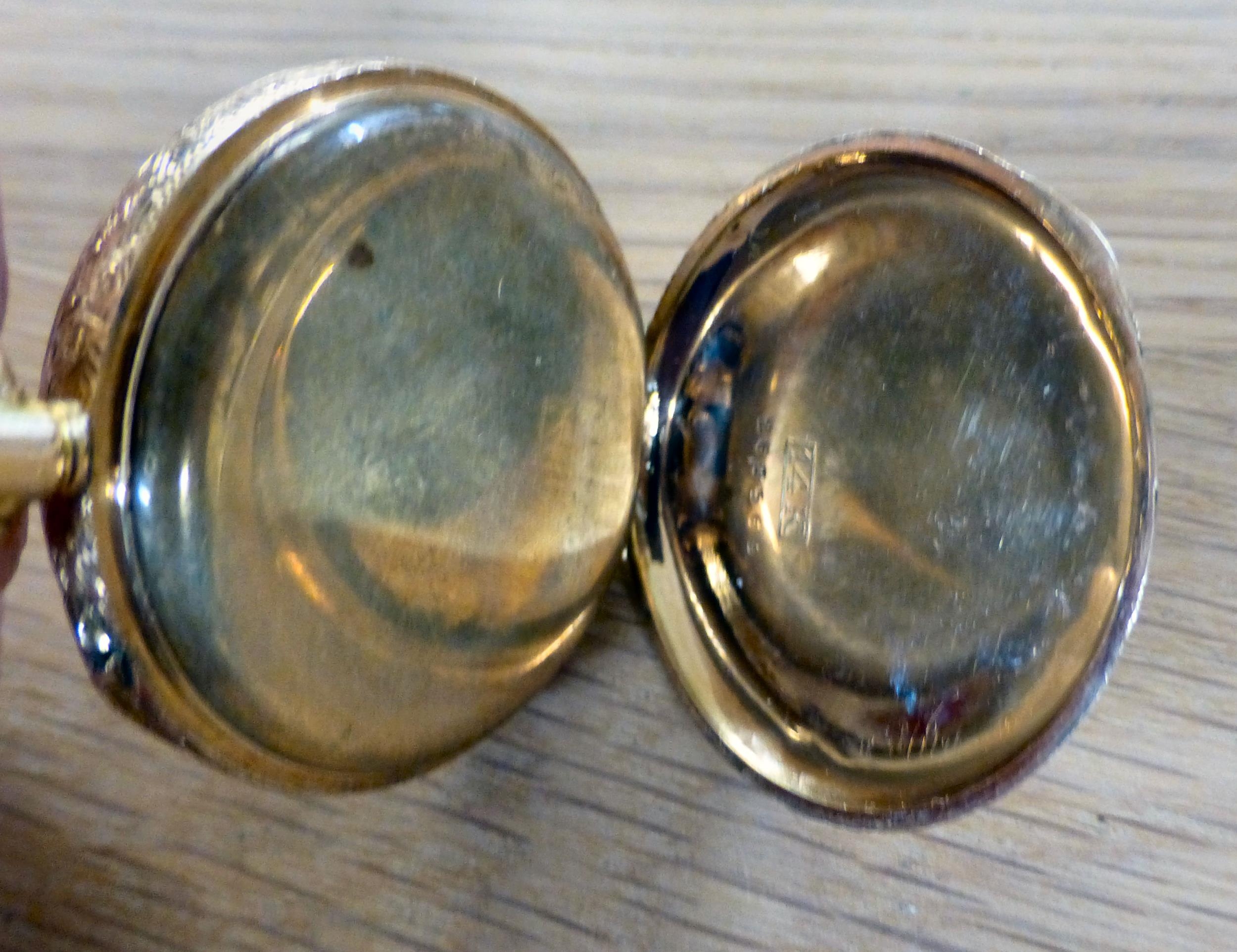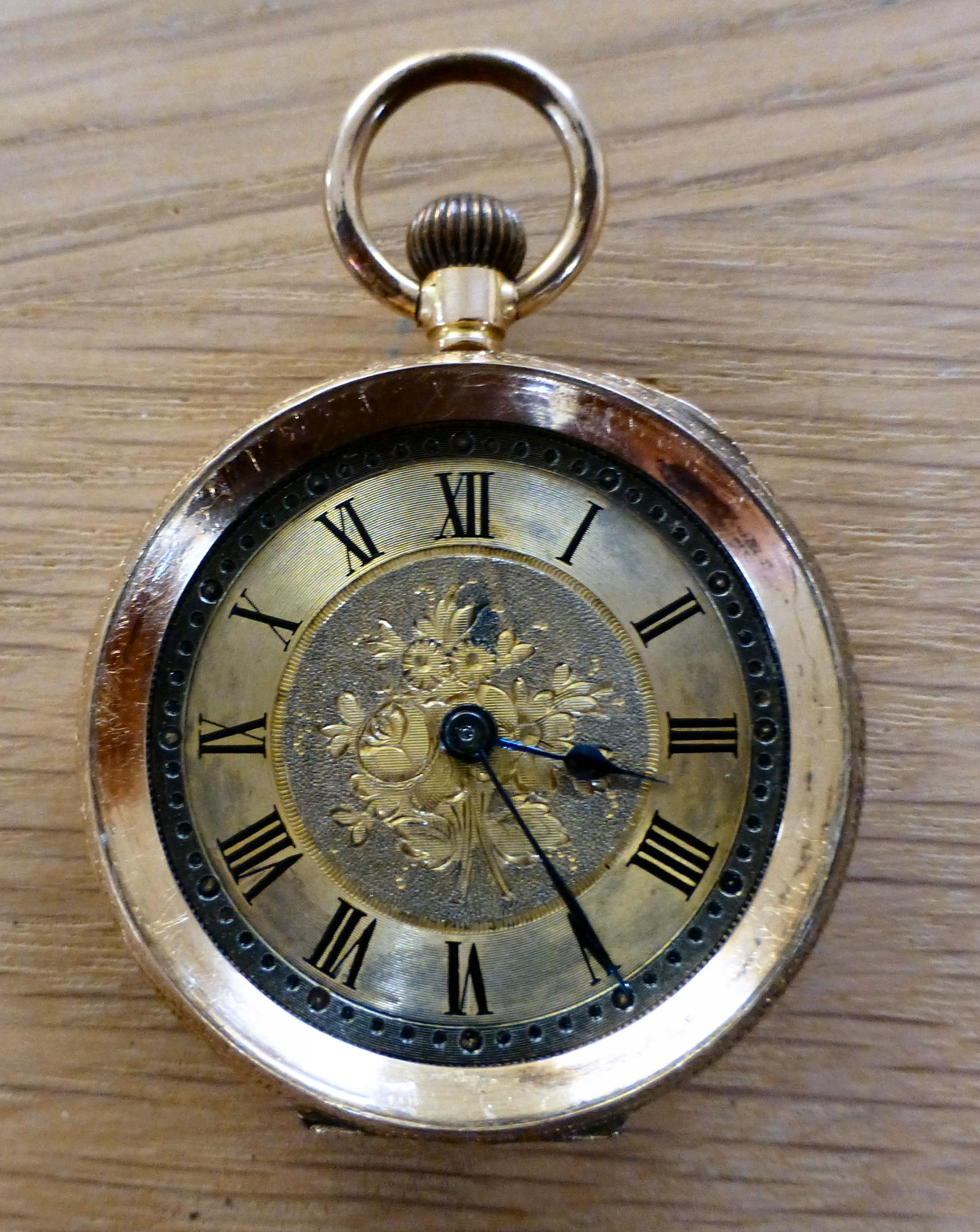 A late Victorian yellow metal cased fob watch stamped 14k, faced by a Roman dial (dust cover is brass) (approx. gross weight 24 grams)
