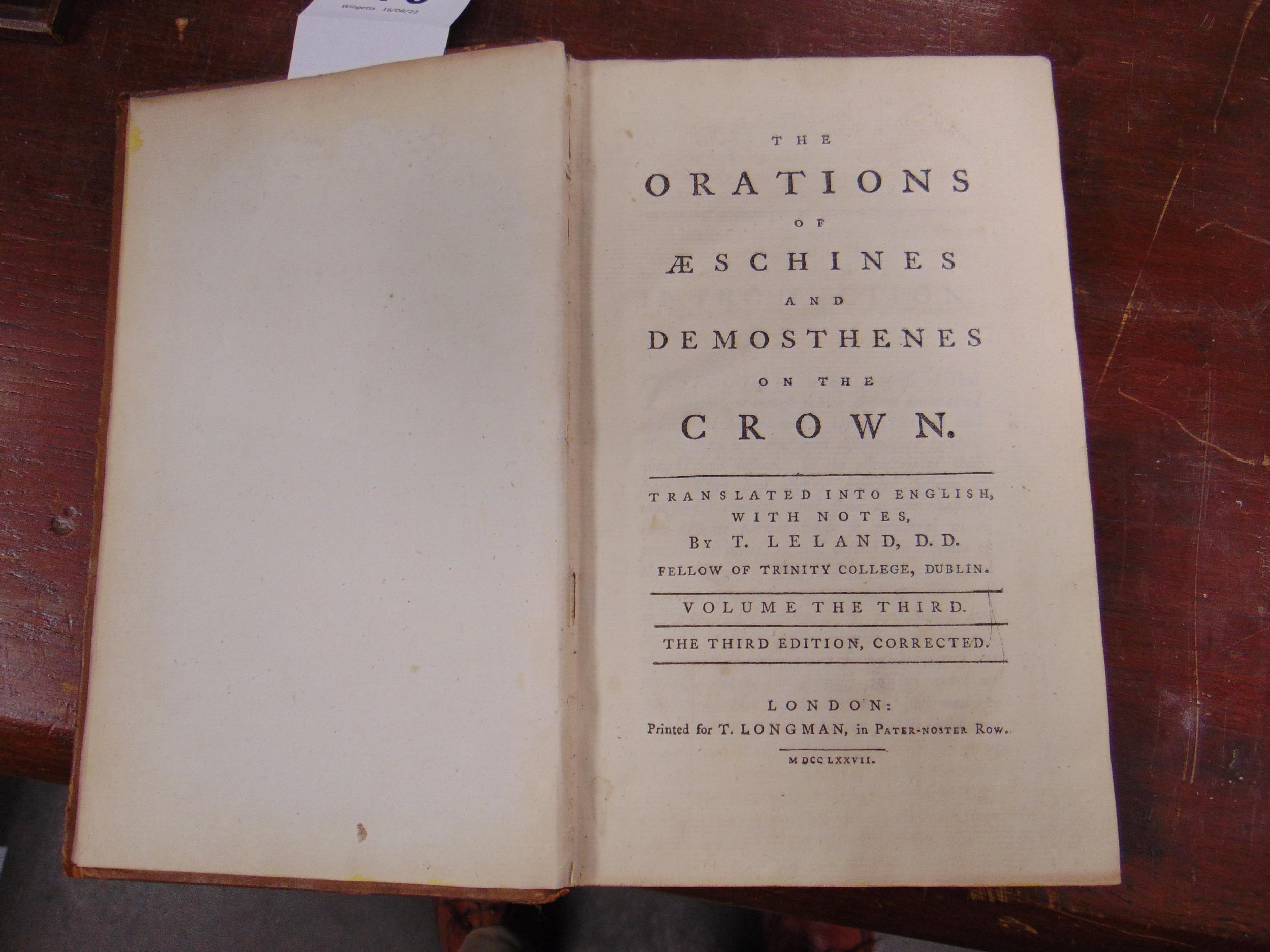 T. Leland, Orations of Aeschines, published 1777.