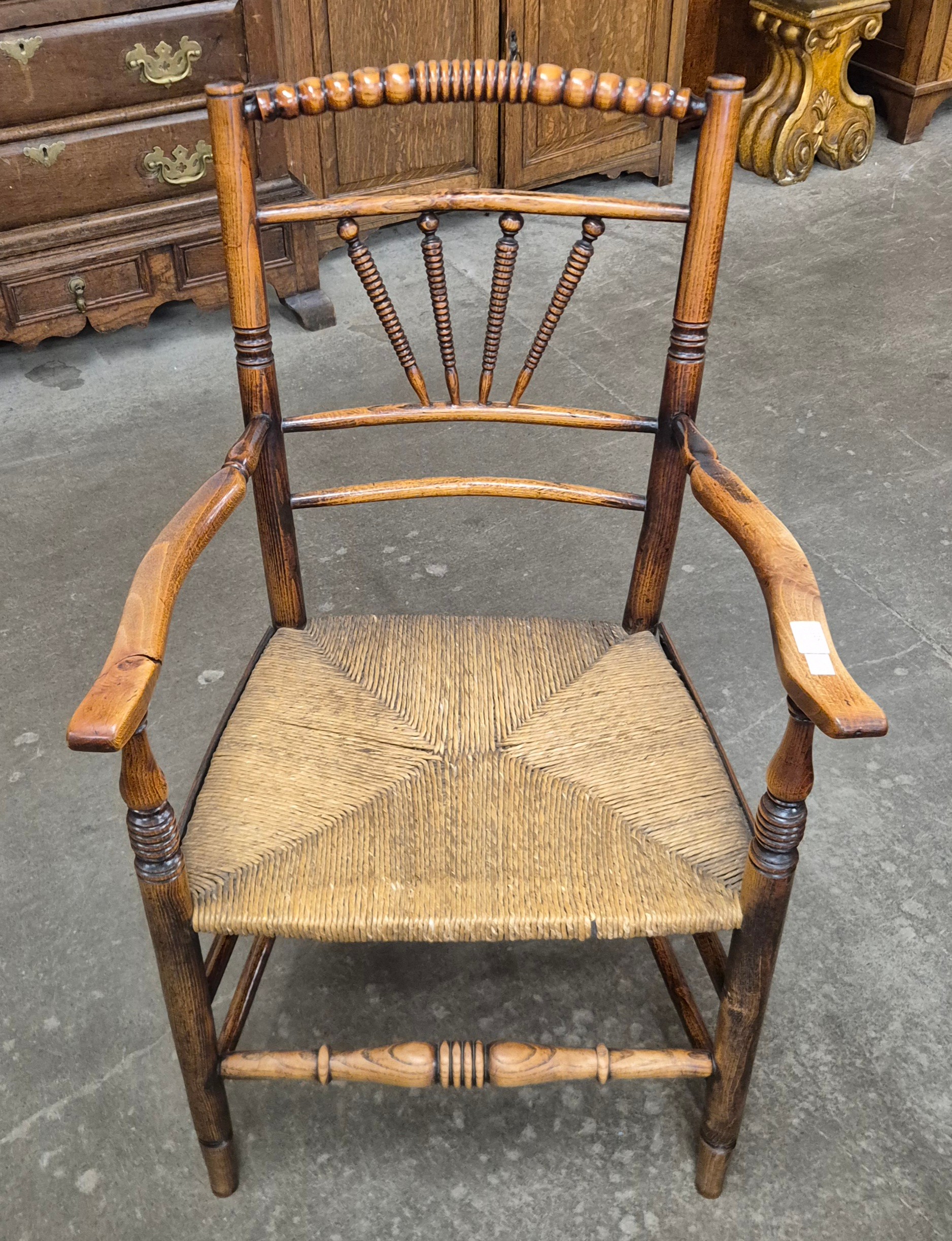 A George III elm and fruitwood spindle back elbow chair
