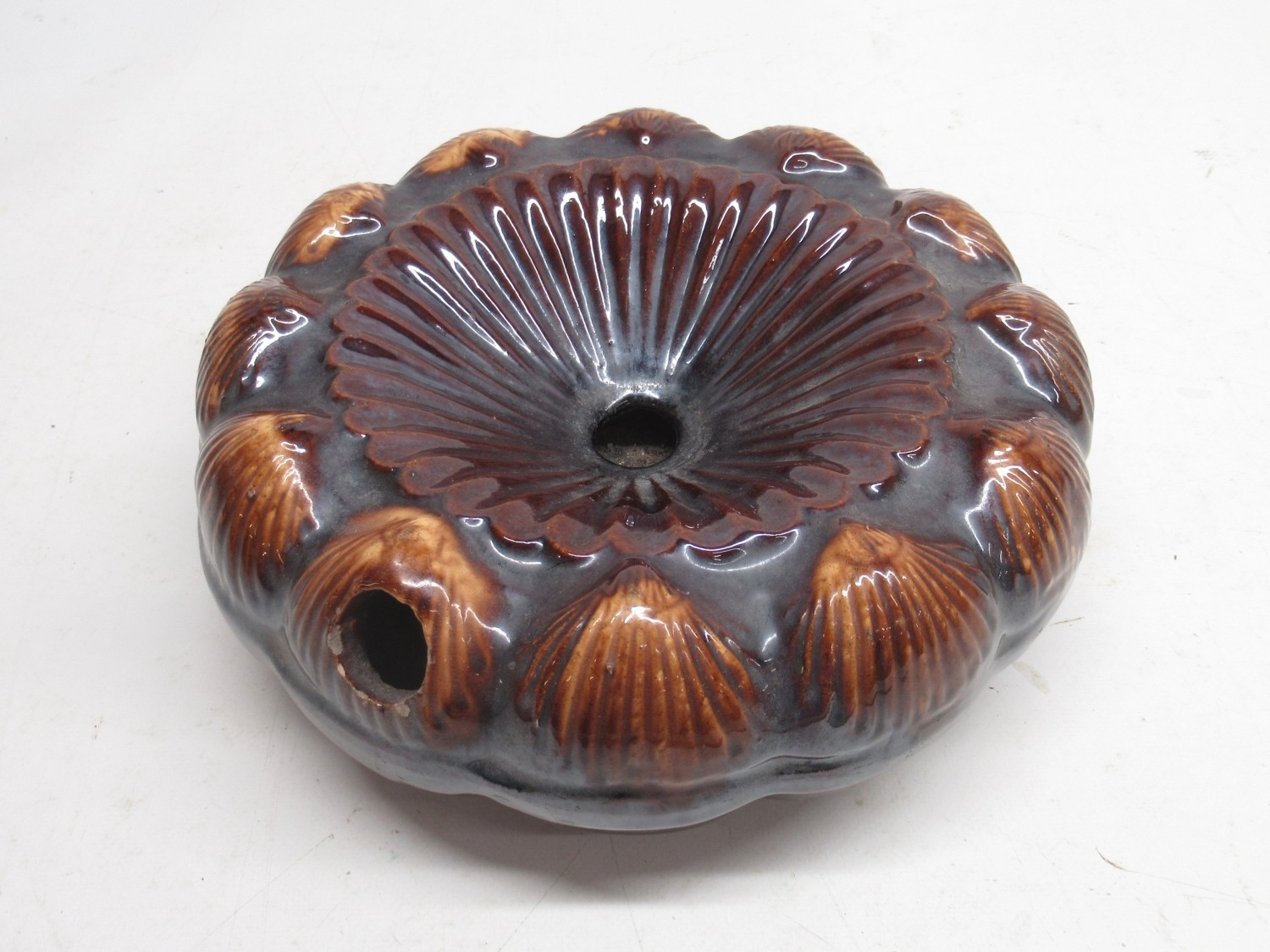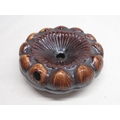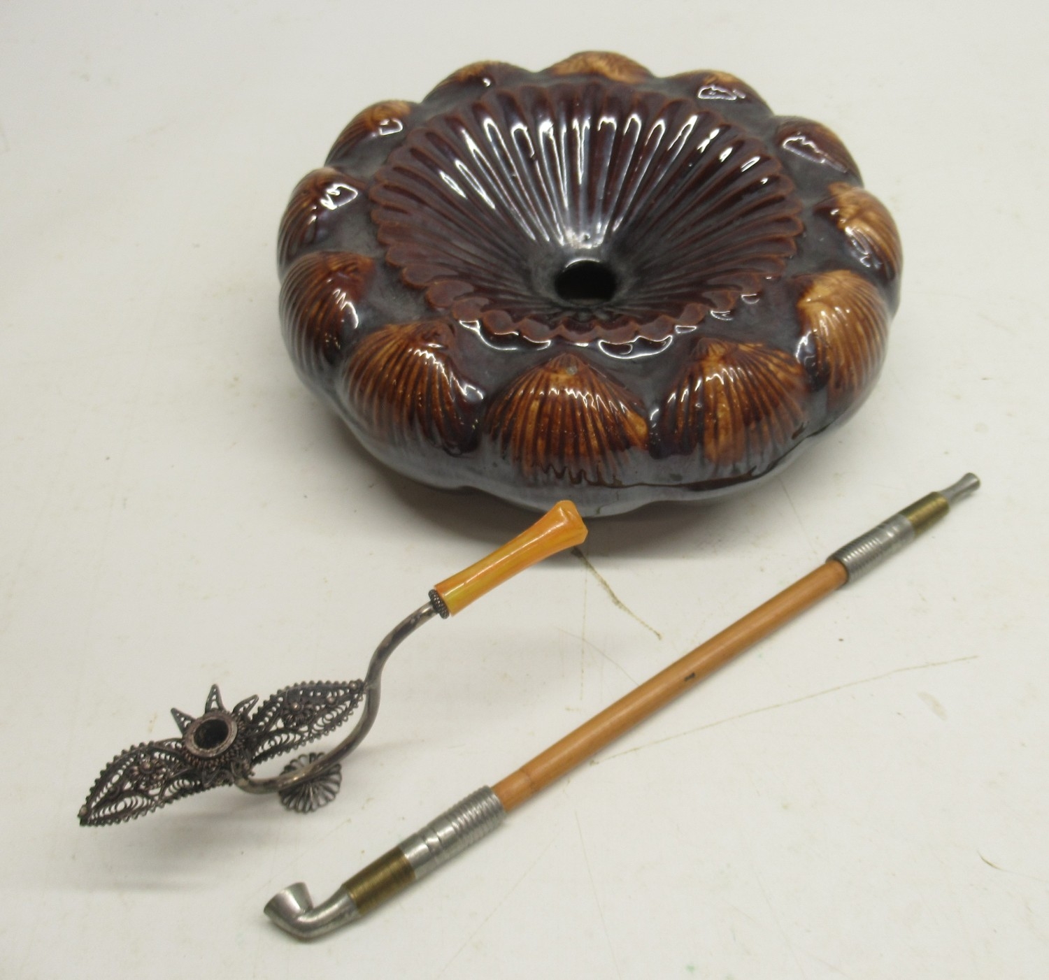 20th Century bamboo and metal mounted opium pipe, L24cm, 20th Century white metal filigree opium pipe, faux amber mouthpiece, L13cm and late 19th Century treacle glazed spittoon, shell moulded design, D21cm