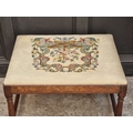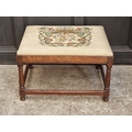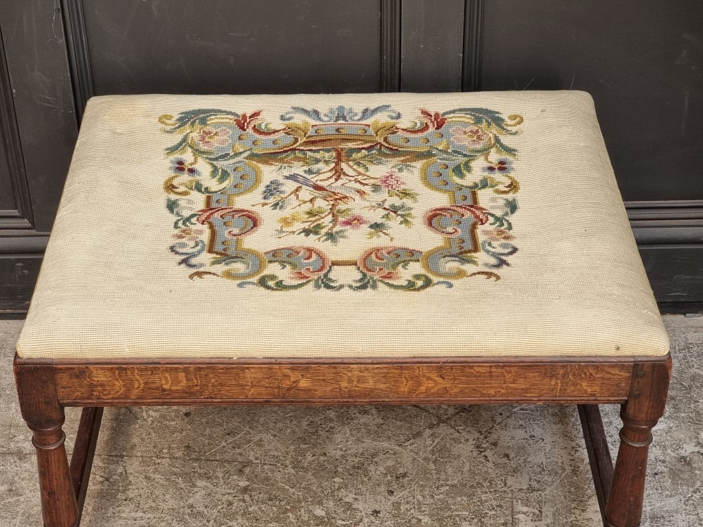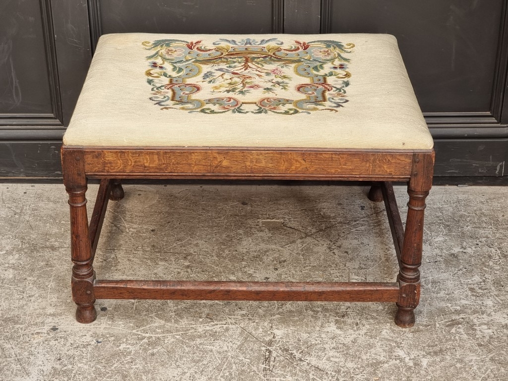 An antique oak and upholstered stool, 76 x 60.5cm.