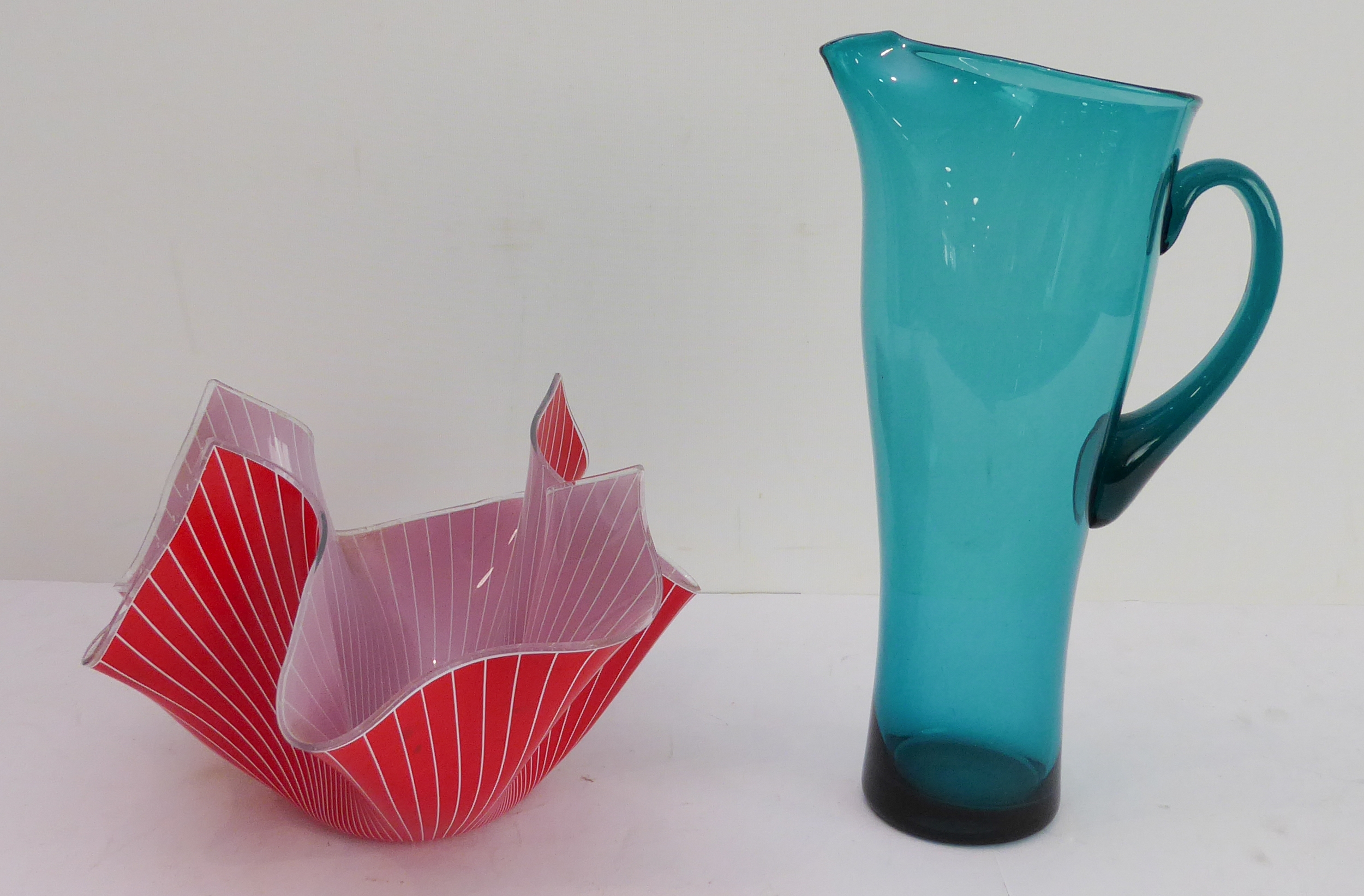 A 1950s to 1960s red-and-white striped handkerchief vase. Together with a handmade, tall and tapering, ocean-blue jug (probably same period). (2)