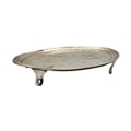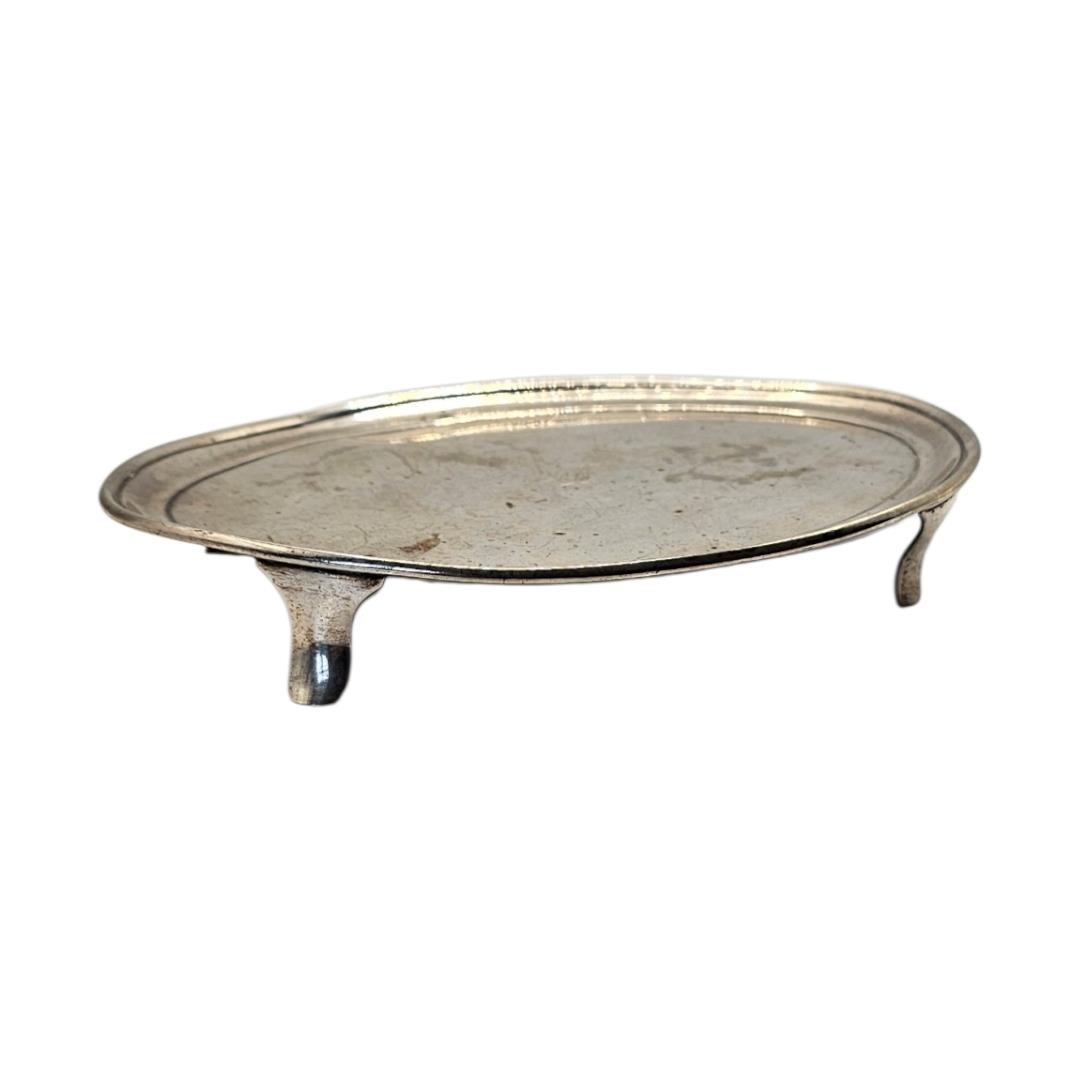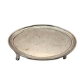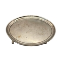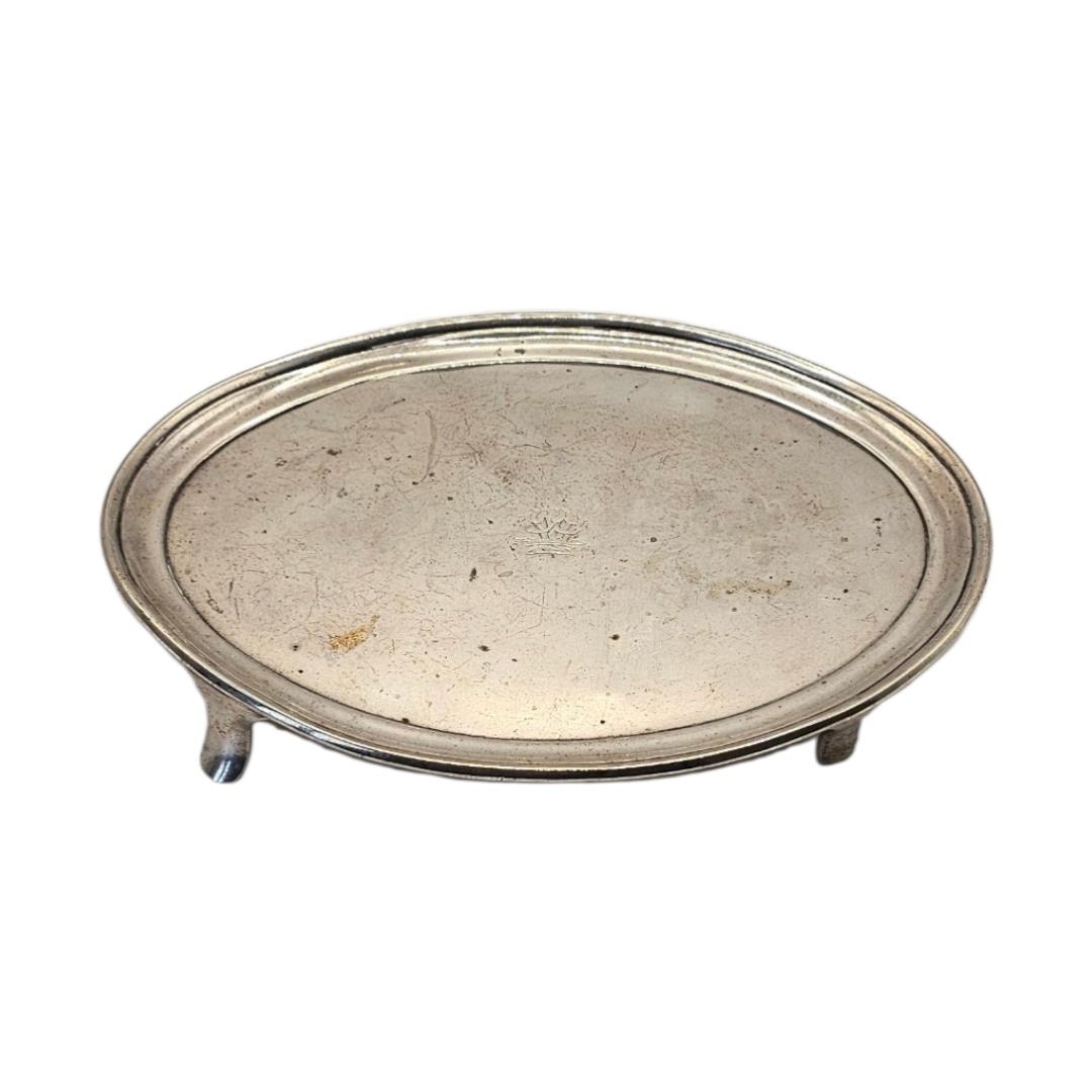 Hallmarked Dublin, 1806, oval form with central engraved family crest depicting ostrich feathers plume and laurel, raised on four plain feet.