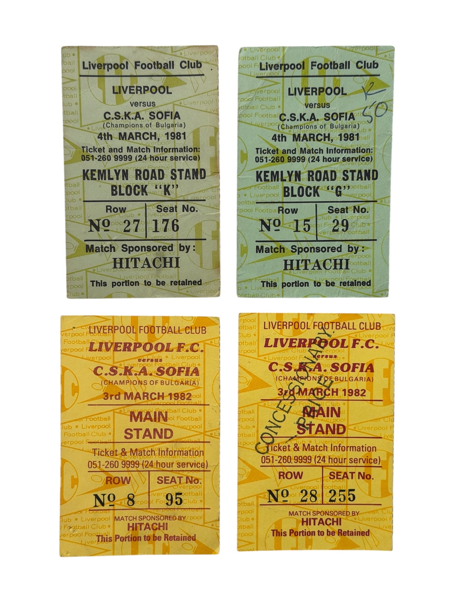 X4 LIVERPOOL VERSUS CSKA SOFIA 1980s EUROPEAN FOOTBALL TICKET STUBS, 4/3/1981 x2, 3/3/1982 x2.