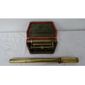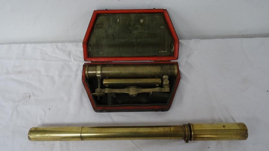 Brass theodolite telescope, 9cm long, in red morocco case and a brass cylindrical sight (2)
