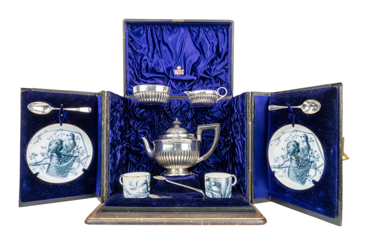 [d] A pair of Pierre Mallet design Brown Westhead and Moore Potteries blue Ornithology coffee cups and saucers