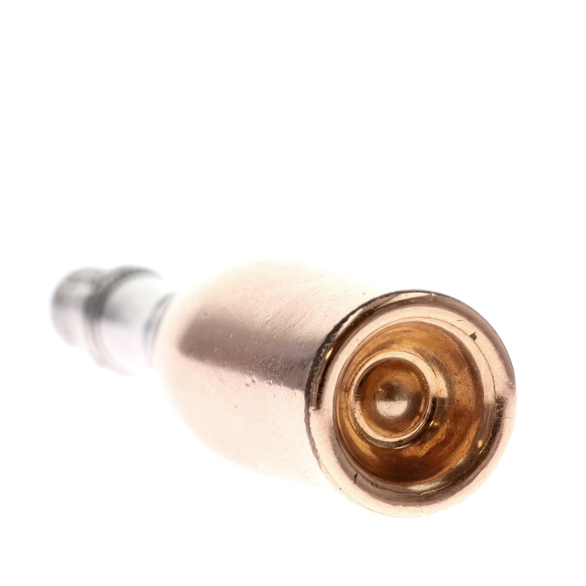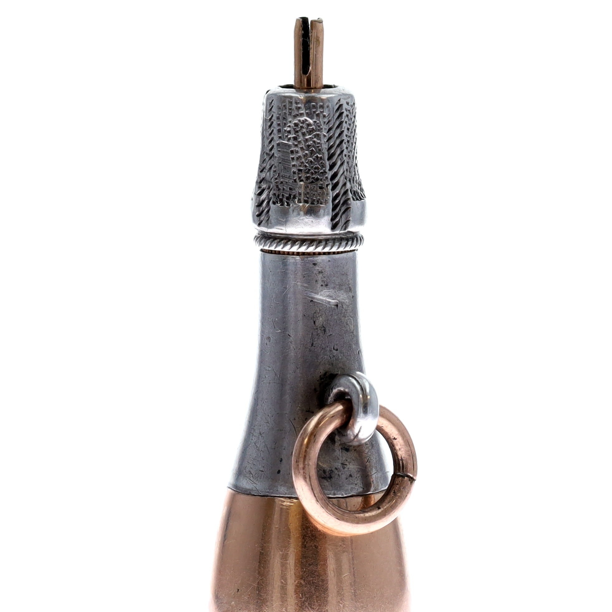 Antique Silver and Rolled Gold Pencil Pendant. Pencil is inside the bottle. Measures approx. 5.2 x 1.2cm. Has been tested to .925 sterling silver and rolled gold. Plate wear to the base, the pencil is not working, parts are missing. Weighs in total 12.9g