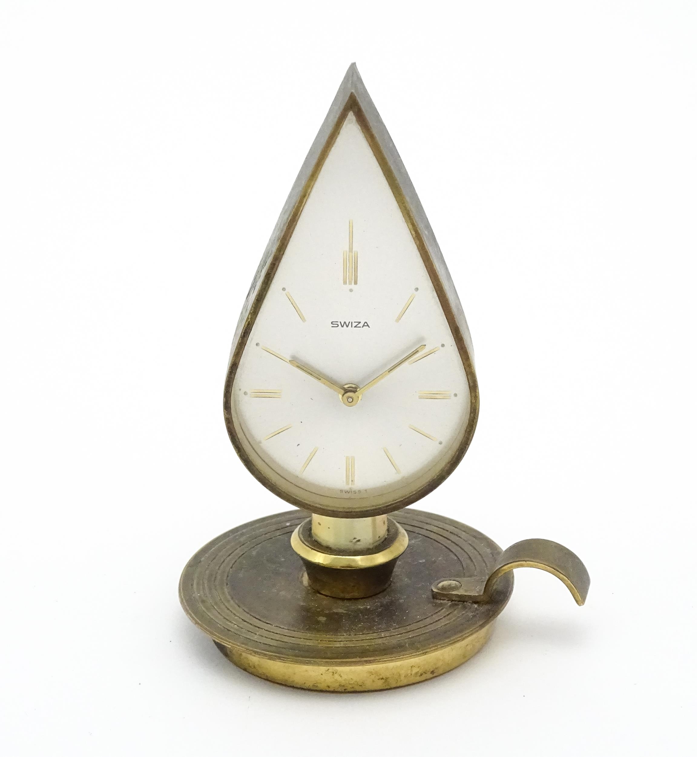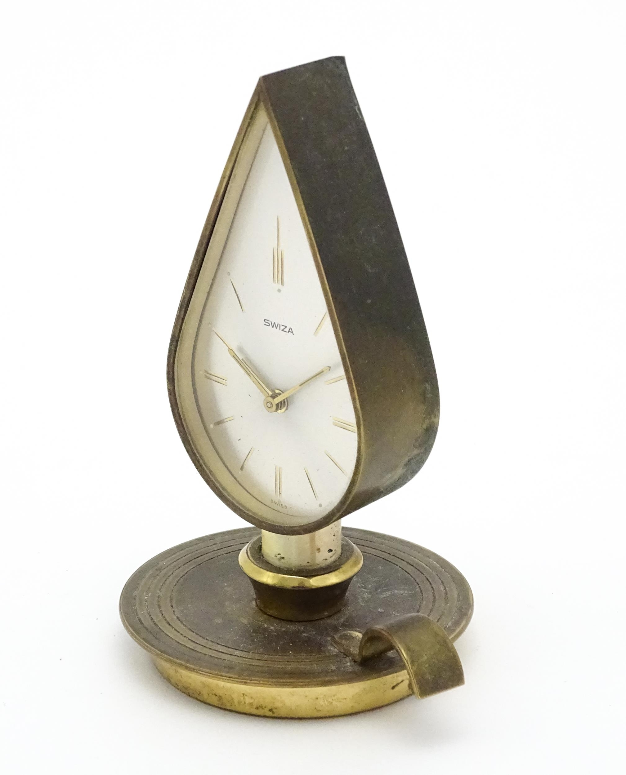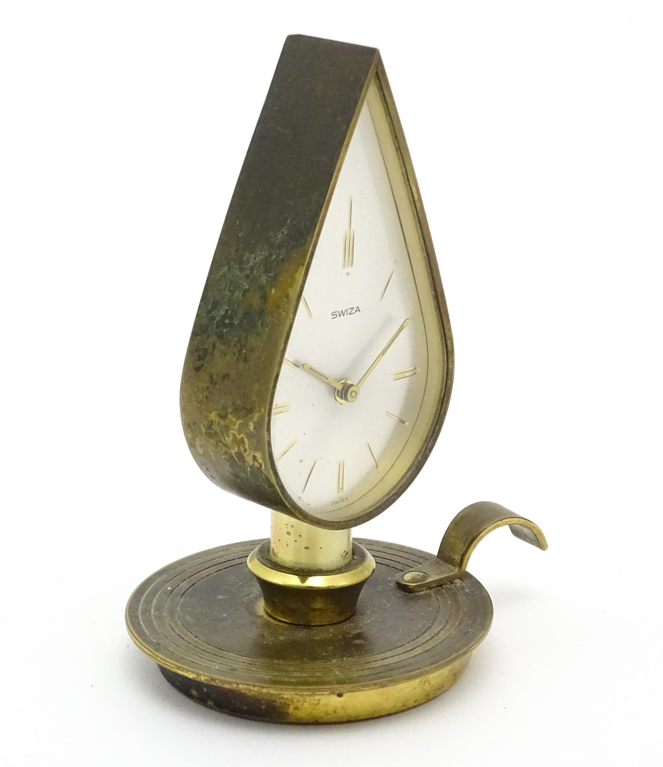 A Swiza novelty clock formed as a chamber stick with candle, the clock of flame form. Approx 5 1/4" high