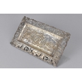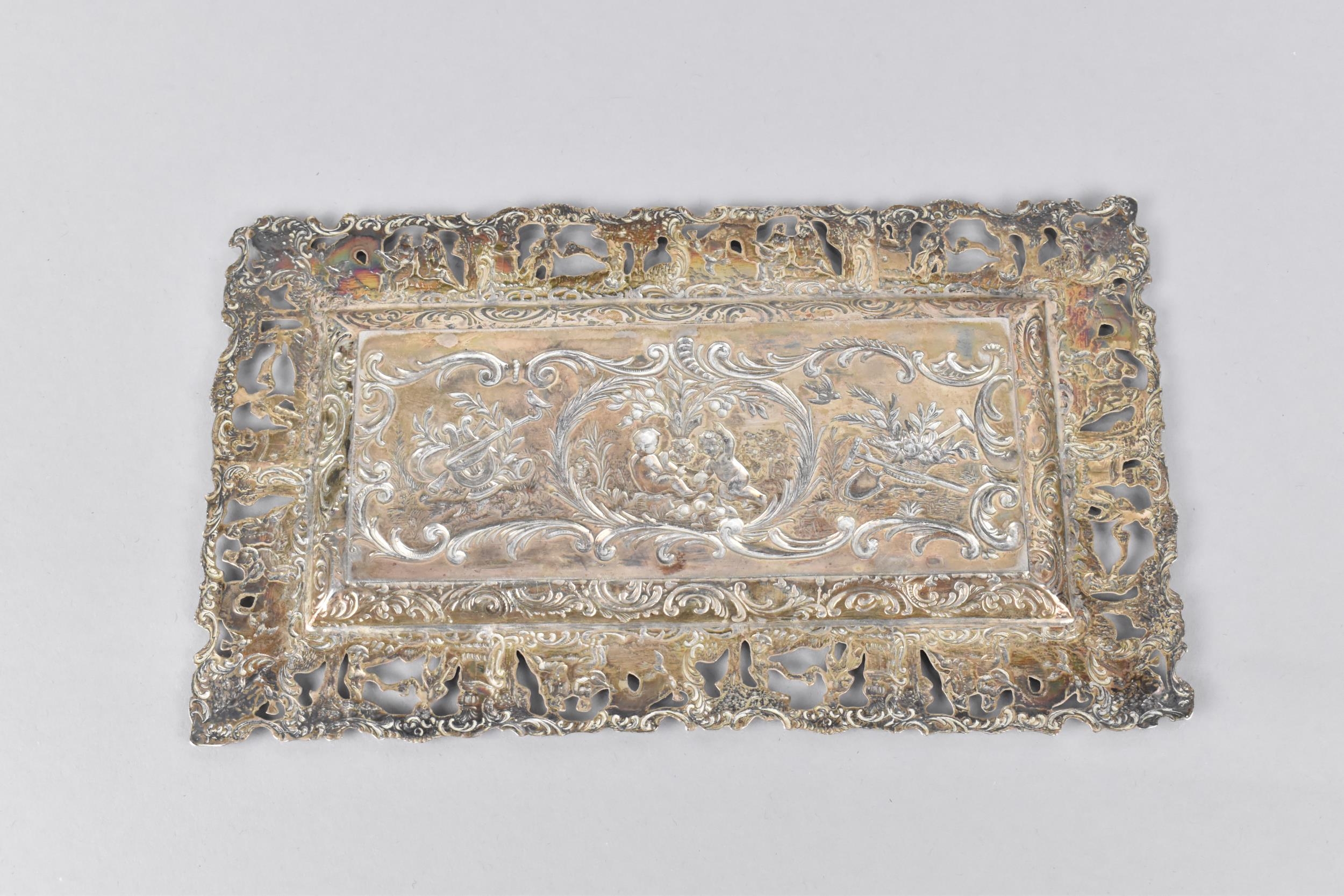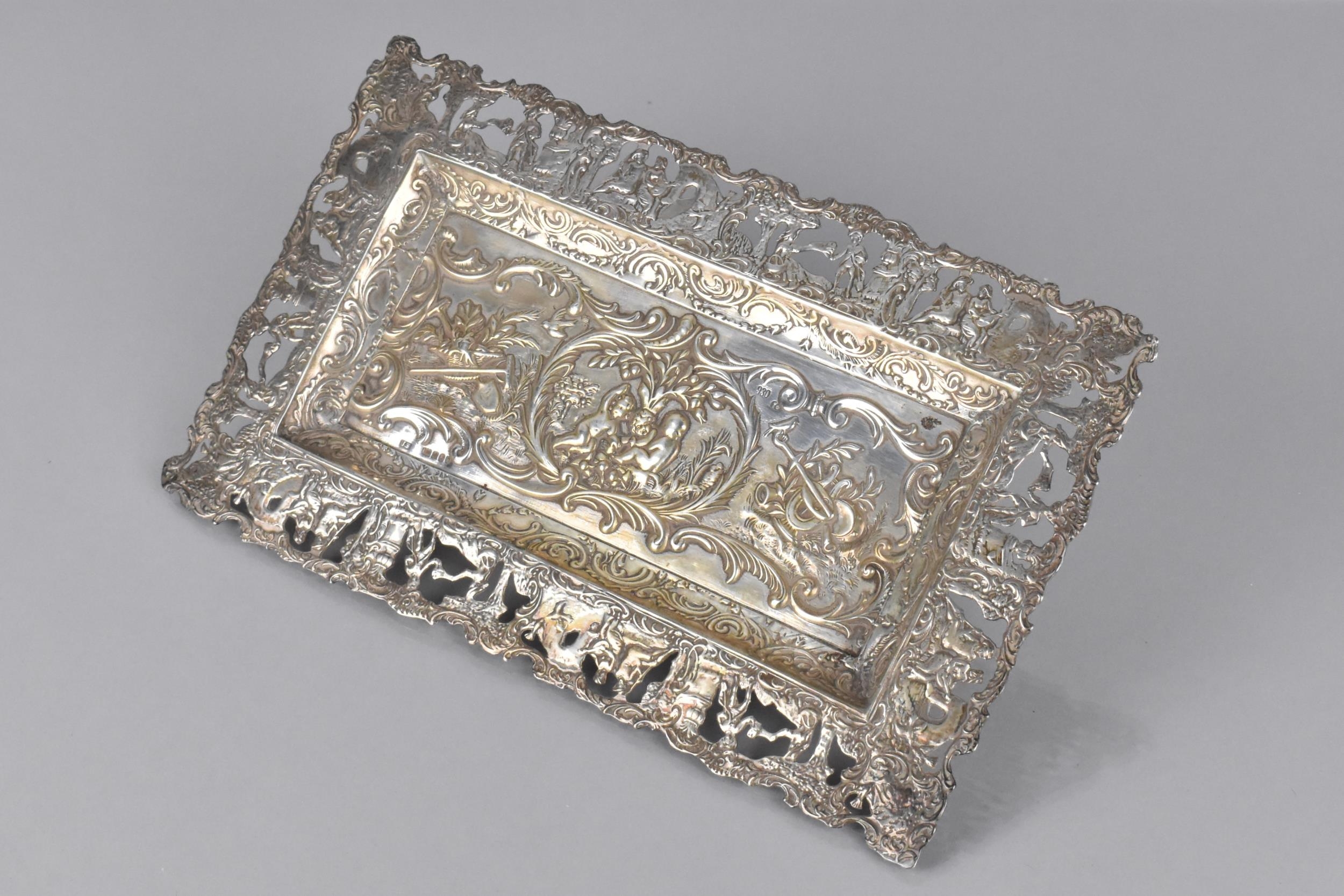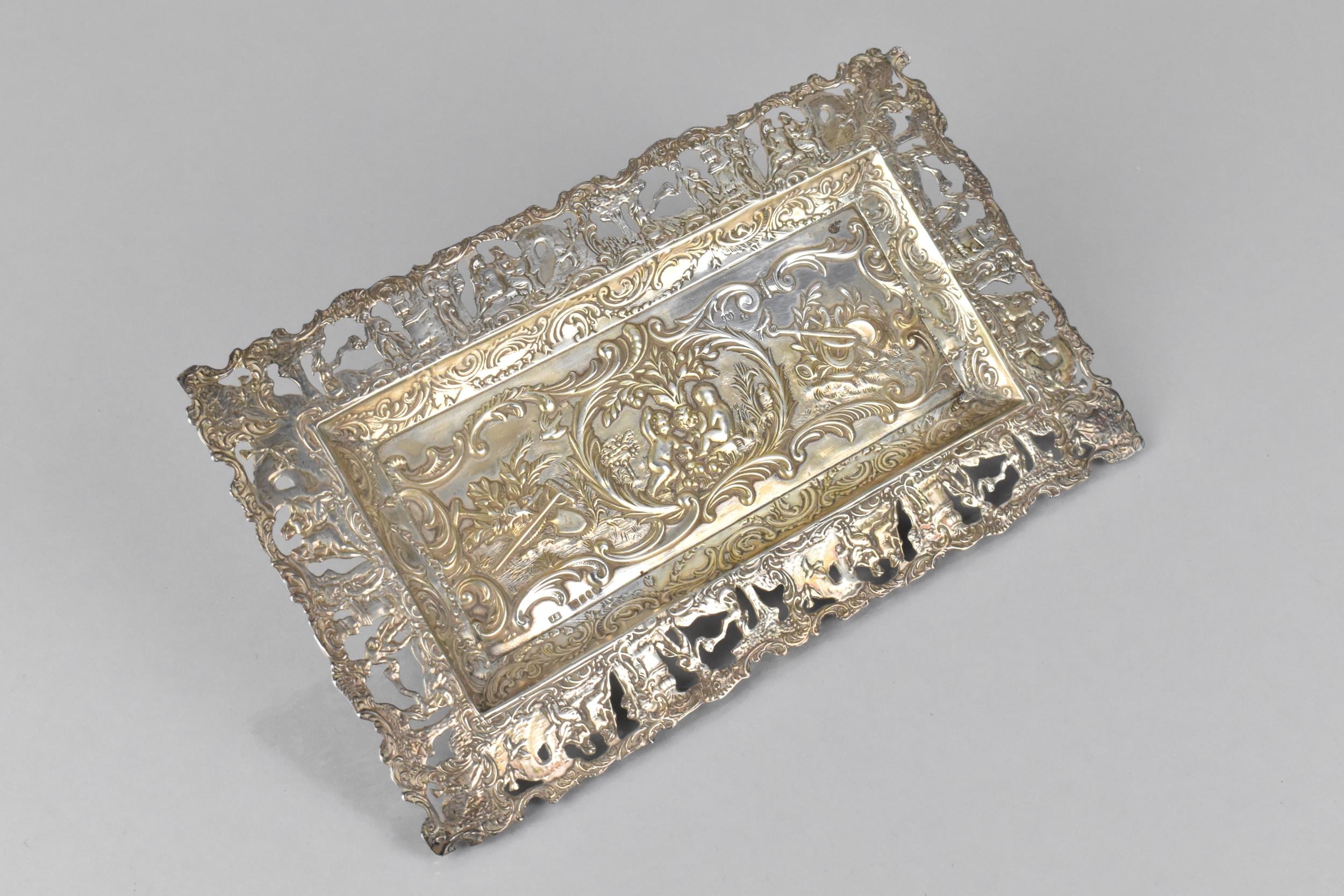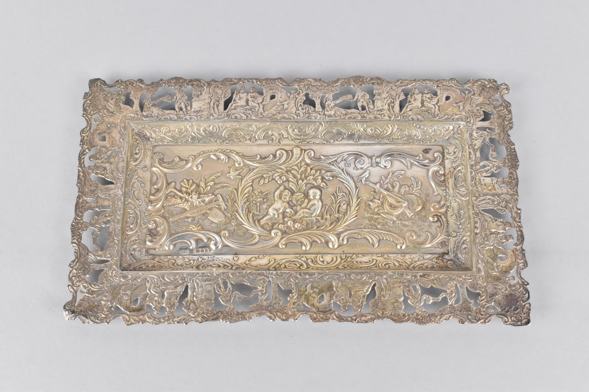 A Late 19th Century Continental Silver Rectangular Tray Detailing Cherubs Amongst Scrolls and Foliage and Pierced Figural Frieze Trim, Import mark for John George Smith, London 1899 and Stamped 930, 21x13cms, 140gms