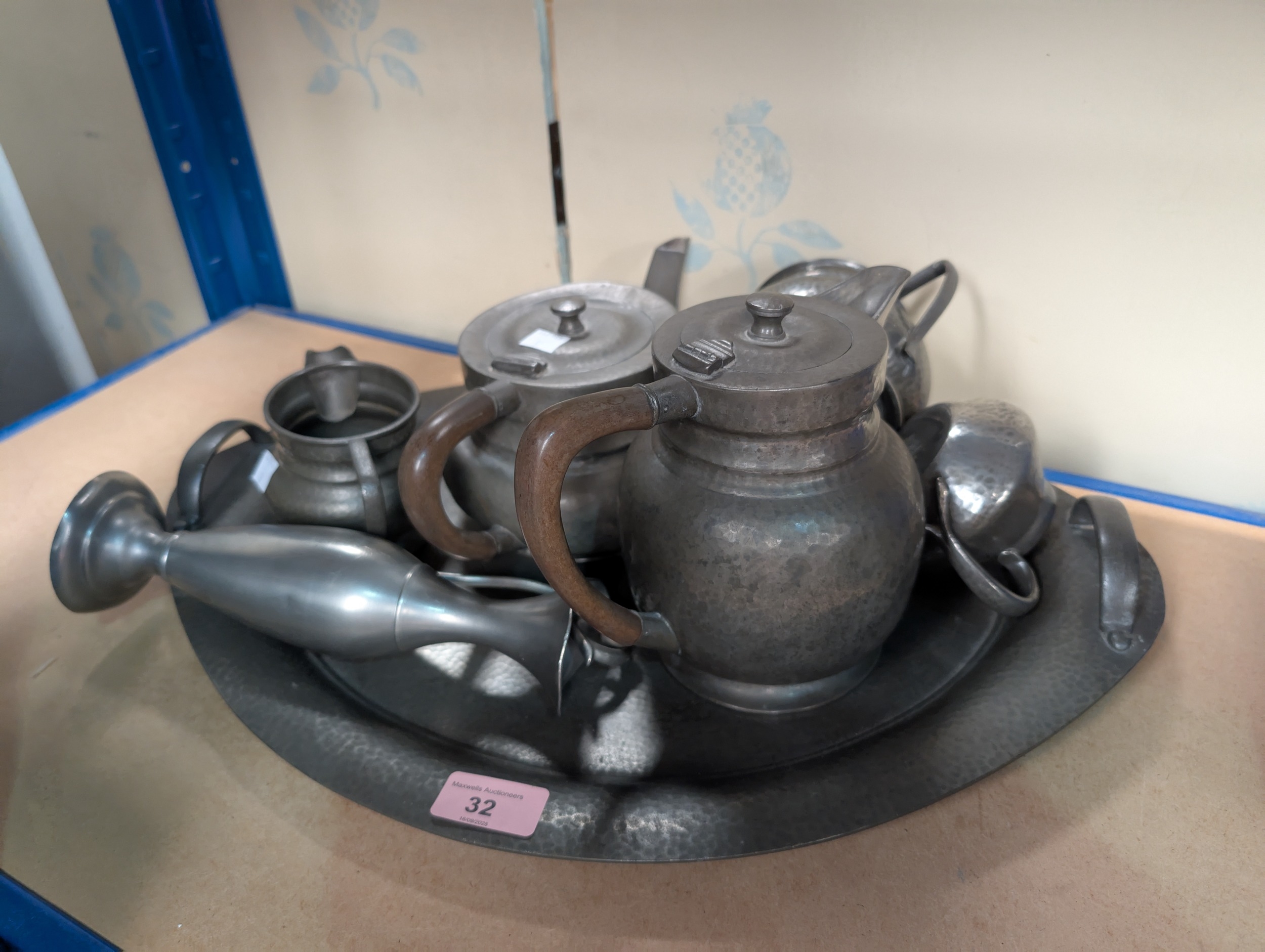 An Arts & Crafts "English Pewter" 4 piece tea set and tray No 6755 and other pewter.