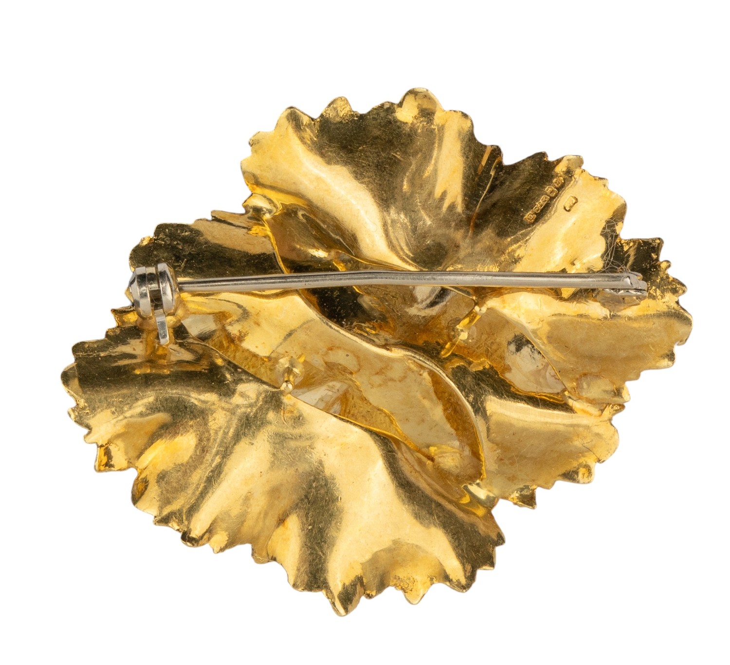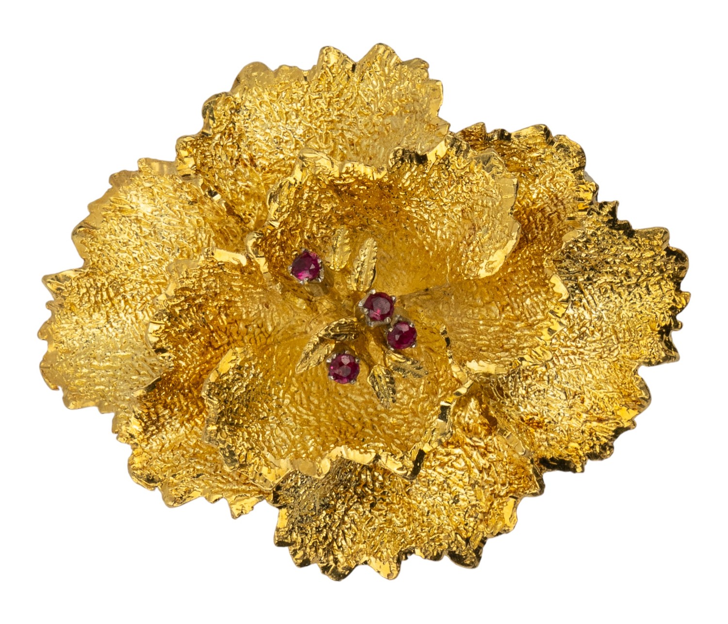 Designed as a flower, the centre set with four small brilliant-cut rubies.