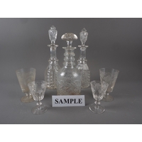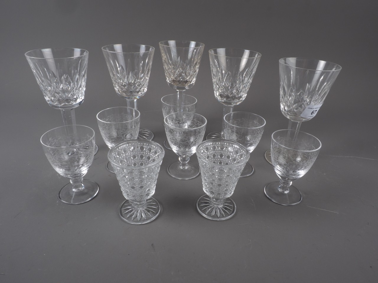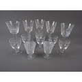 Five Waterford Crystal “Lismore” pattern wines, and a set of six sherry glasses with engraved scrolled leaf decoration