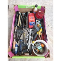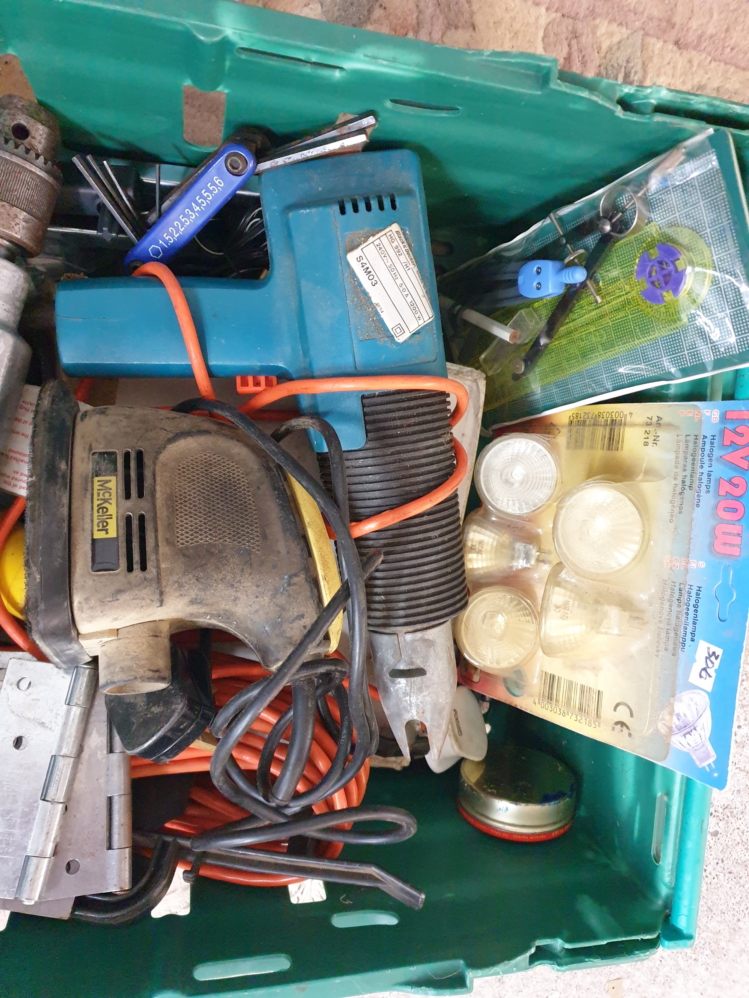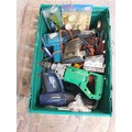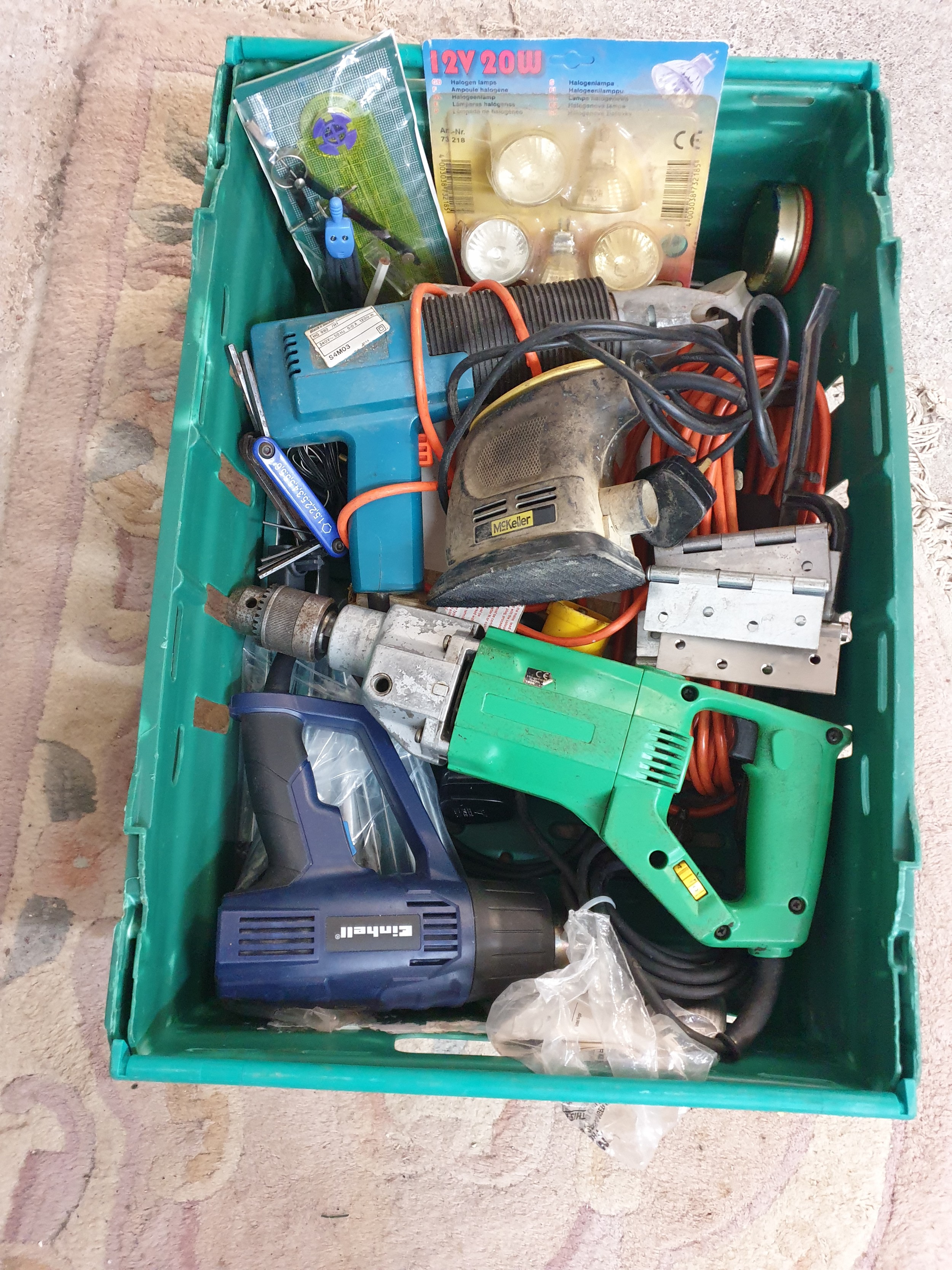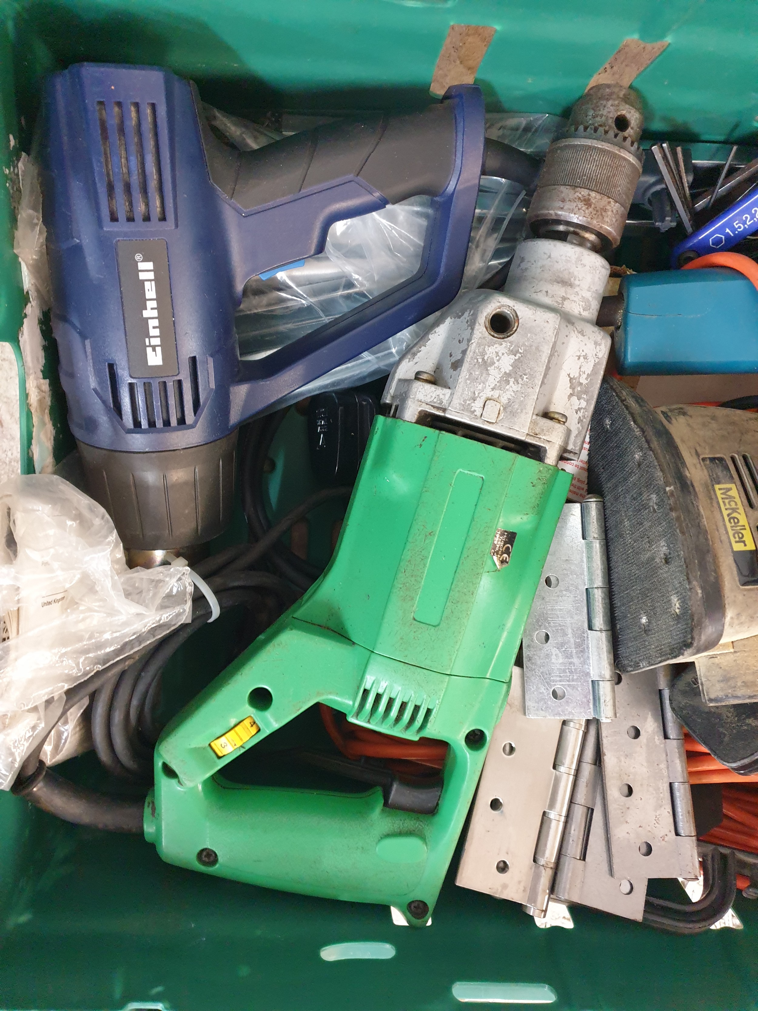 Large Crate Of vAssorted Tools, Hammer Drill, Heat Gun, Detail Sander Etc
