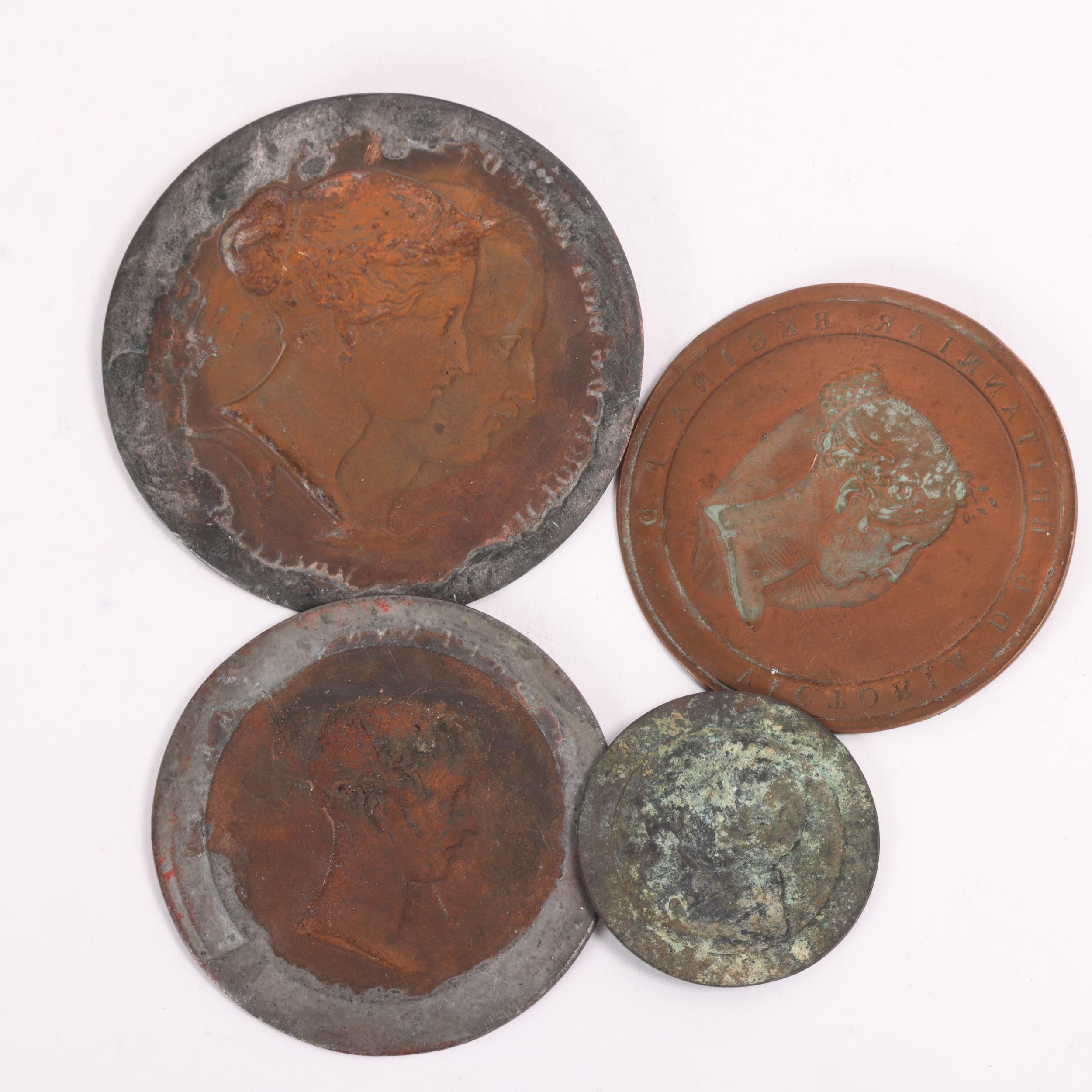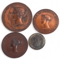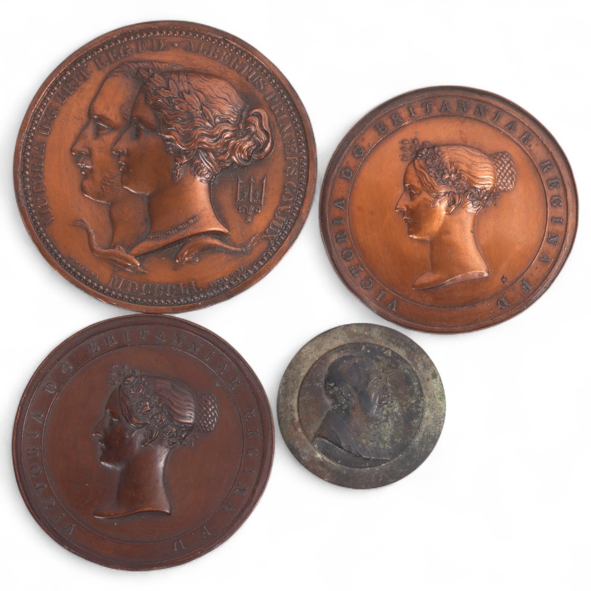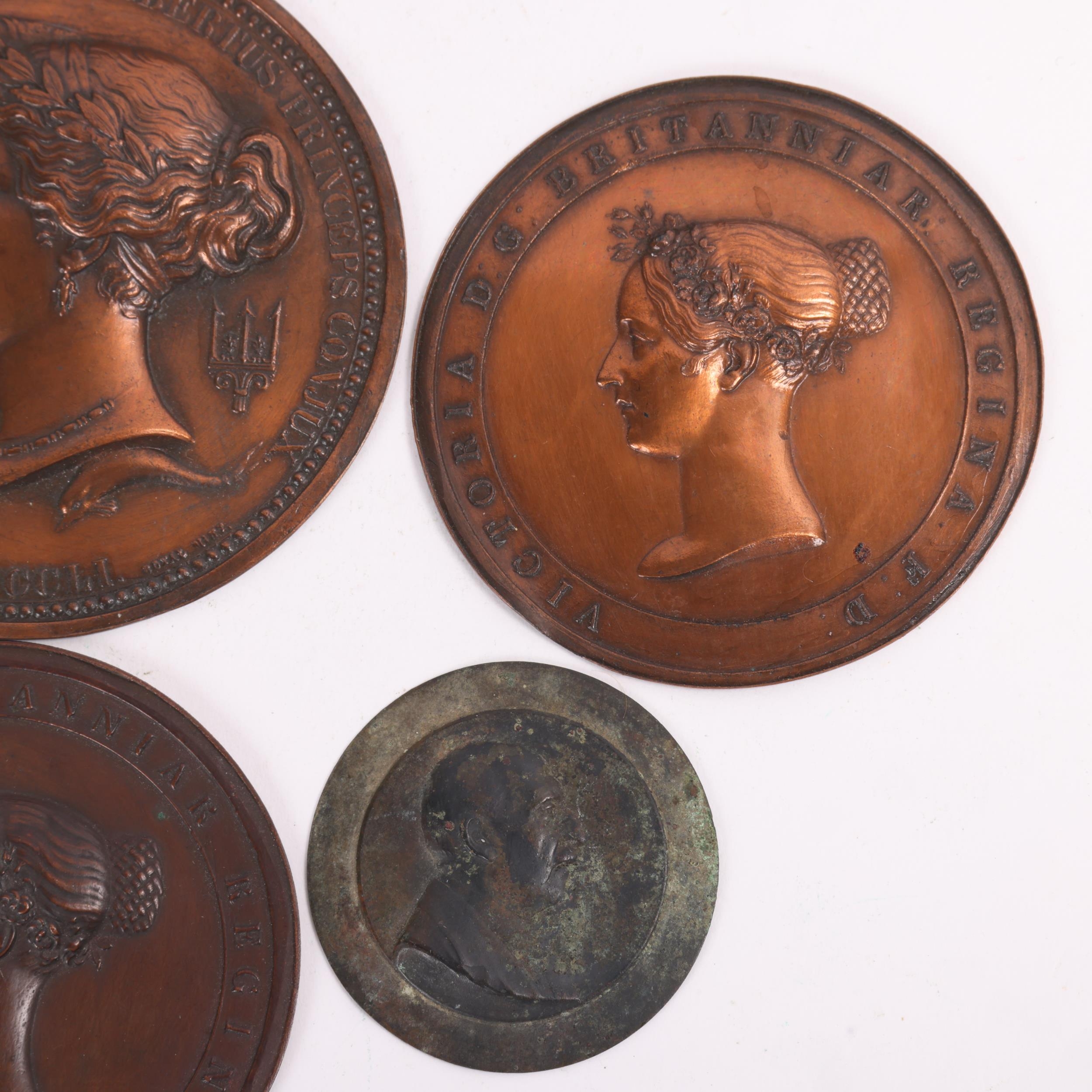 3 Queen Victorian bronze single side medallion pressings, 2 Treaty of Nanking 1842, diameter 64.5mm and a Great Exhibition diameter 1851 prize medal 76.5mm and 1 other (4)