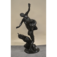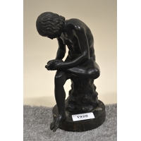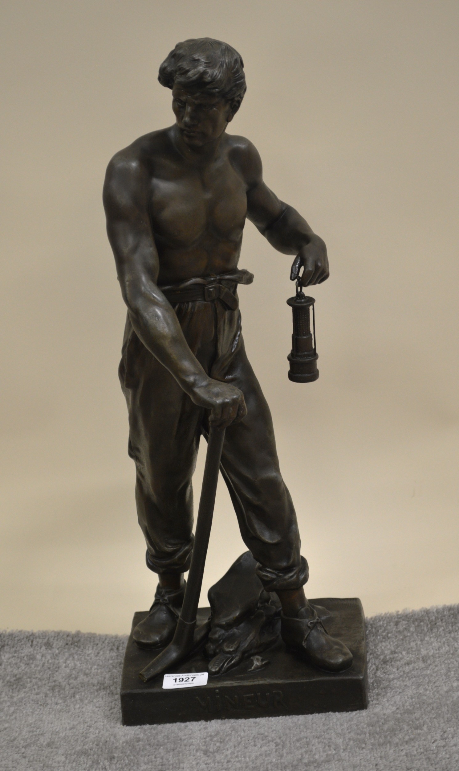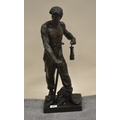 Bronze patinated spelter figure ' The Miner ' with pick axe and miners lamp, signed in the base E. Picault (hole to back), 57cm high