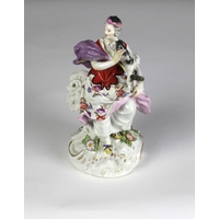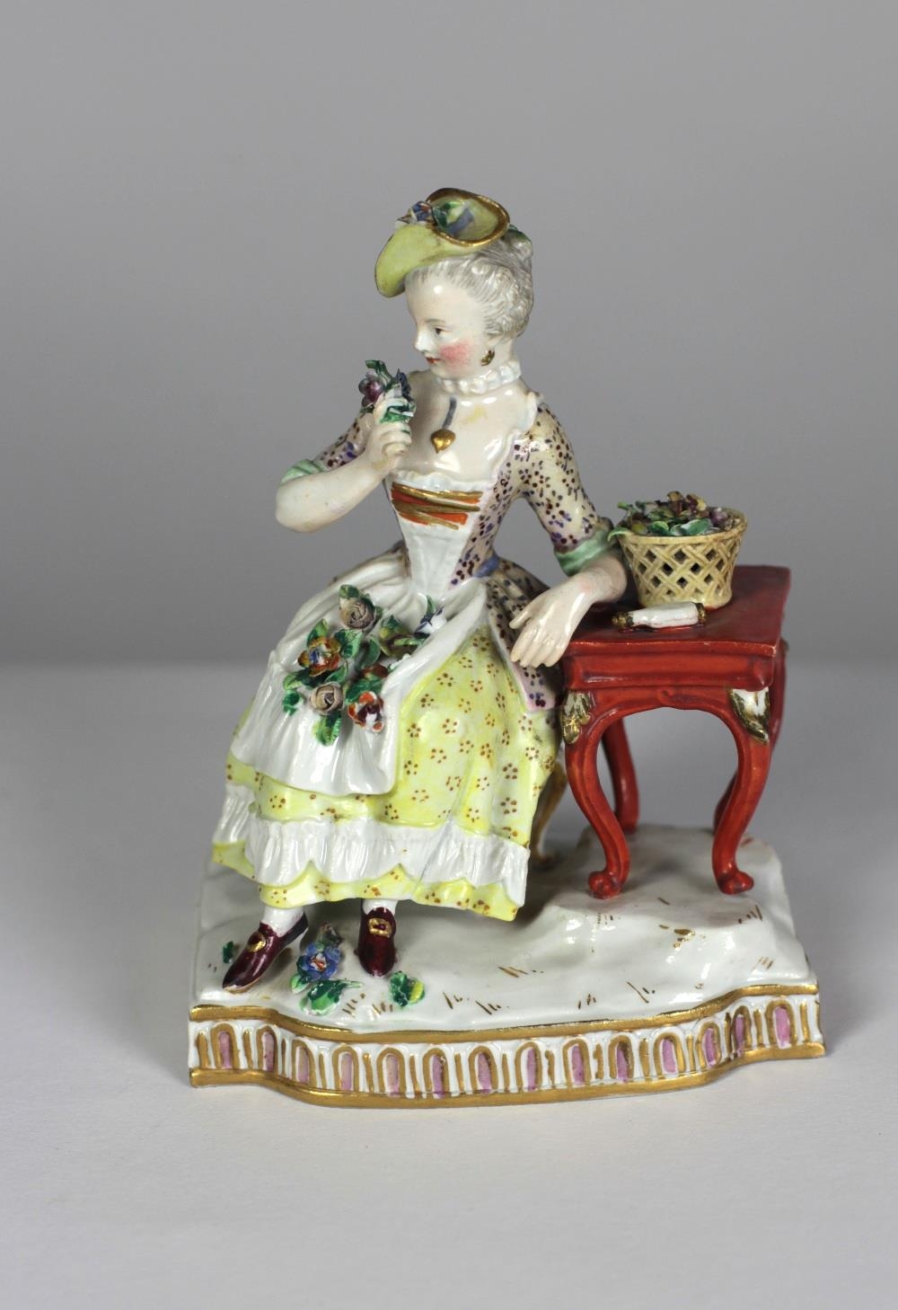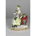 An attractive 18th Century Continental porcelain hand painted Figure of a young lady seated at a table in elegant dress, with floral encrusting, Meissen, stamped with mark, approx. 14cms (5 1/2"). (1)