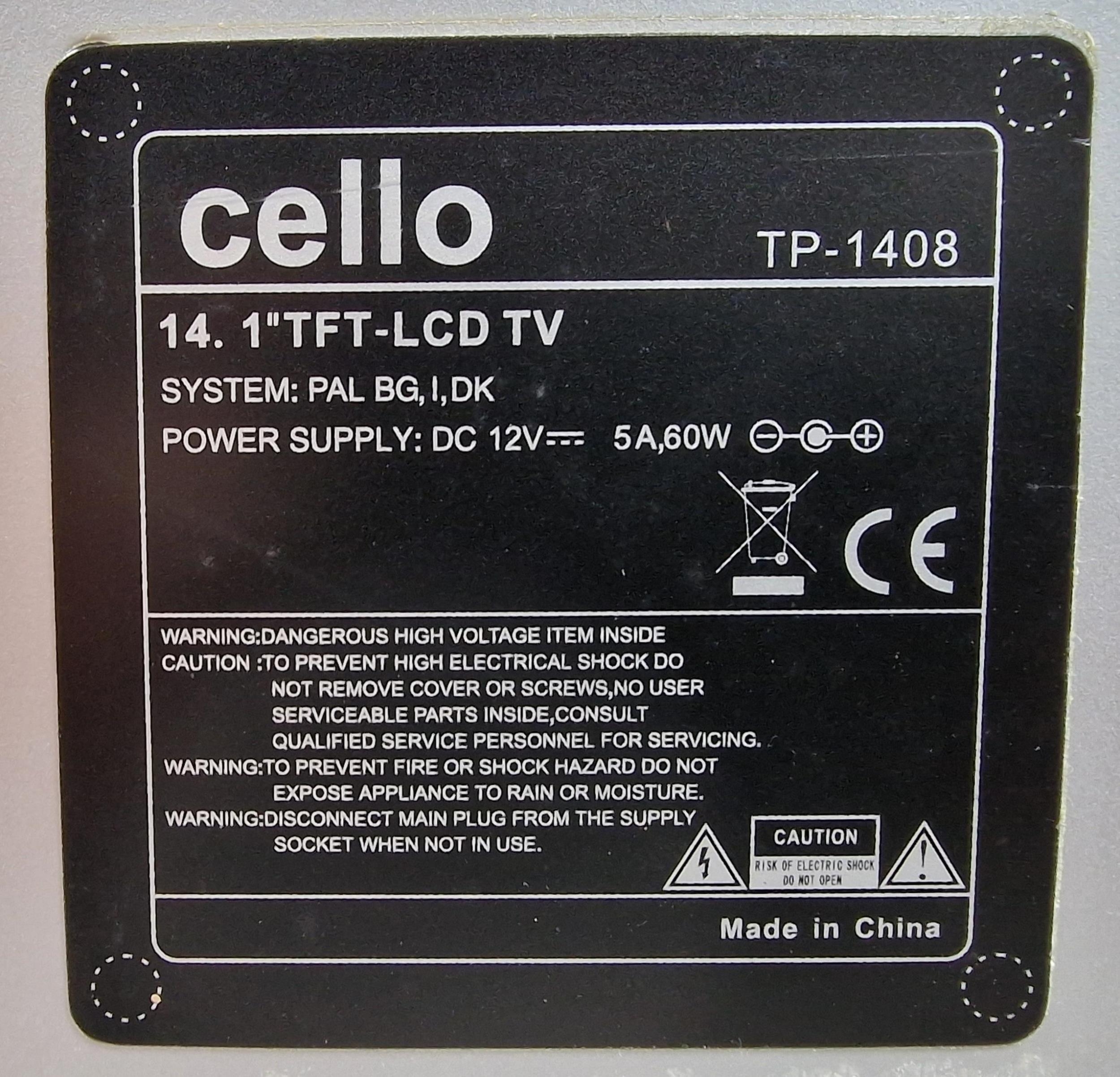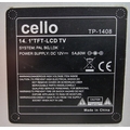 A 14" 'Cello' LCD TV, model no. TP-1408. AC/DC supply. No remote control. PAT test pass & functionality test indicates in working order.