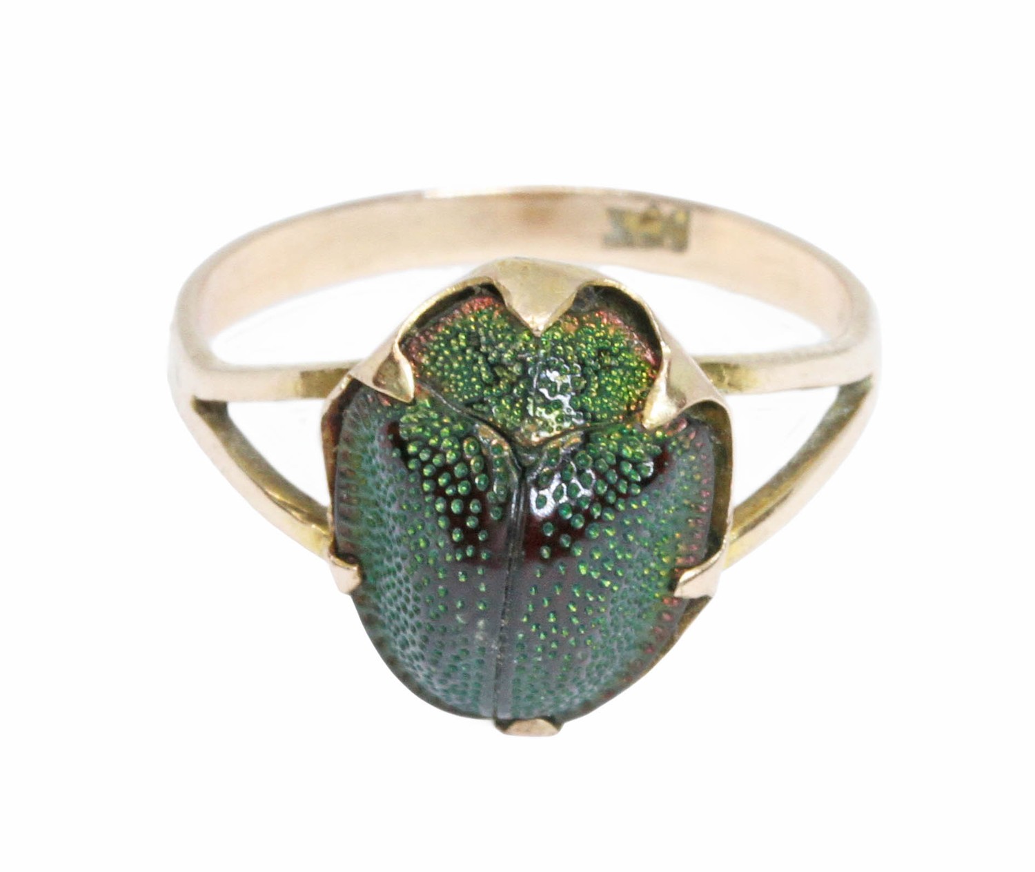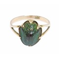 An antique scarab beetle ring, the beetle measuring approximately 14mm x 10mm, yellow metal marked '9ct', gross weight 1.7g, size P.