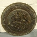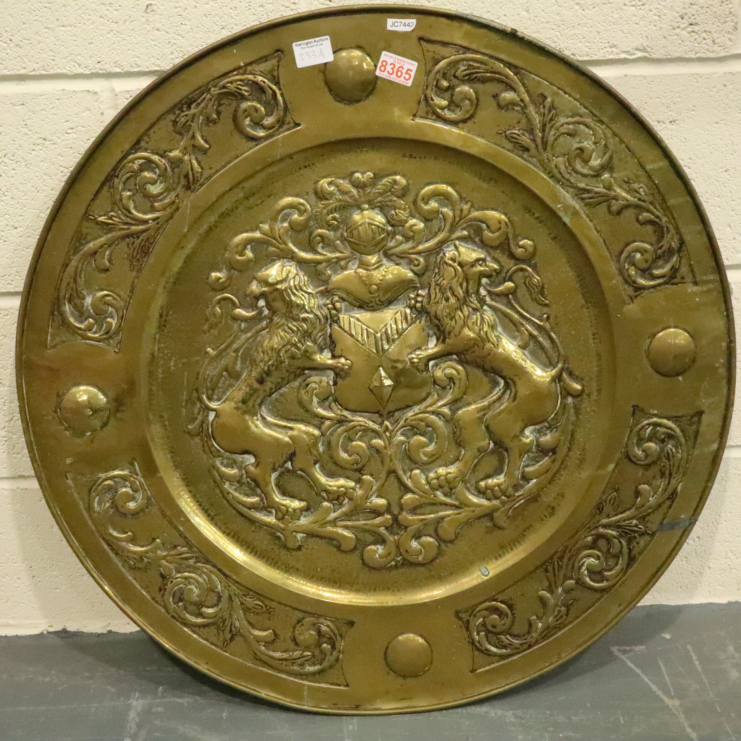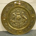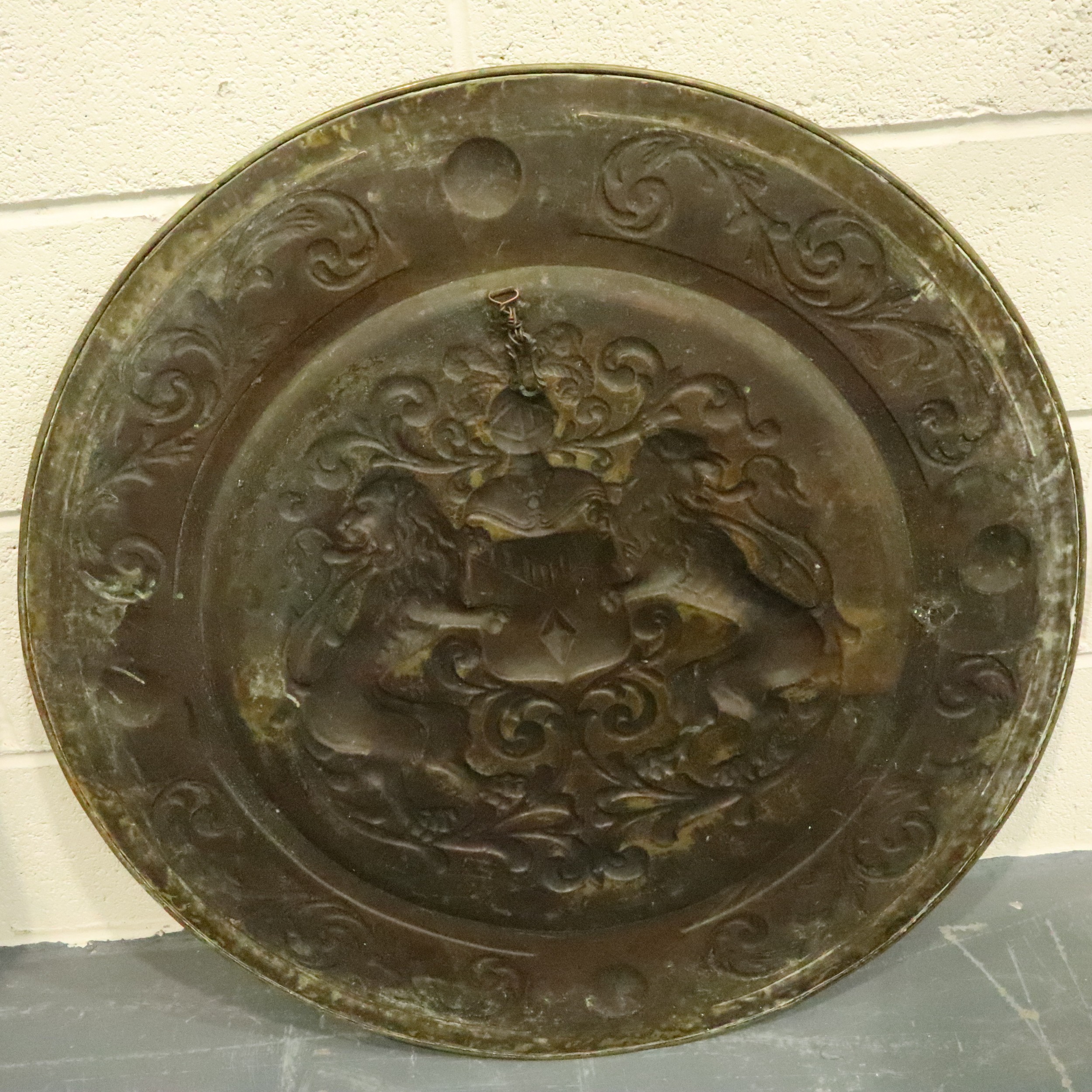 Large Scottish Crest decorative brass charger with rampant lions, D: 80 cm. Not available for in-house P&P, contact Paul O'Hea at Mailboxes on 01925 659133