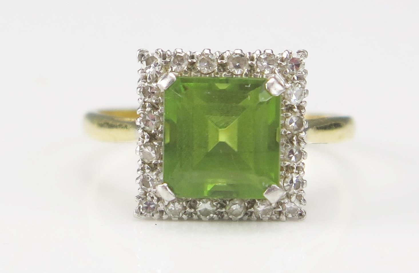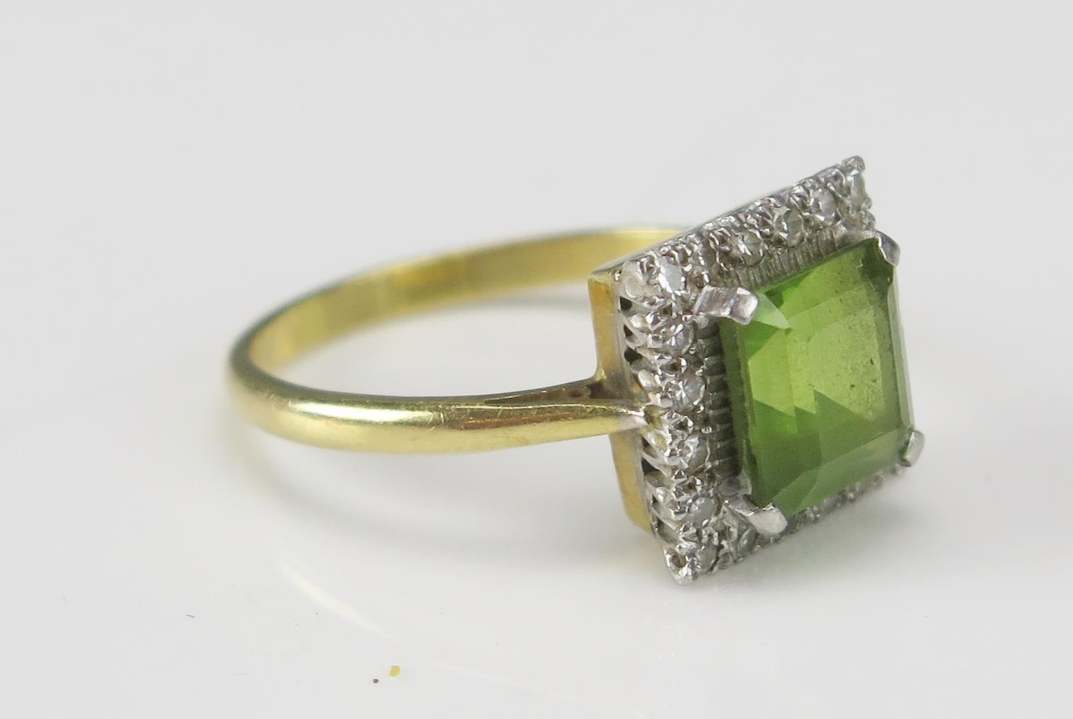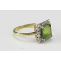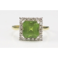 An 18ct Gold, Peridot and Diamond Cluster Ring, c. 12.1mm head, size Q.5, stamped 18CT&PLAT, 5.51g