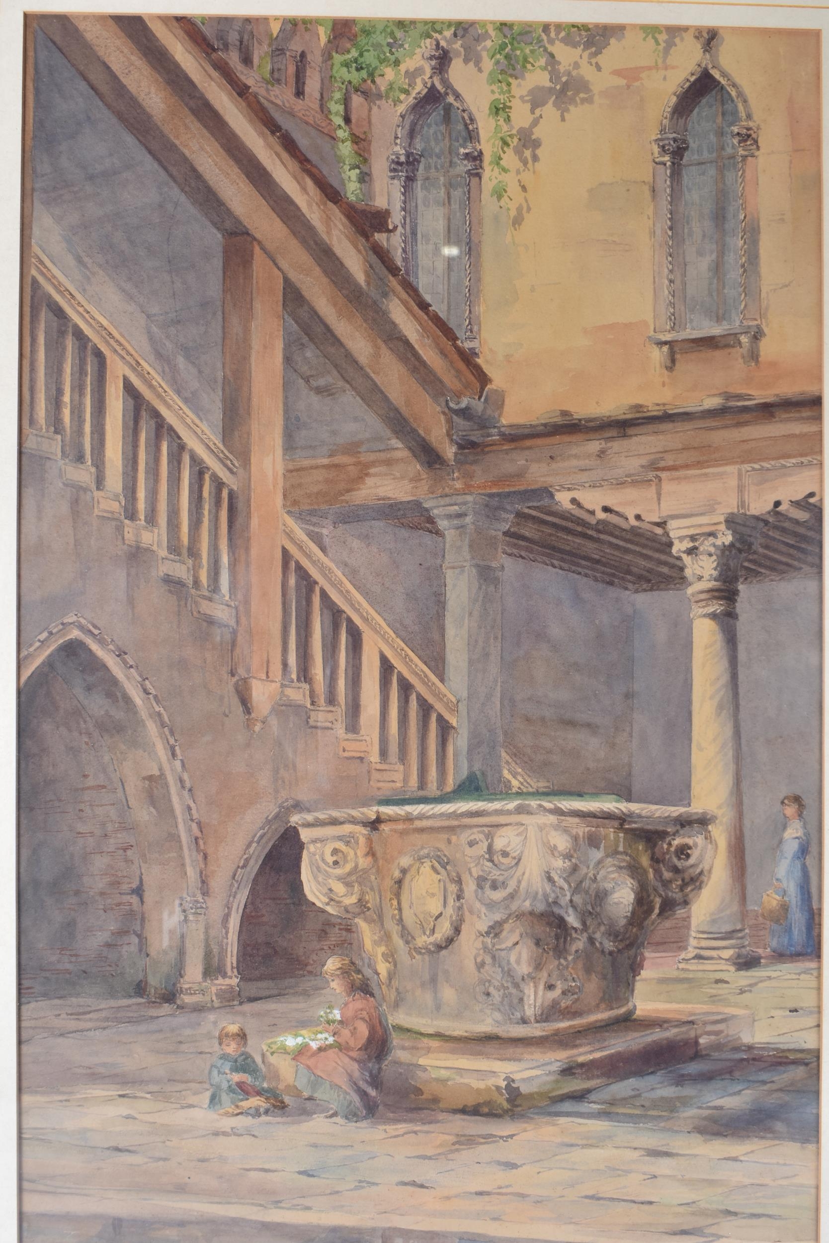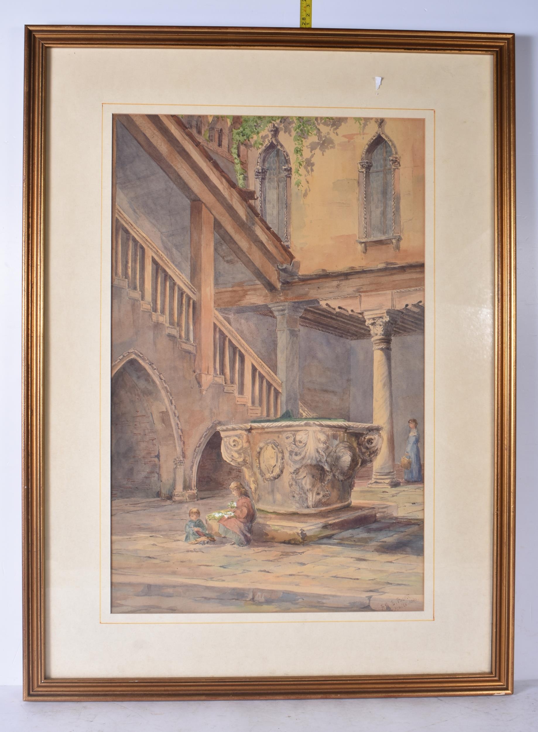 A framed watercolour of a Venetian courtyard signed F G S Best and dated 1680 51 x 32cm.