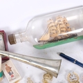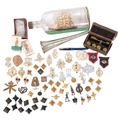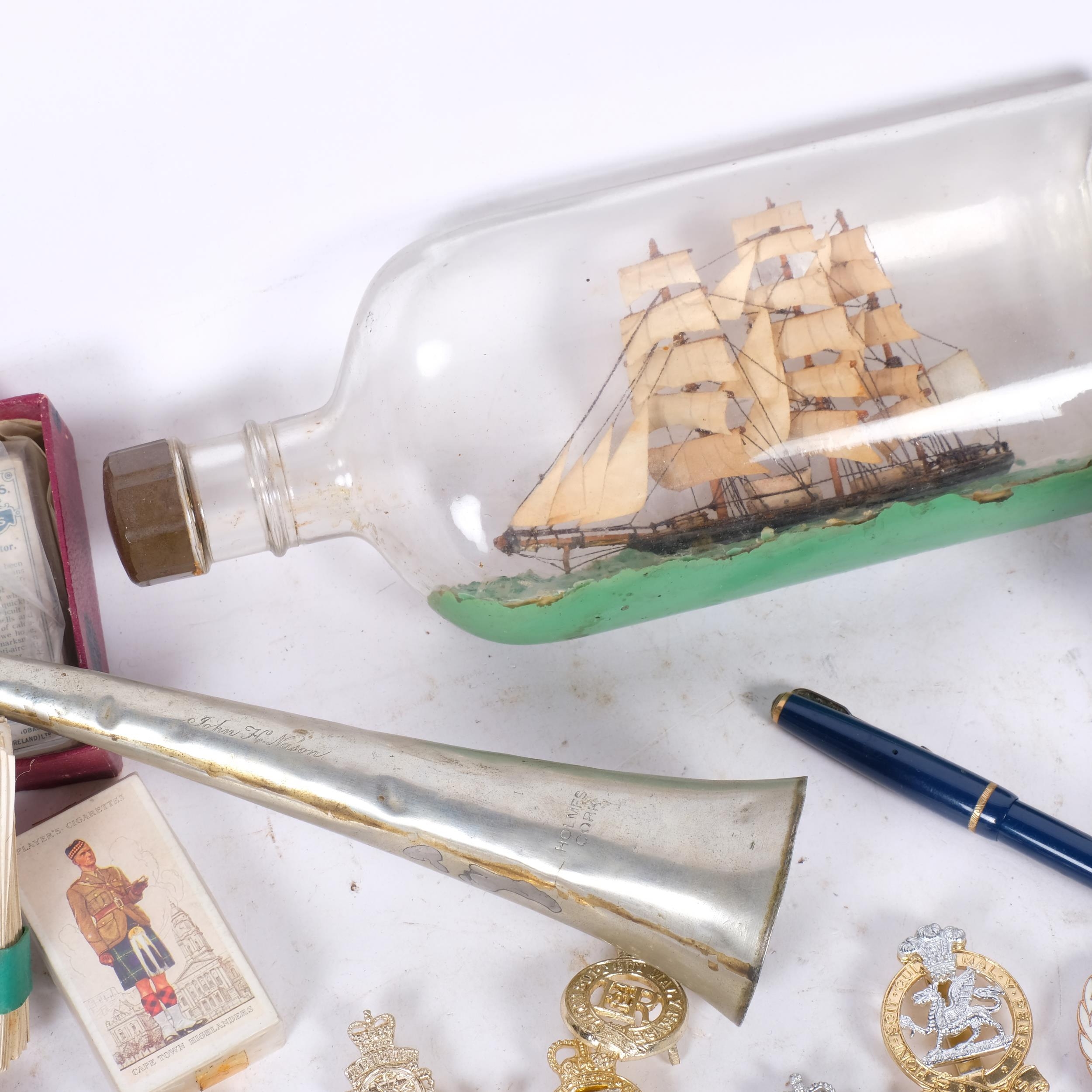MILITARY INTEREST - a collection of interesting militaria, including cap badges, cigarette cards, a ship in a bottle, a Holmes bugle, etc