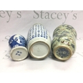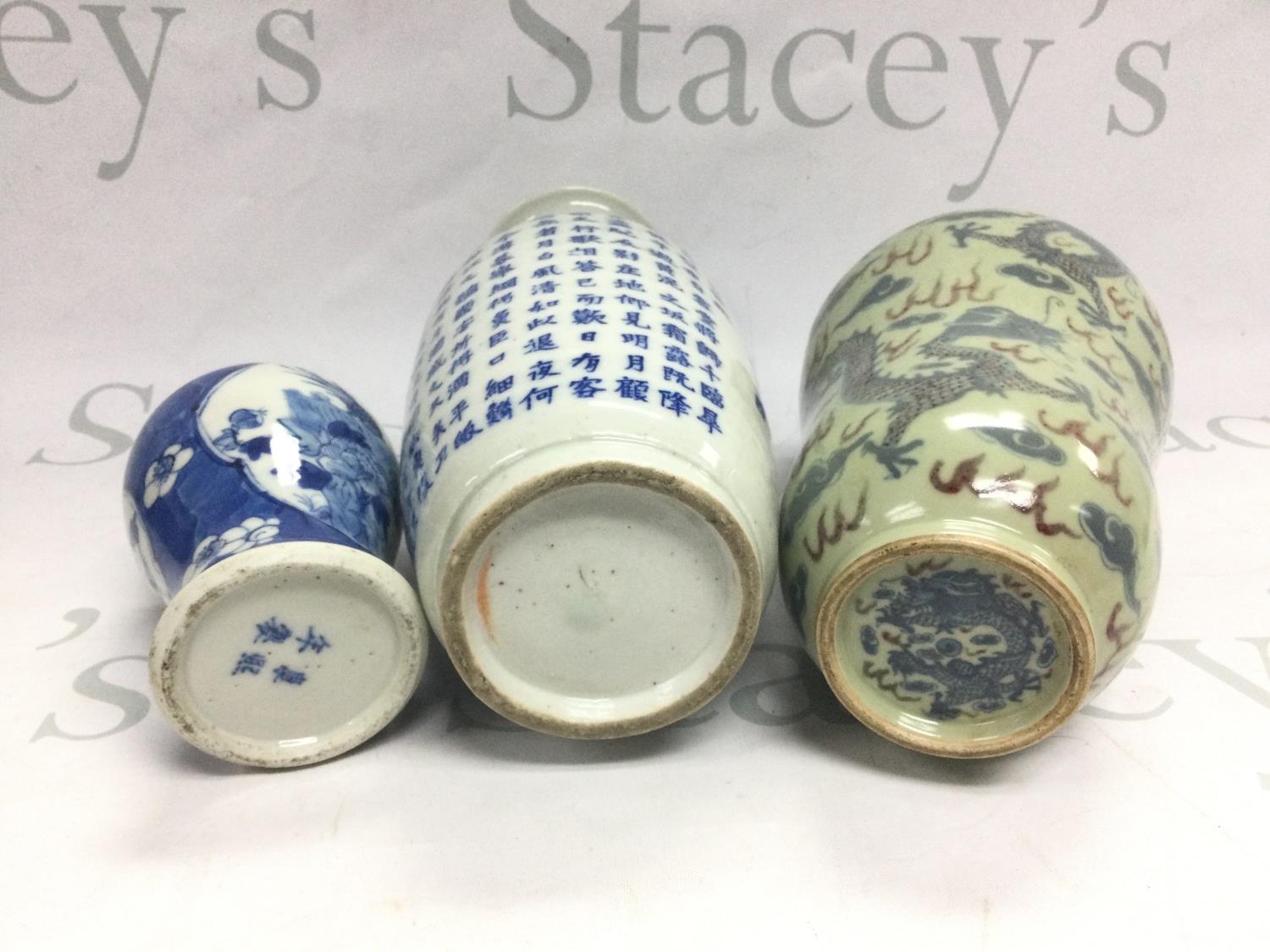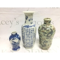 Three Oriental vases comprising a blue and white example decorated with various characters and script plus two others, tallest approx 25cm.
