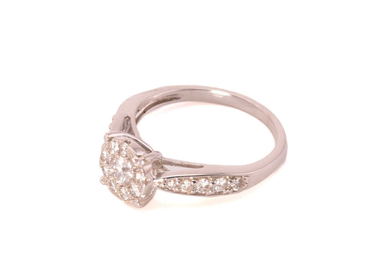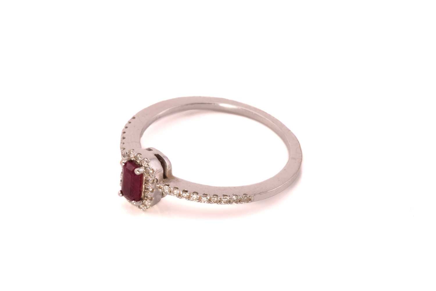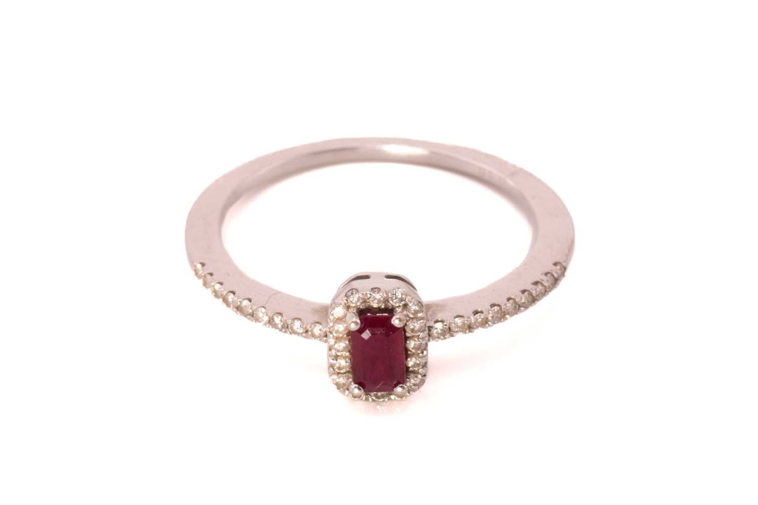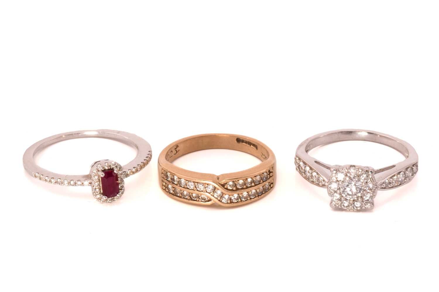 Two 9ct diamond cluster rings and a cubic zirconia ring; A synthetic ruby and diamond halo ring in 9ct white gold, size O; A diamond cluster ring in 9ct white gold, size N; A two-row CZ ring with pseudo hallmarks, marked 'DQCZ', size M; Total weight of items 8.3 grams (3).