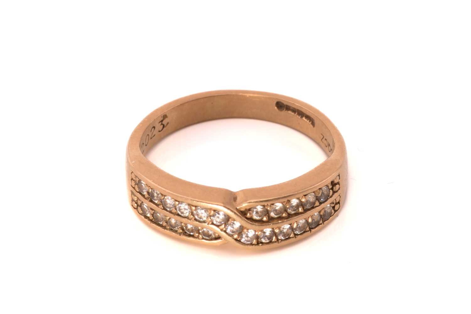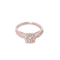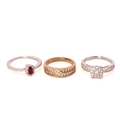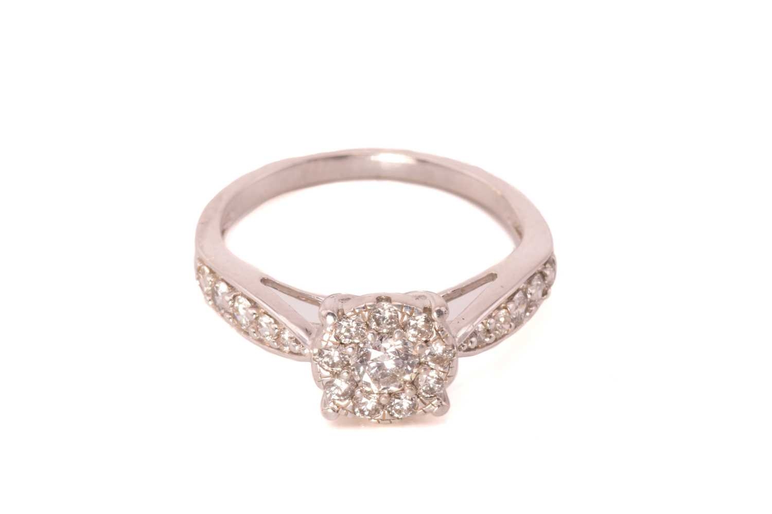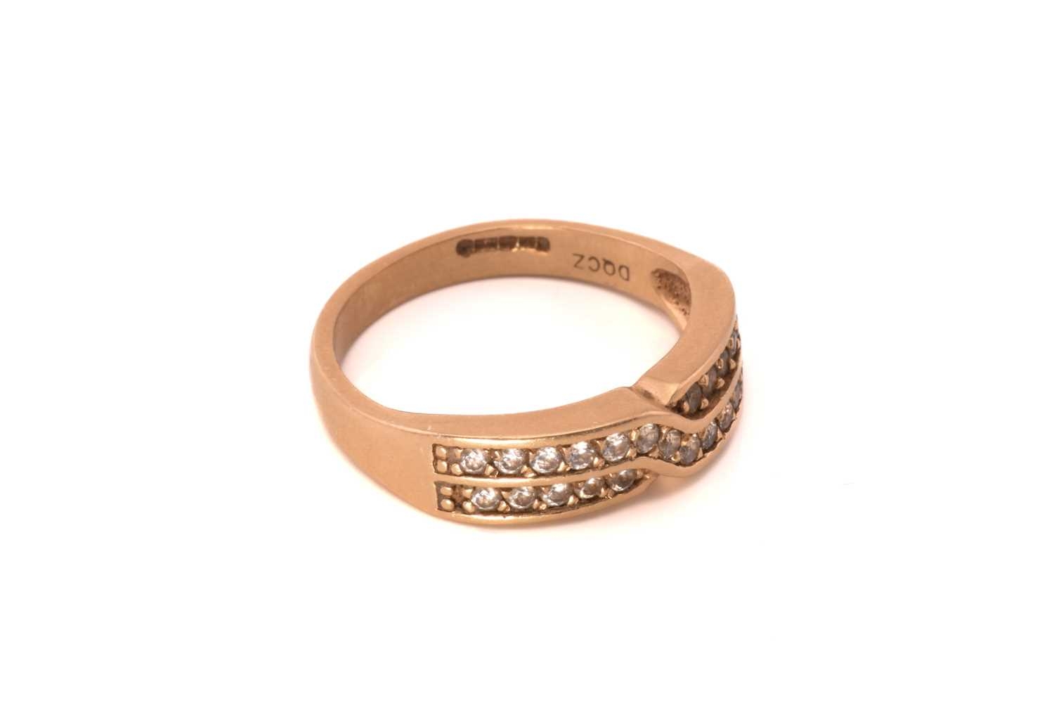 Two 9ct diamond cluster rings and a cubic zirconia ring; A synthetic ruby and diamond halo ring in 9ct white gold, size O; A diamond cluster ring in 9ct white gold, size N; A two-row CZ ring with pseudo hallmarks, marked 'DQCZ', size M; Total weight of items 8.3 grams (3).