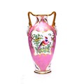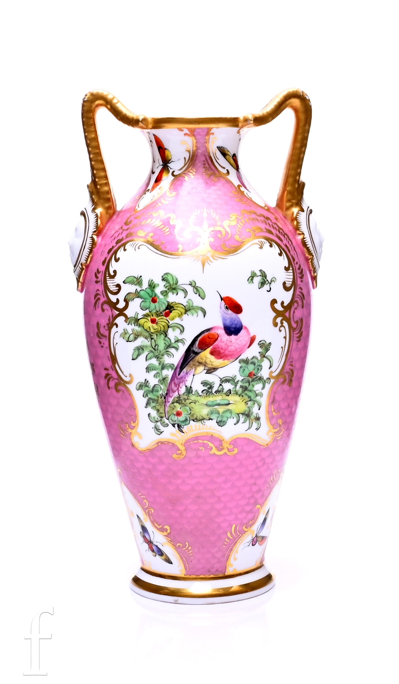 A Grainger's Worcester vase, circa 1899, of baluster form with twin horned mask handles, decorated with fabulous birds within gilt cartouche reserved to a pink fish scale ground, height 18.5cm.