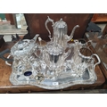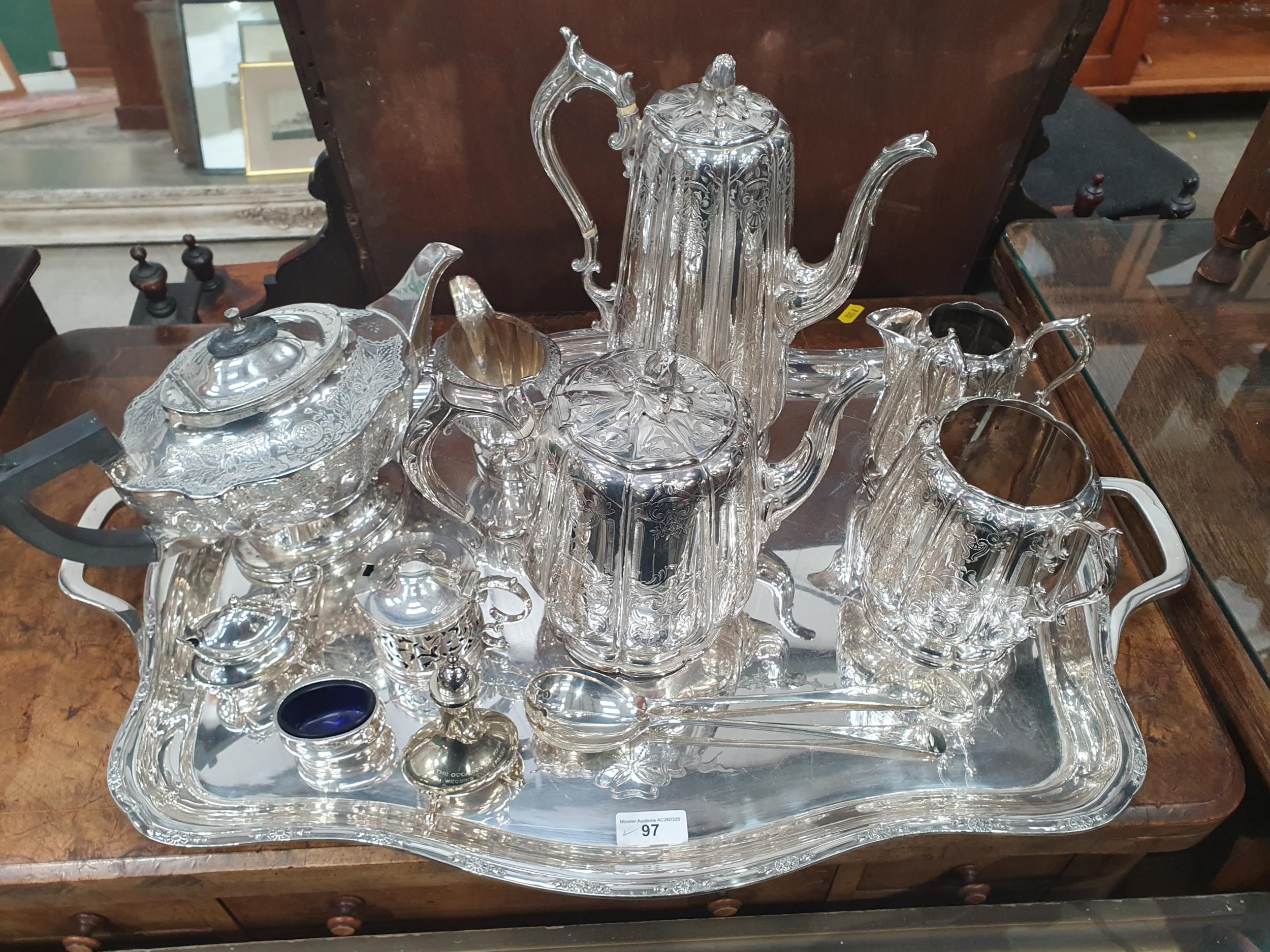 A quantity of plated items including a four piece Tea Service, a Teapot, a Milk Jug, a two-handled rectangular Tray, Condiments, etc, (R10)