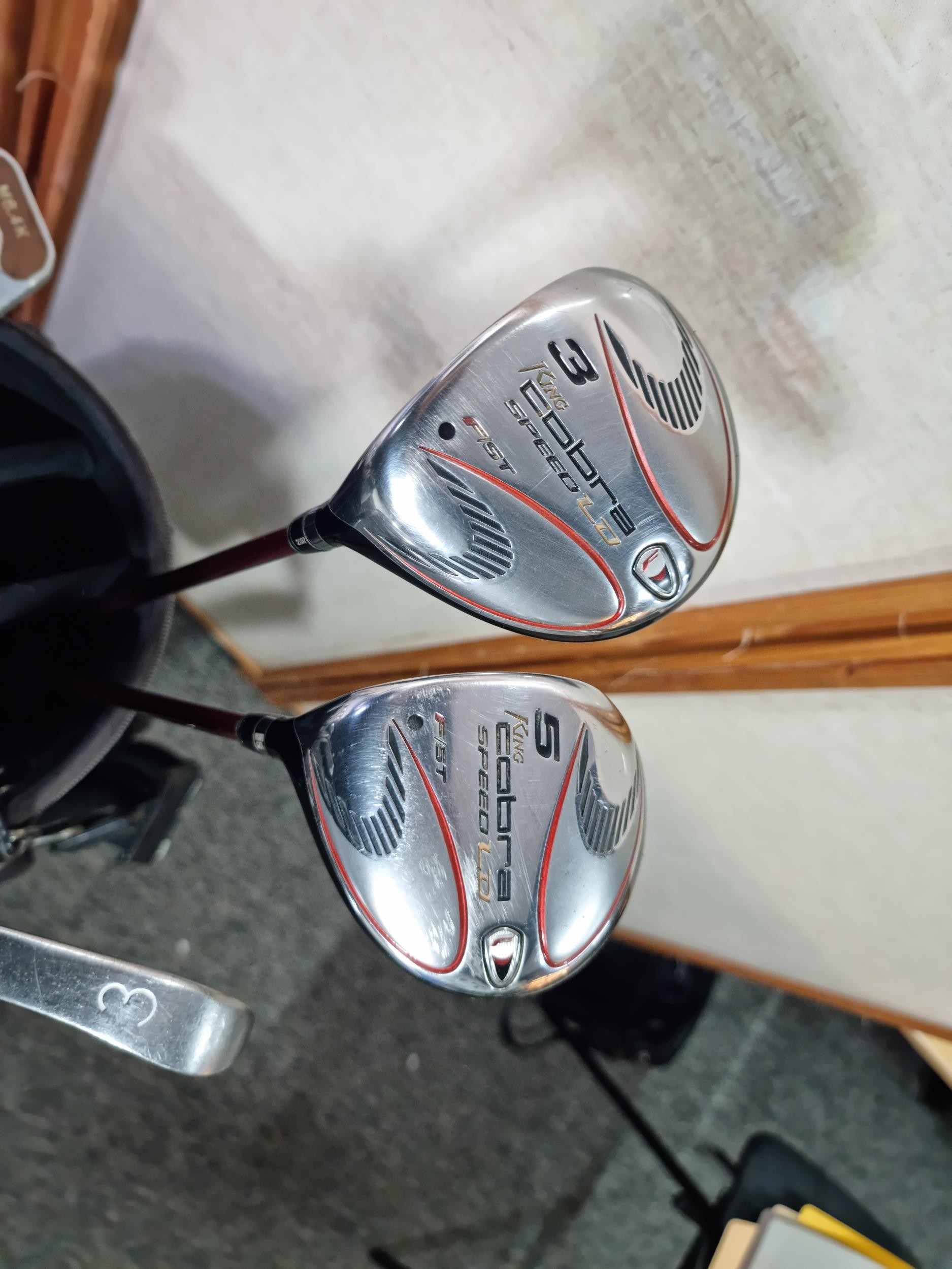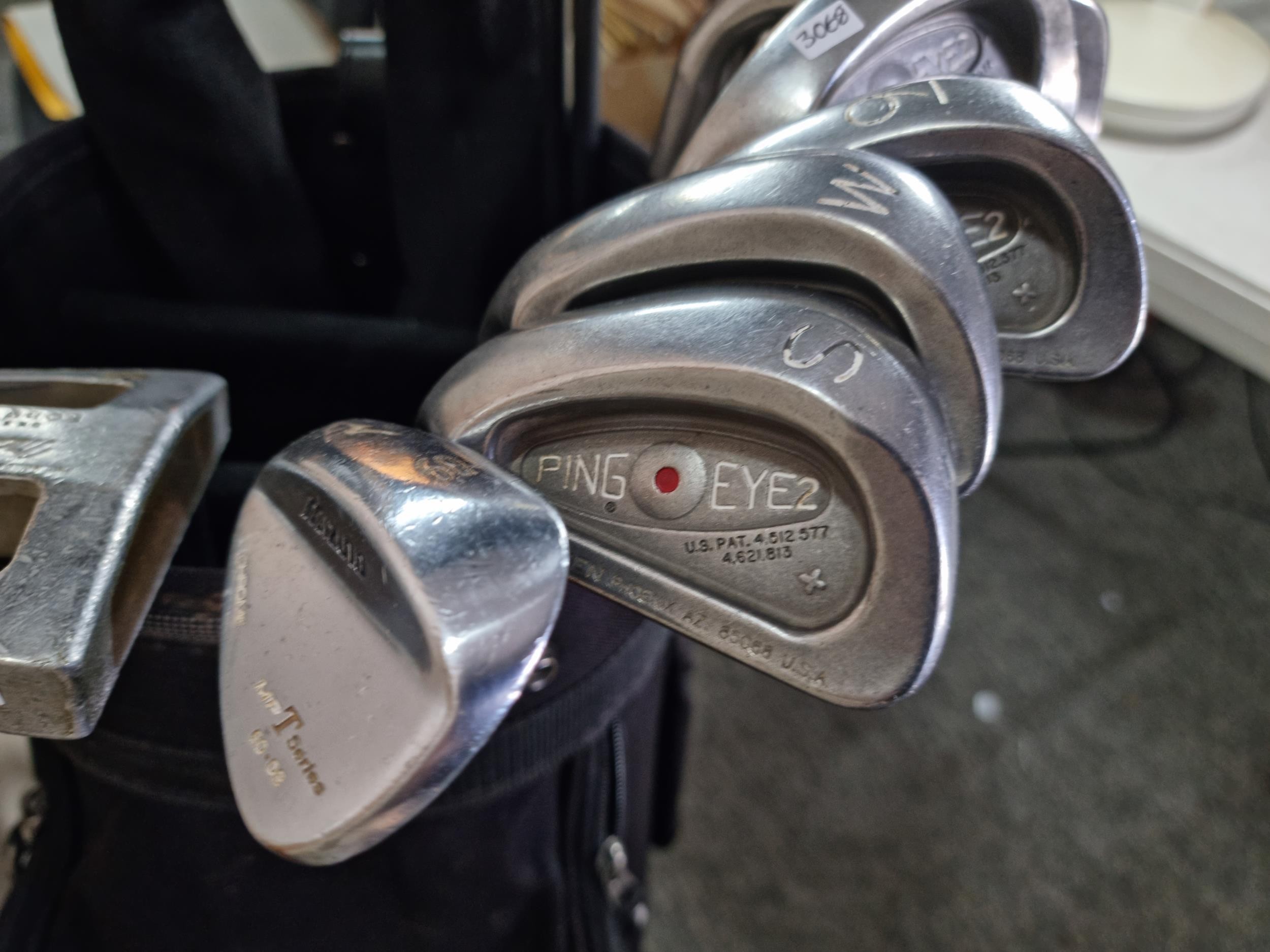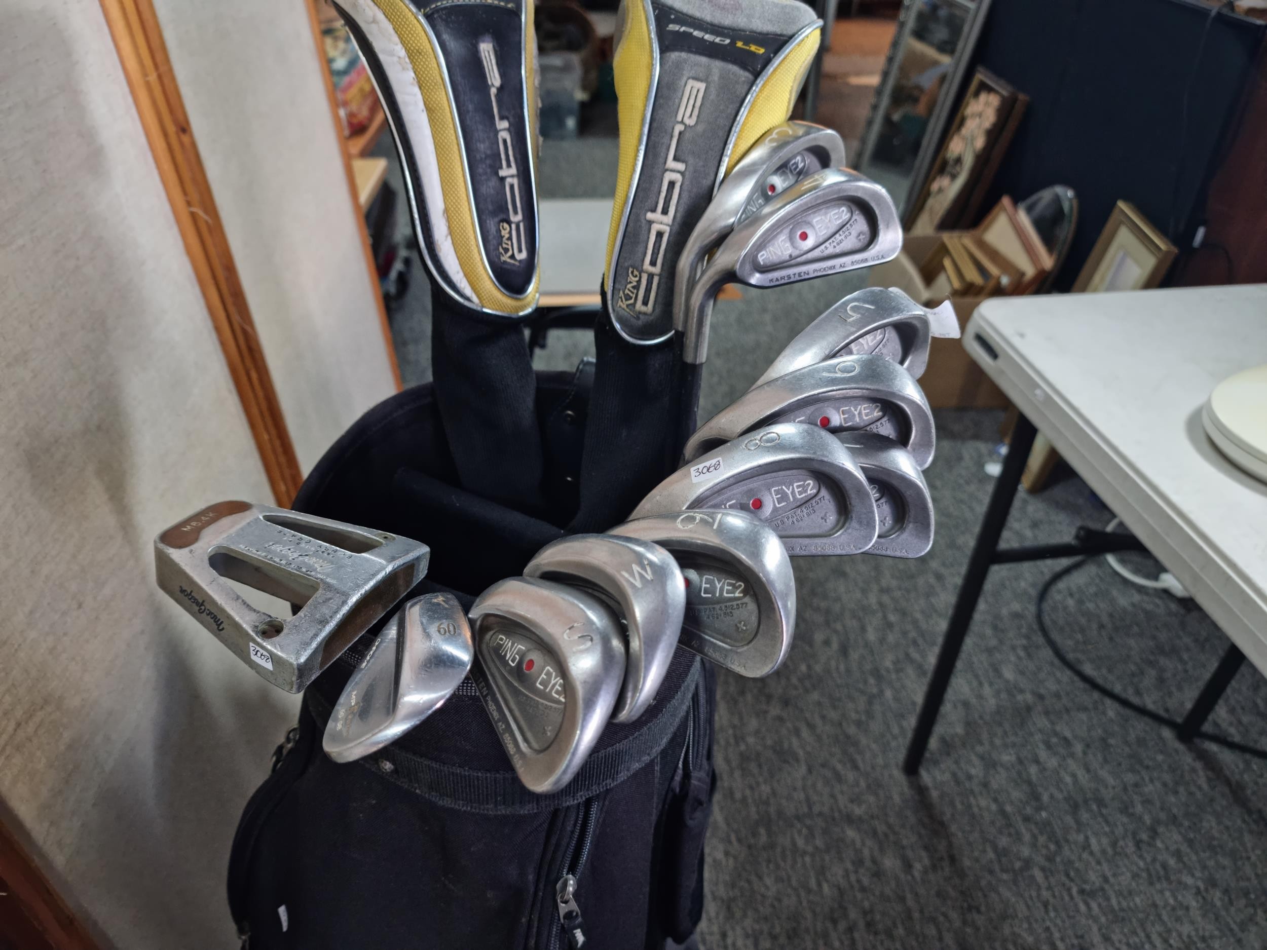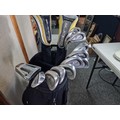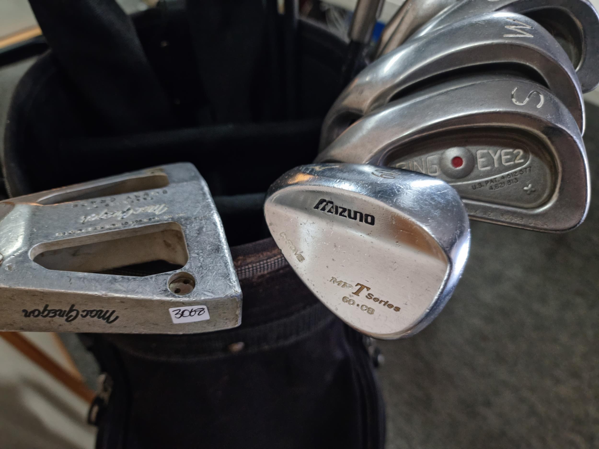 Good quality Left hand set of golf clubs to include 9 ping eye 2 irons with graphite shafts numbered 3 to sand wedge, graphite shaft Mizuno 60 degree wedge, Macgregor putter m6.4k, 2x woods to include a cobra 3 & 5 woods with graphite shafts, all in a Wilson golf bag.