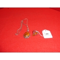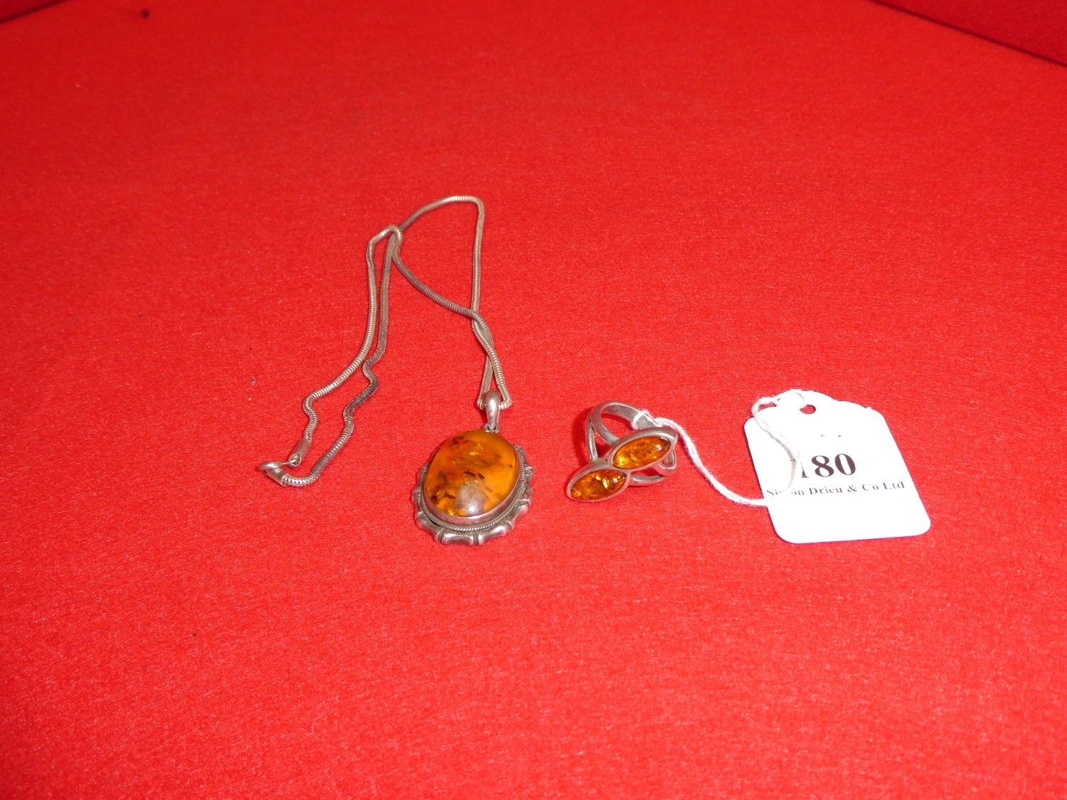 An amber and silver pendant suspended from a silver fox tail chain together with an amber and silver ring (Size R)