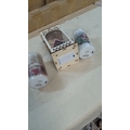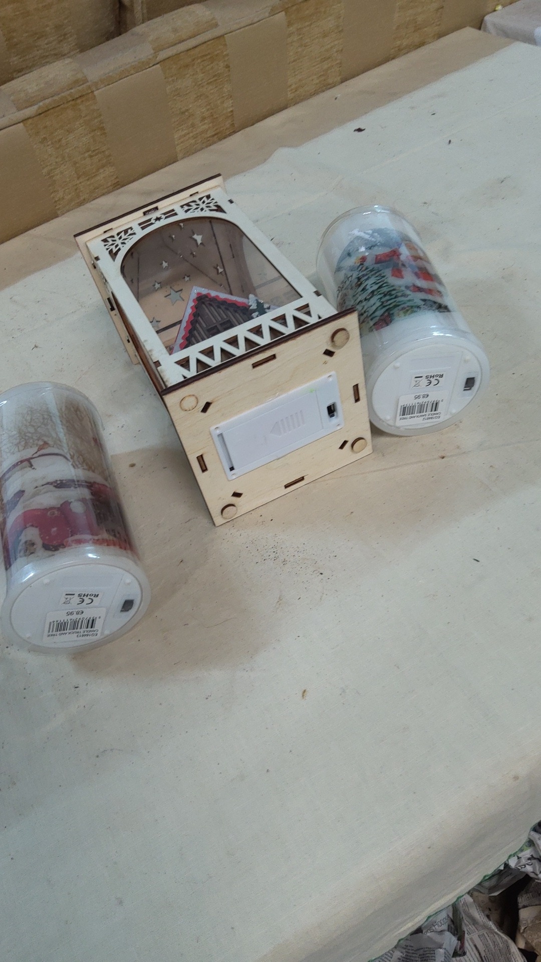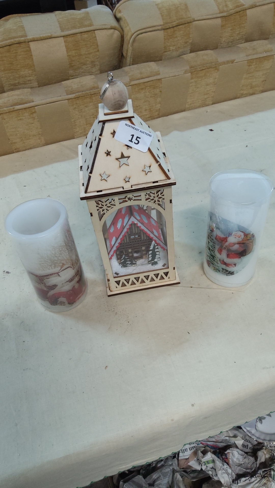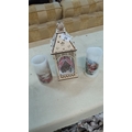 Group of three battery-operated Christmas decorations comprising a laser-cut lantern with chalet scene and two cylindrical LED pillar candles printed with winter motifs.