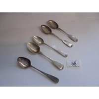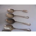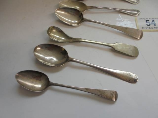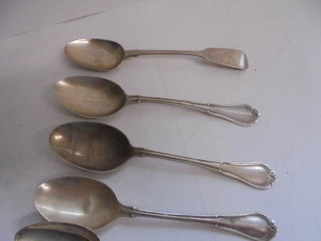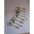 Eight assorted spoons including seven silver spoons, total weight 110 grams.