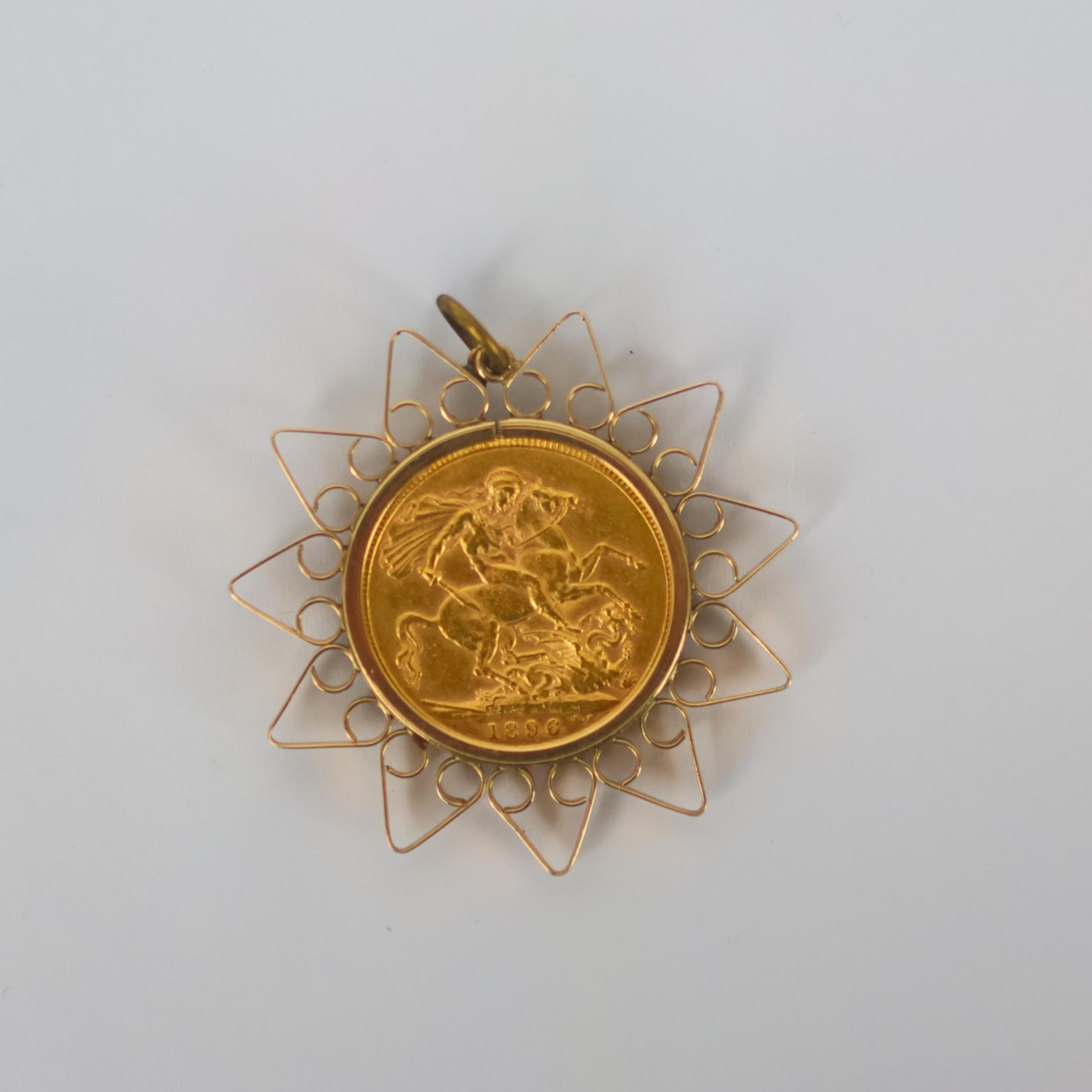 Victoria (1837-1901) full sovereign, dated 1896, within a yellow metal pendant mount, marked '9ct' gross weight 11gms