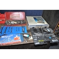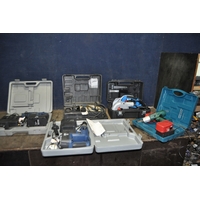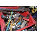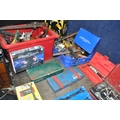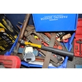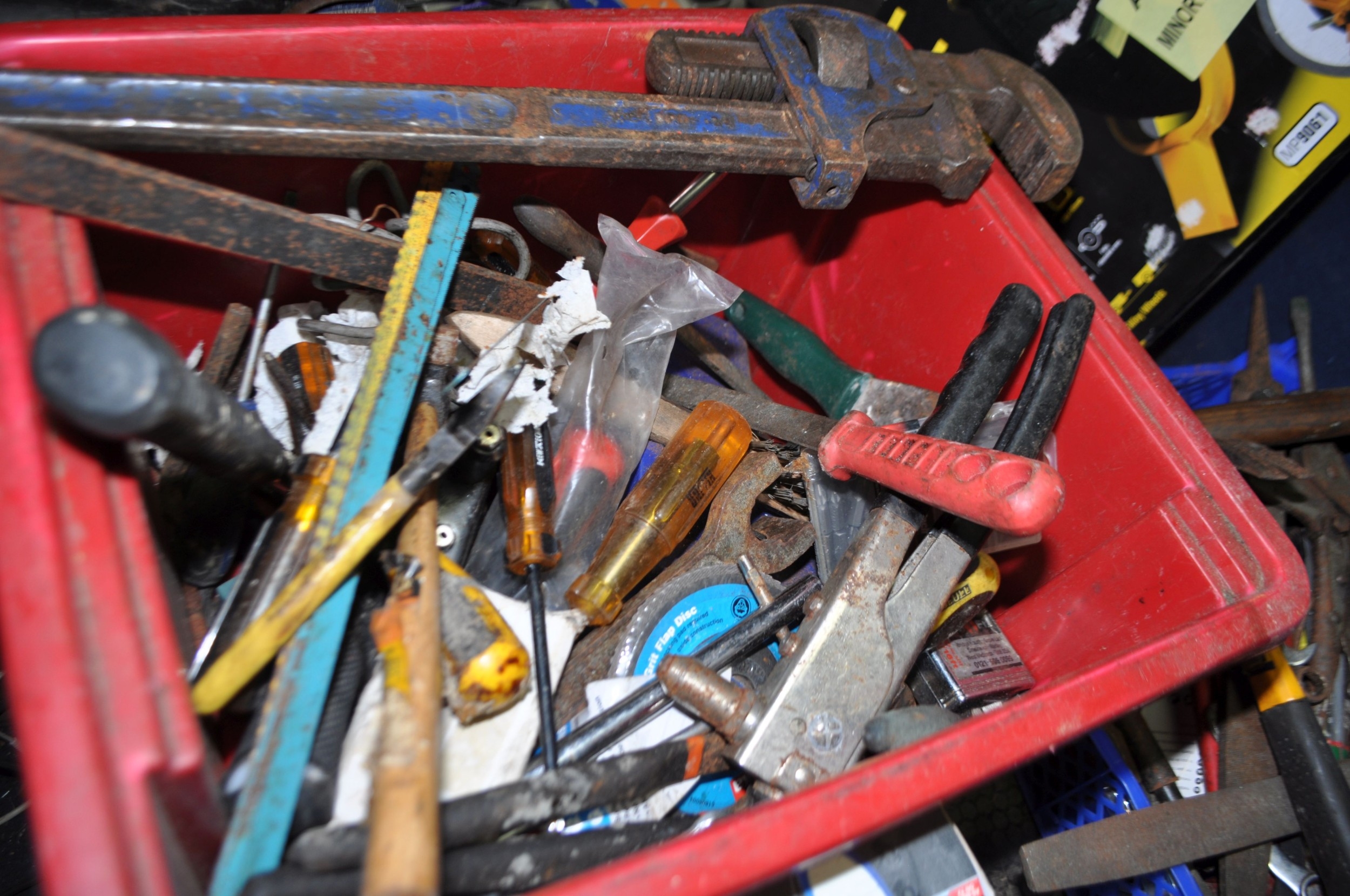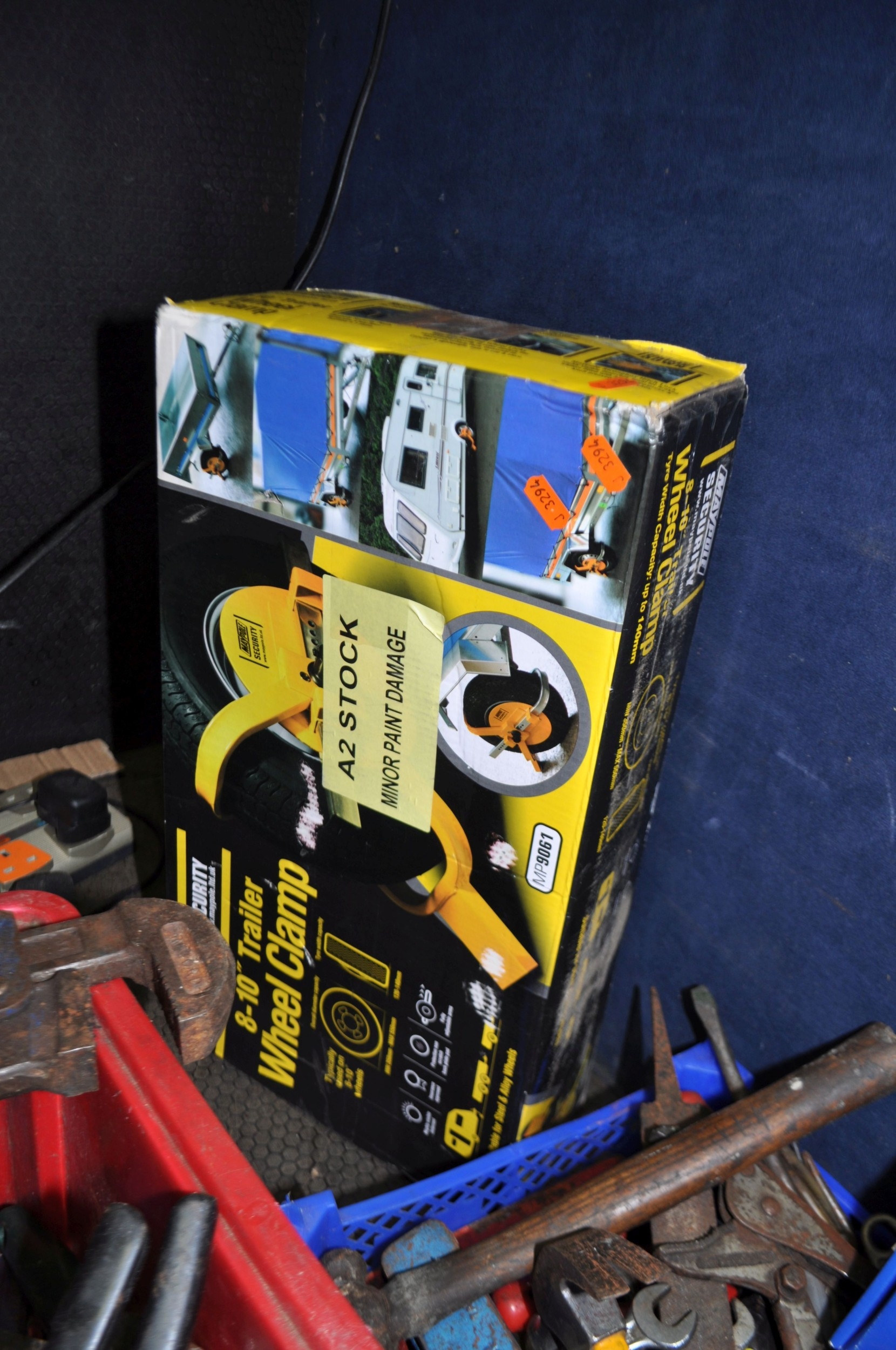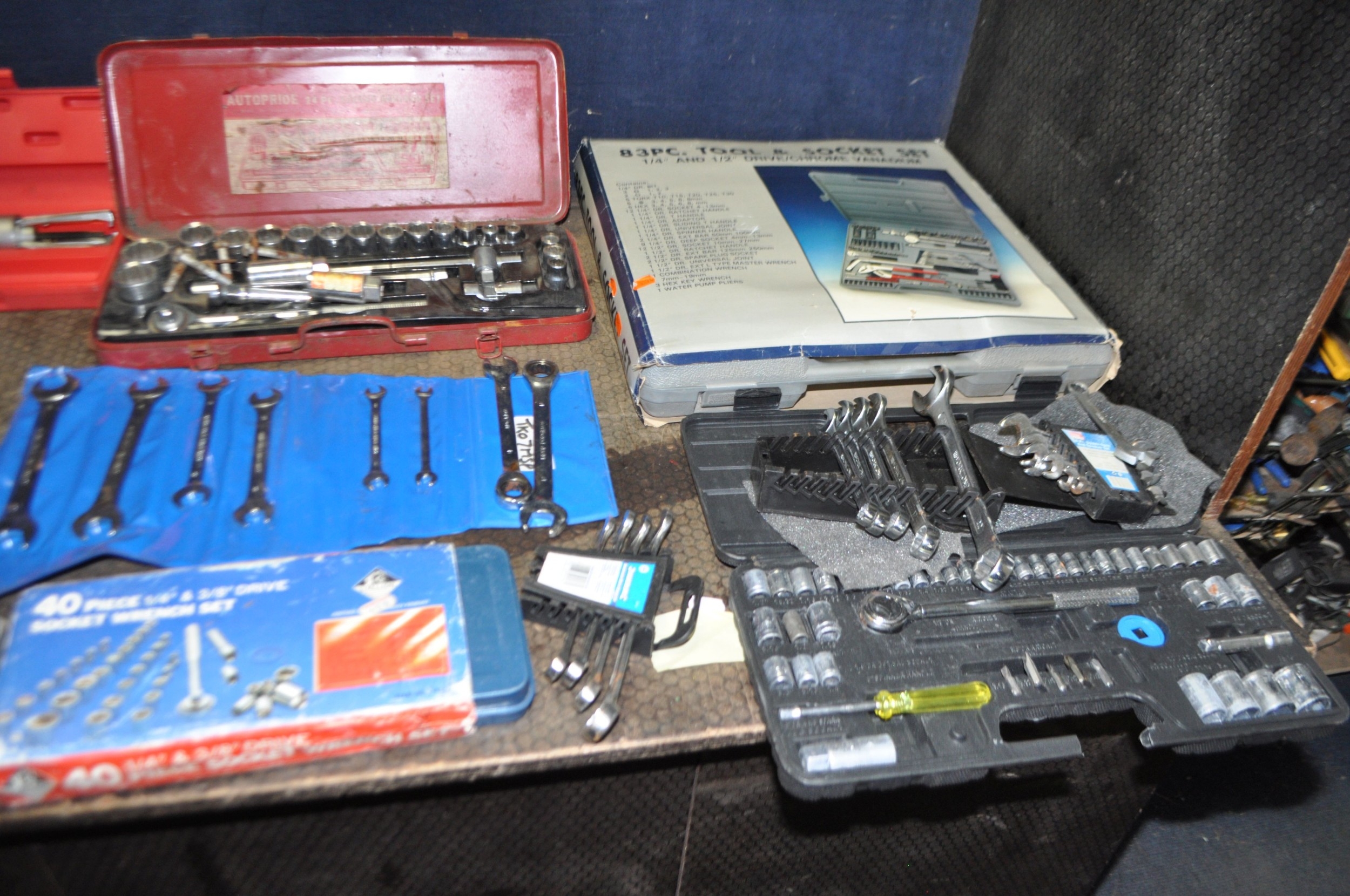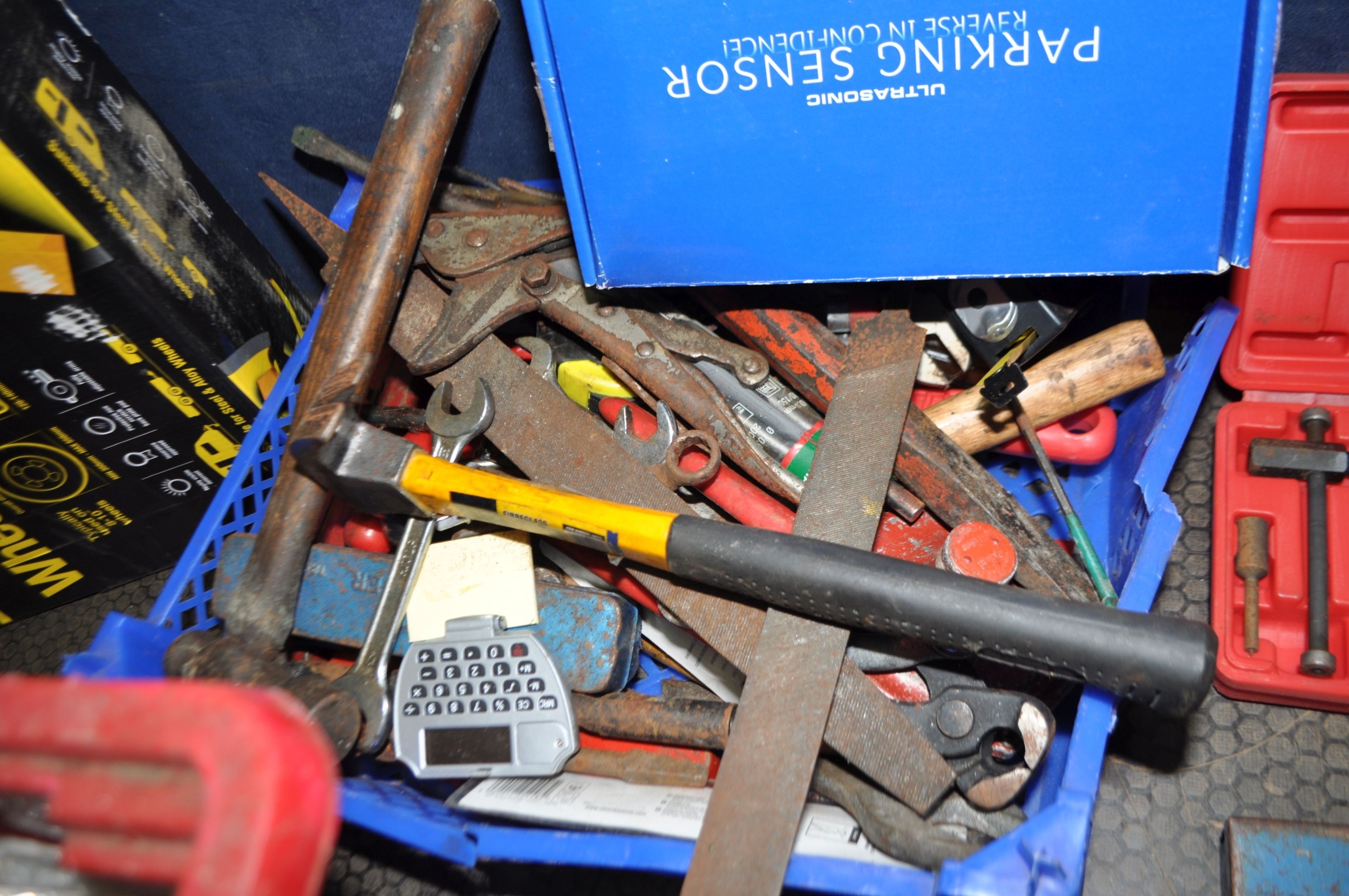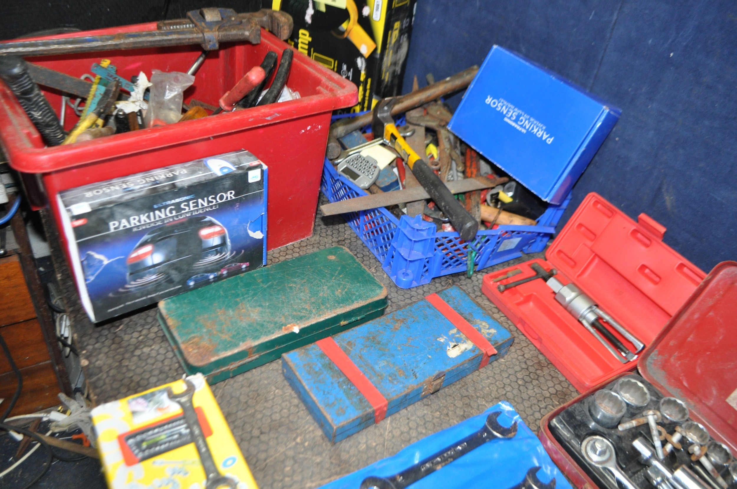 A COLLECTION OF AUTOMOTIVE TOOLS including socket sets, spanners, a Record 24 stilson, a bearing puller, a trailer wheel clamp etc