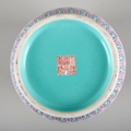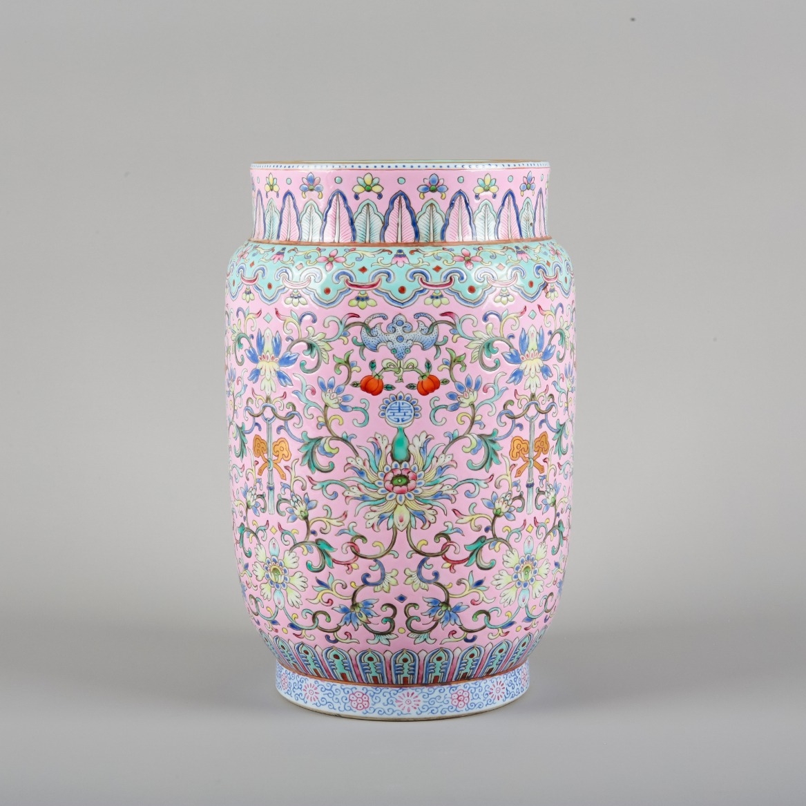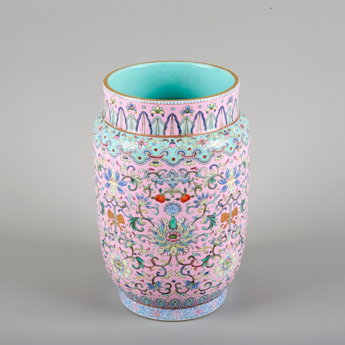bearing six character Daoguang seal mark to the base, the body decorated with lotus flowers, shou characters and bats carrying peaches, the shoulders adorned with a turquoise-ground band of ruyi heads, 23cm high x 14.5cm wide
