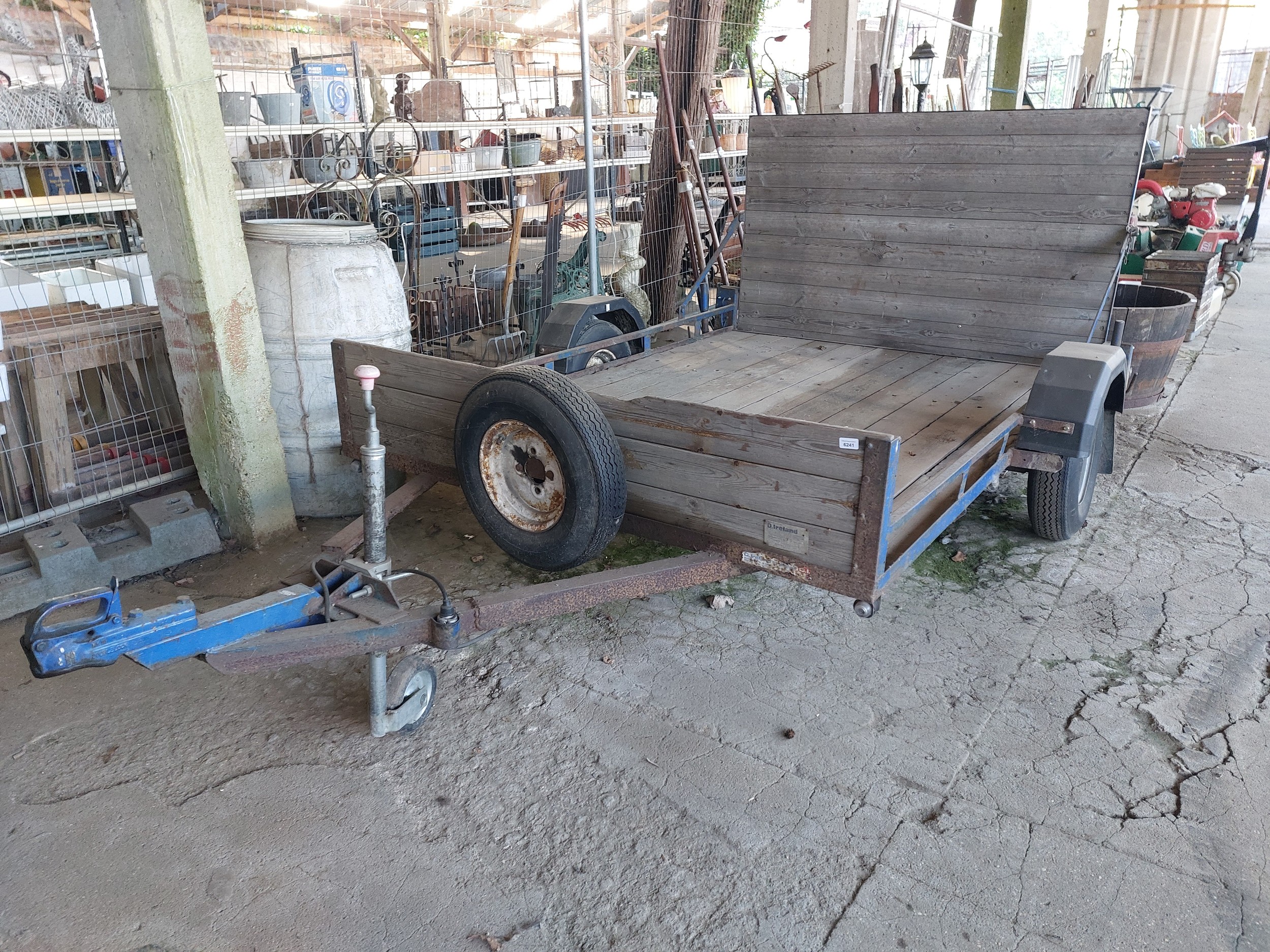 A METAL FRAME LOW LOADING ( D. IRELAND) TRAILER WITH SPARE WHEEL, MUDGUARDS AND SECURING BRACKETS. REAR STANDS. 240CM X 167CM FLOOR SPACE. 102CM REAR TAIL GATE.