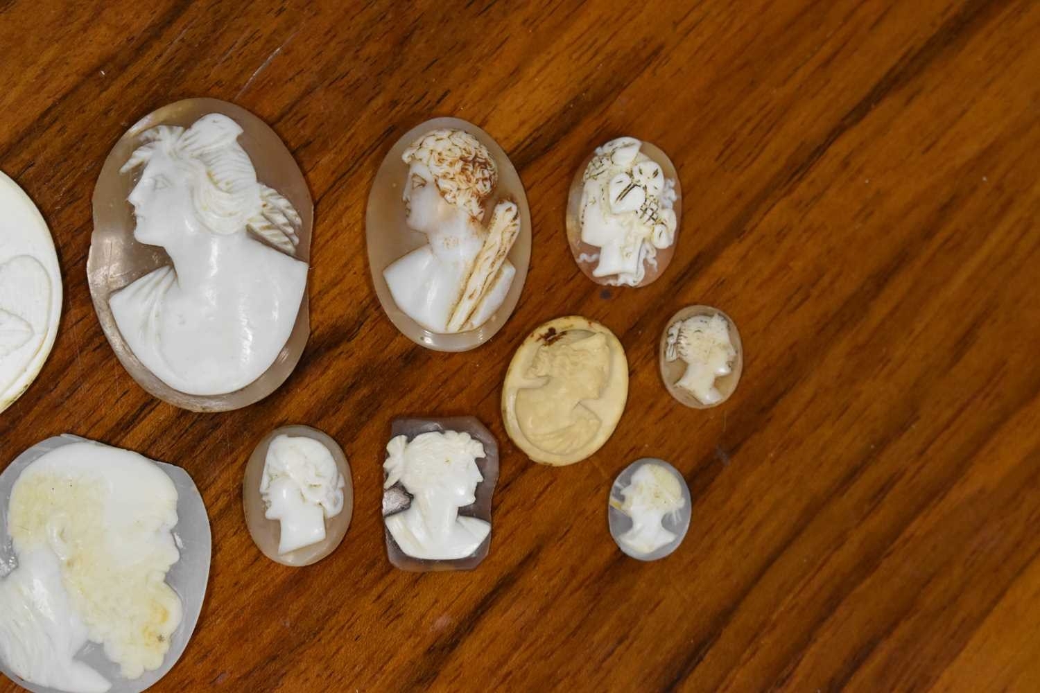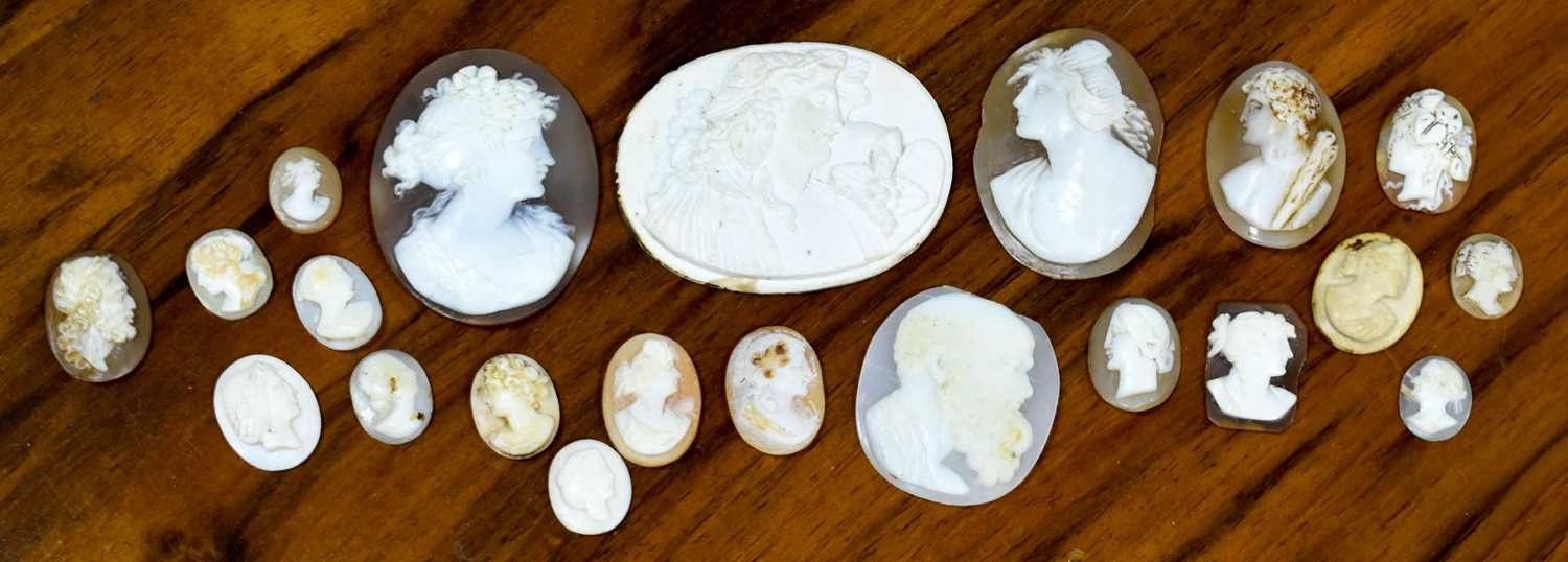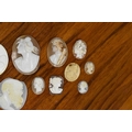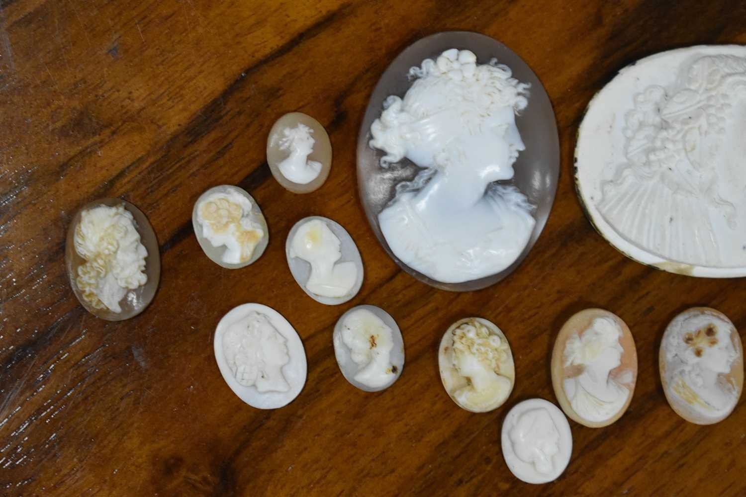 A selection of early 19th century and later unmounted cameos, including one lava stone cameo, each depicting profile portraits, mostly female examples, and one plasterwork example depicting Bacchus 4 by 5cm.