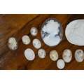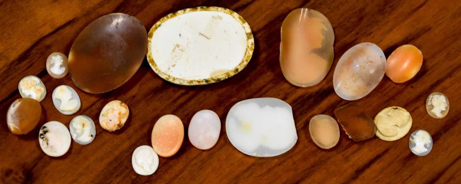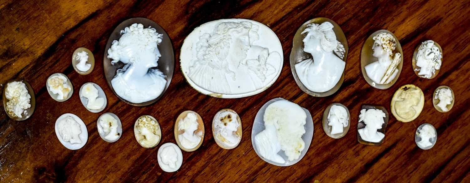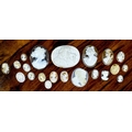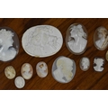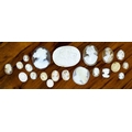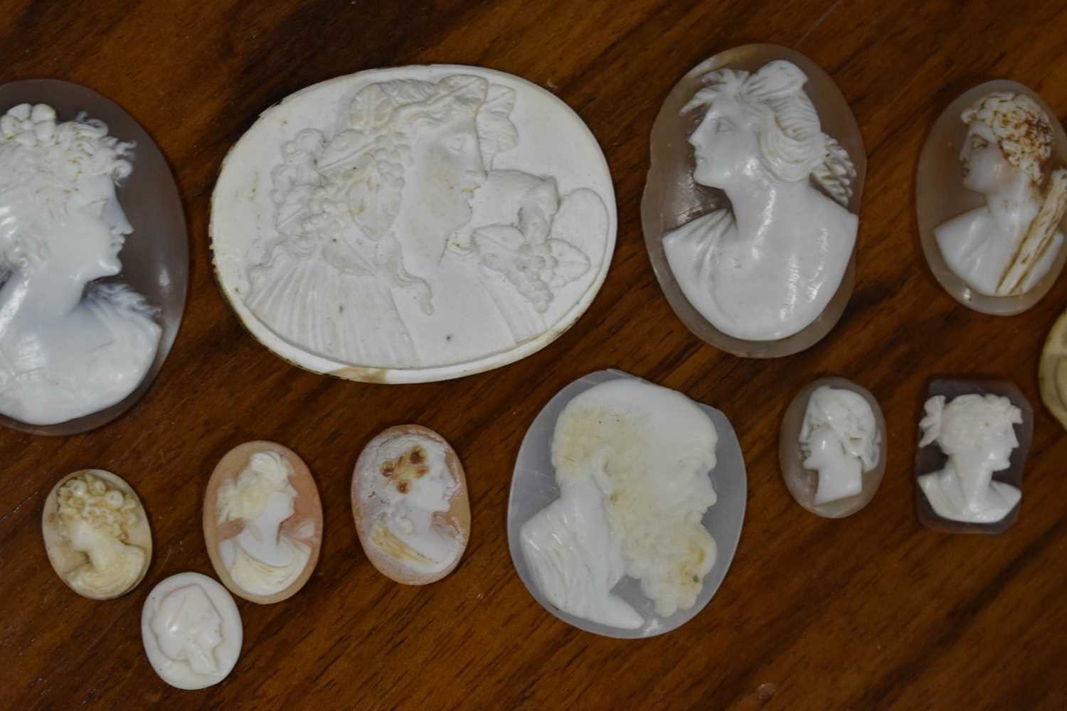 A selection of early 19th century and later unmounted cameos, including one lava stone cameo, each depicting profile portraits, mostly female examples, and one plasterwork example depicting Bacchus 4 by 5cm.