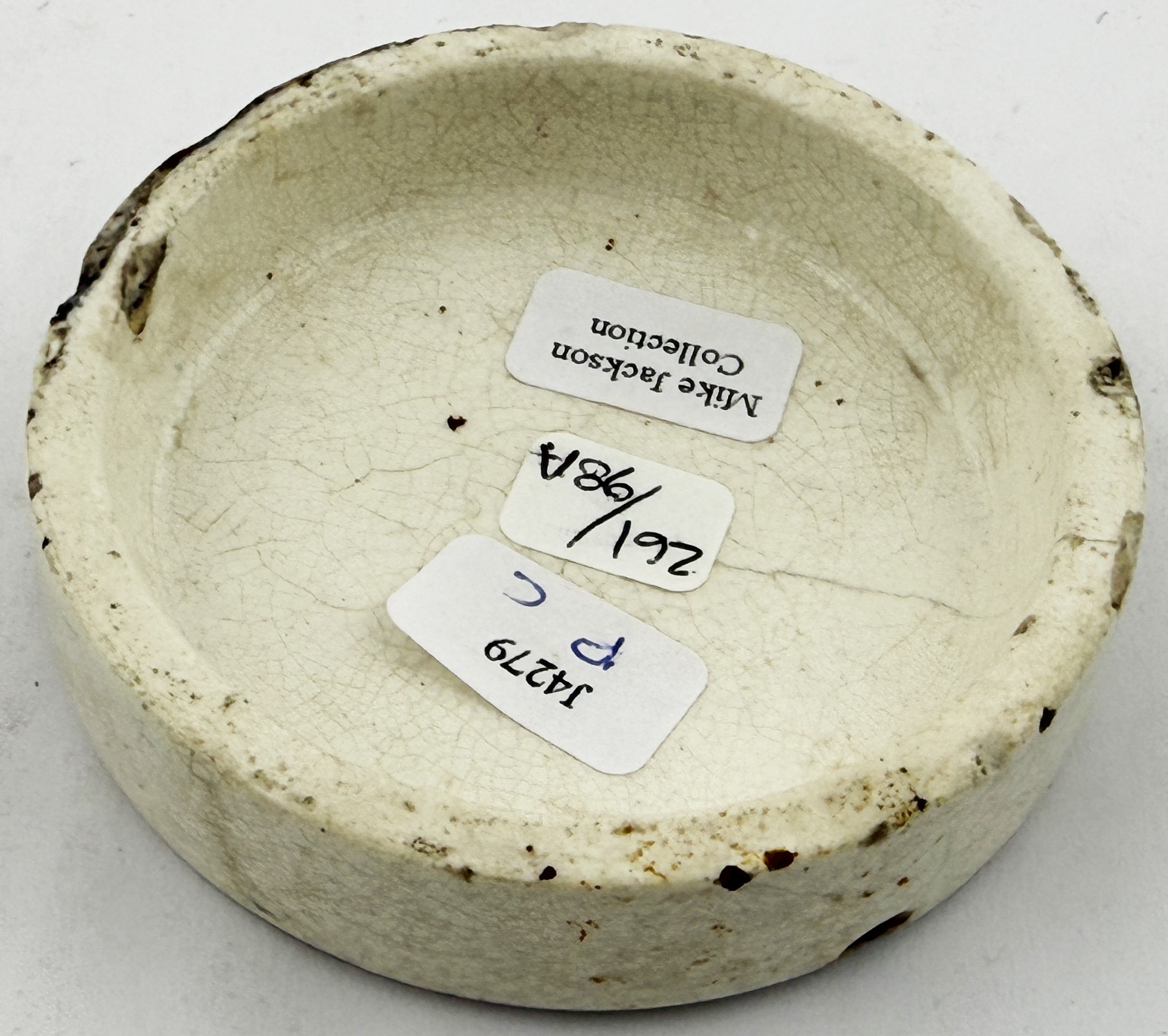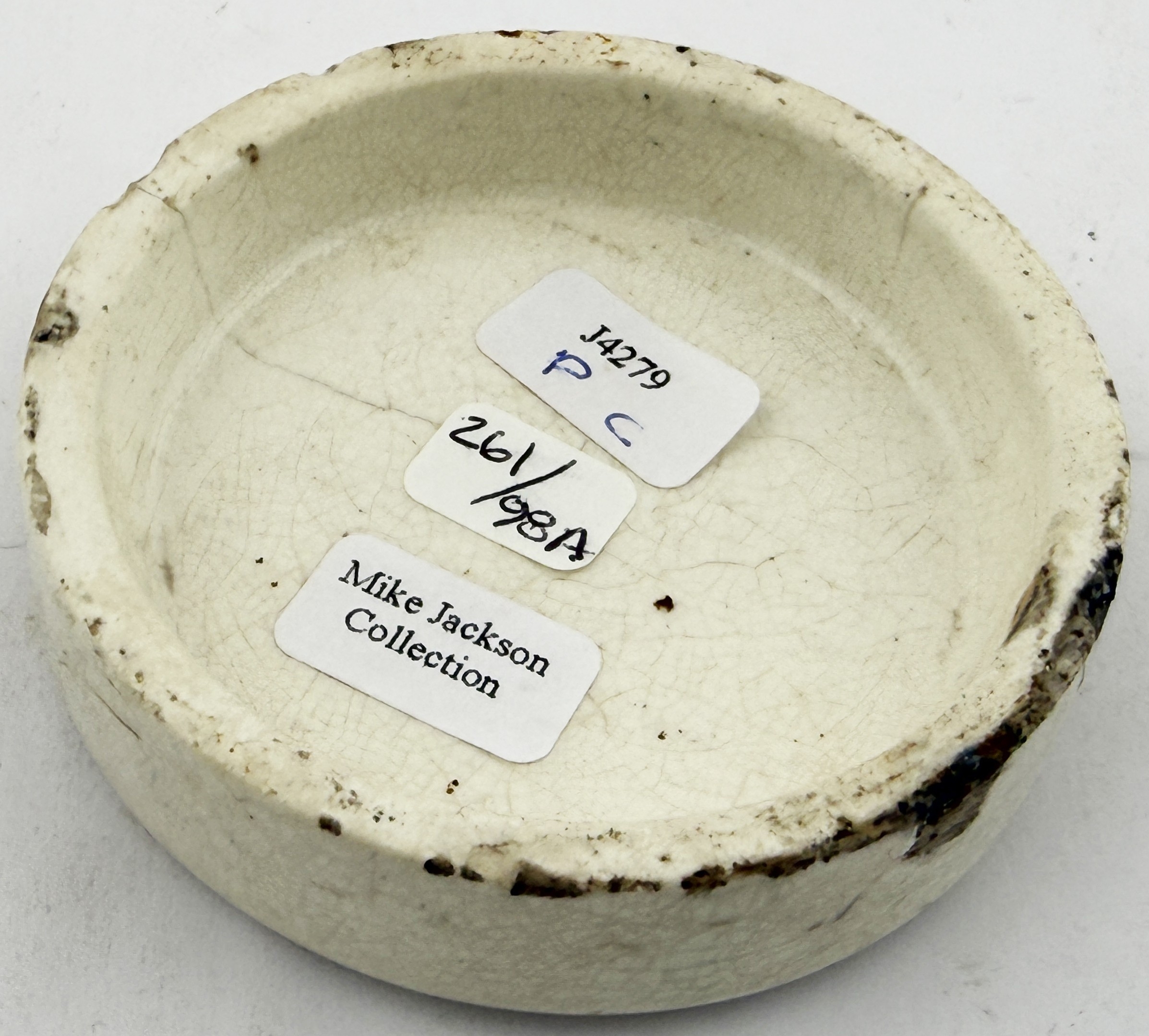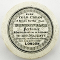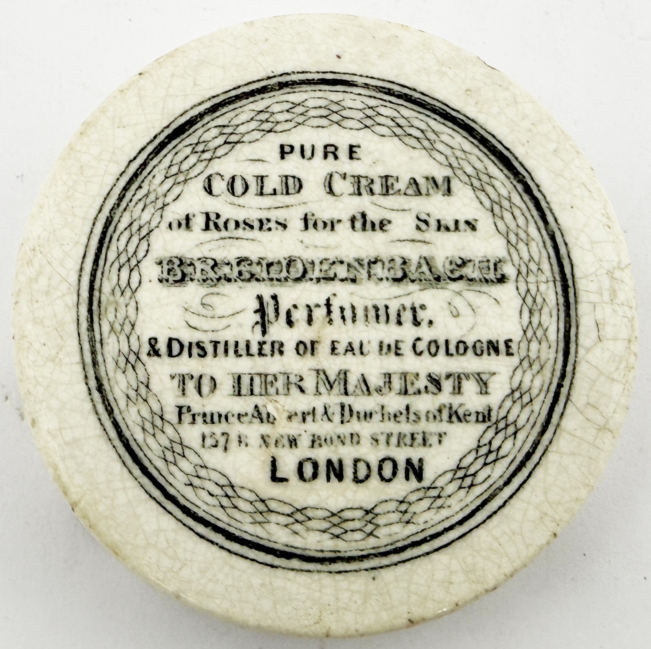 EARLY LONDON COLD CREAM LID. APL p216, 98. 2.5ins. Early & desirable BREIDENBACH lid. The smallest of 3 sizes recorded. Flange flakes, scratch over the L B of ALBERT & hairline at 3 o clock. All par for the course with such a rare & early lid. Mike Jackson collection.