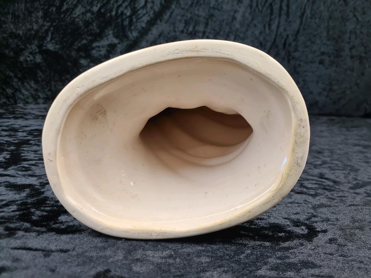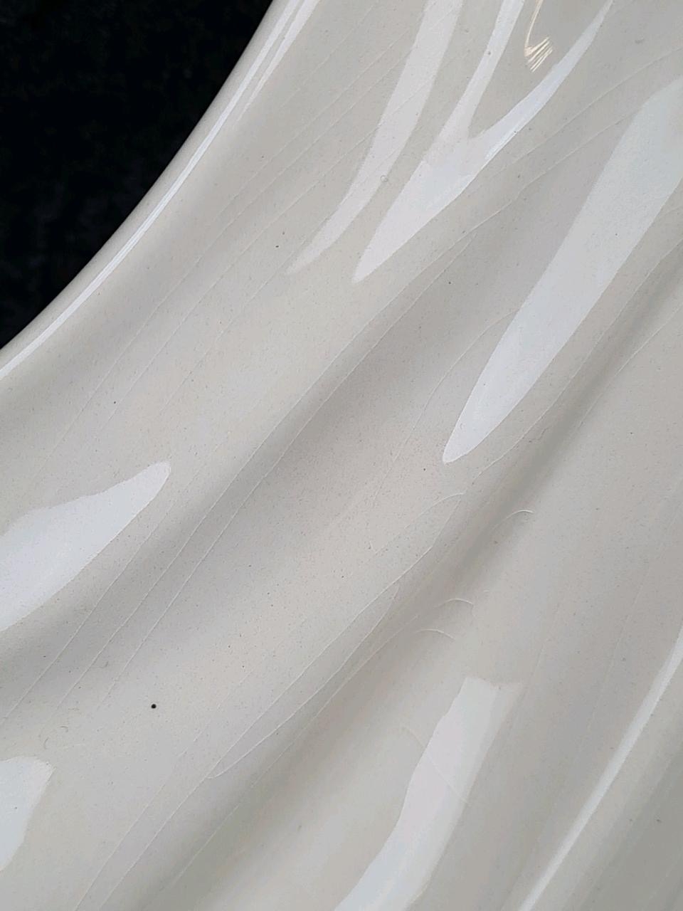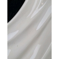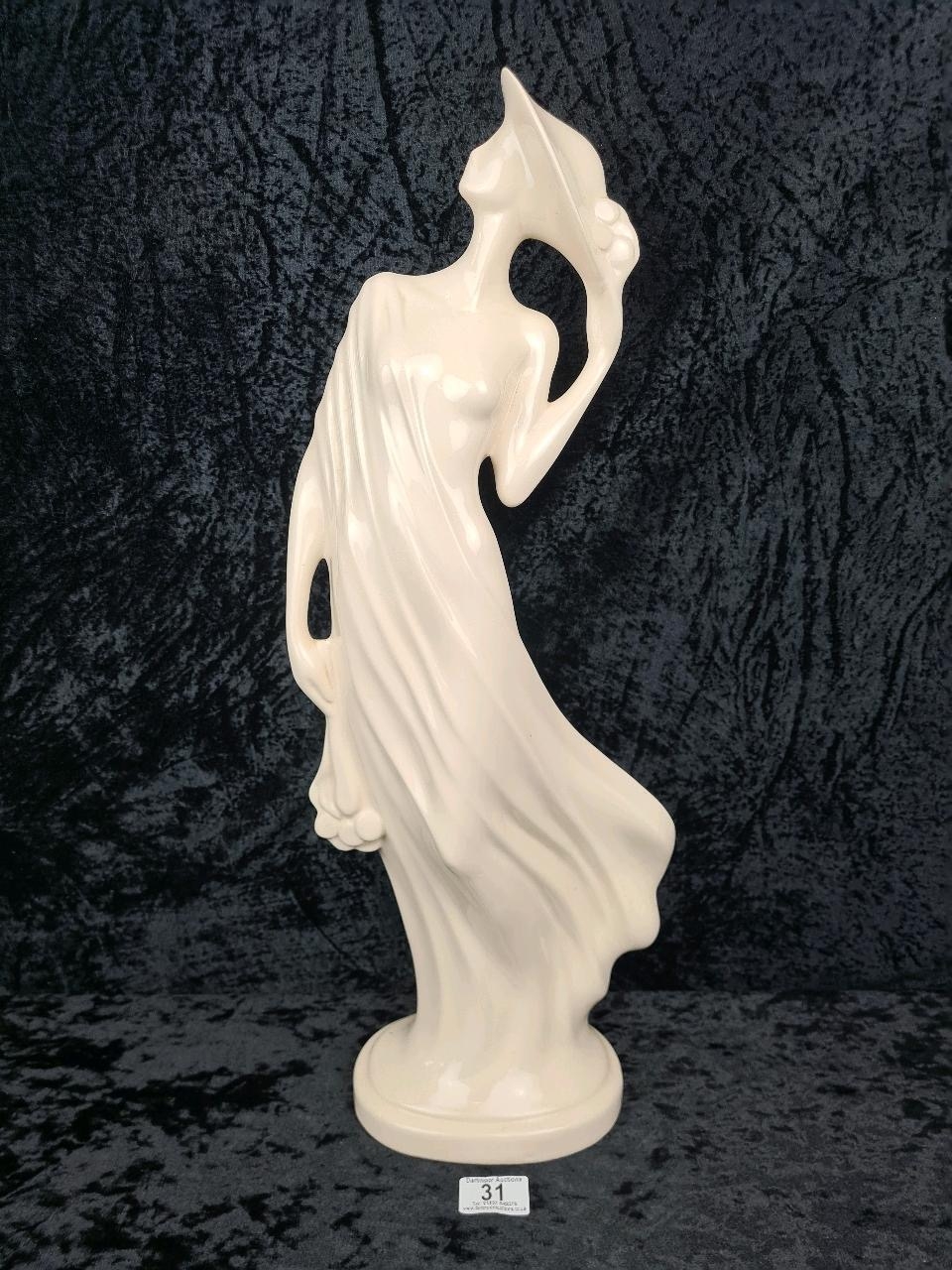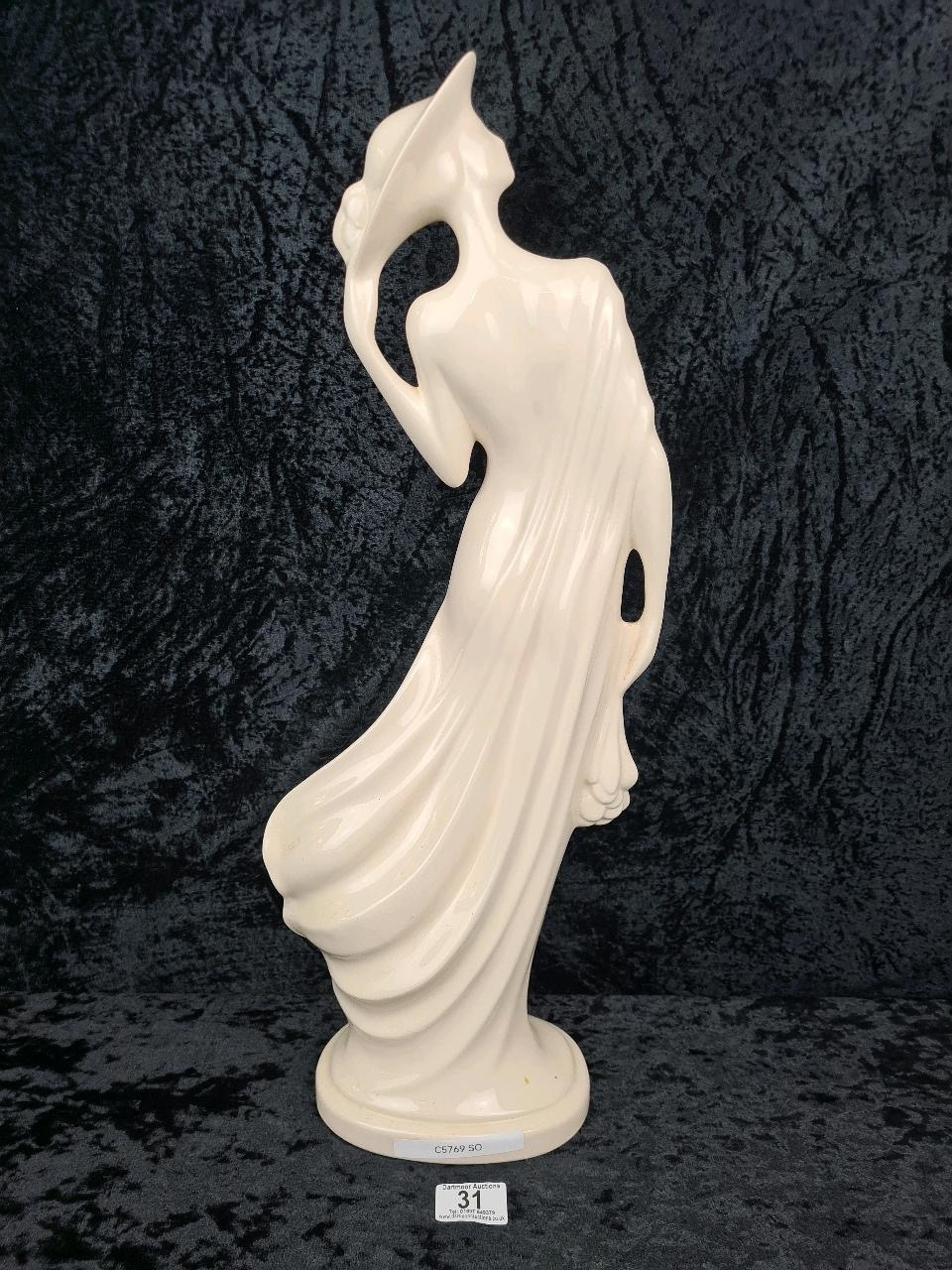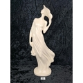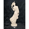 Tall, white glazed ceramic figurine of a woman wearing a flowing dress and holding her hat. Approx H58cm.