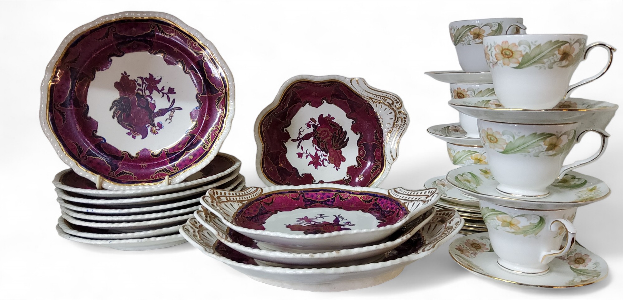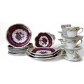 A Copeland & Garrett Late Spode's Imperial part dessert service, in puce and maroon, picked out in gilt, comprising three graduated serving dishes, shell handles, another, shaped circular, eight plates, printed marks; a Duchess tea service, for six, printed marks