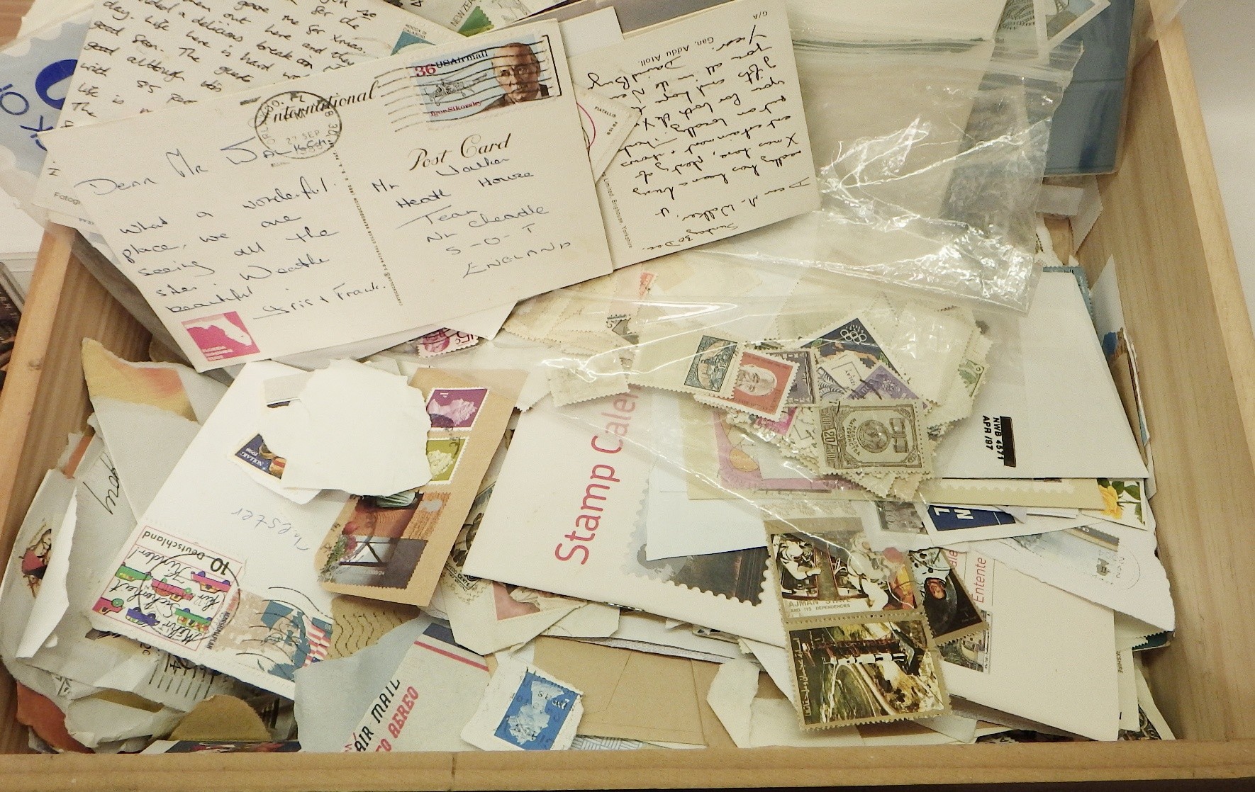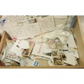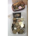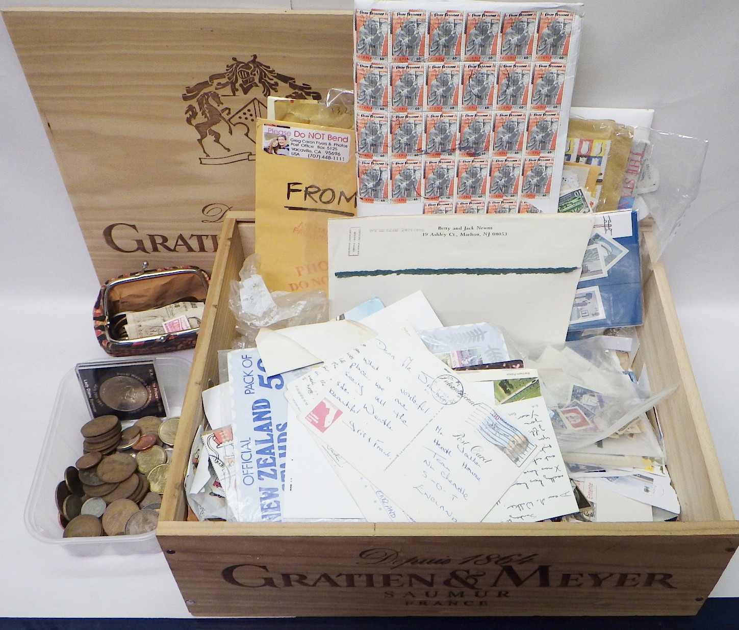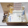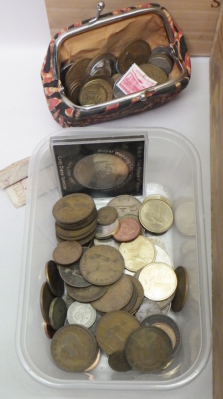 A collection of coins incl British copper issues; postage stamps, most loose kiloware presented in a wooden wine box